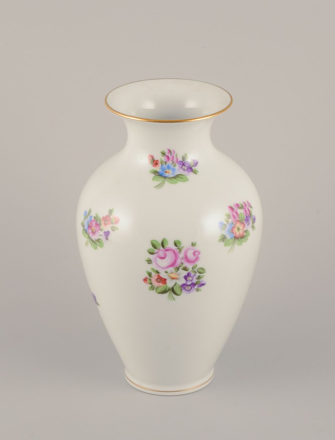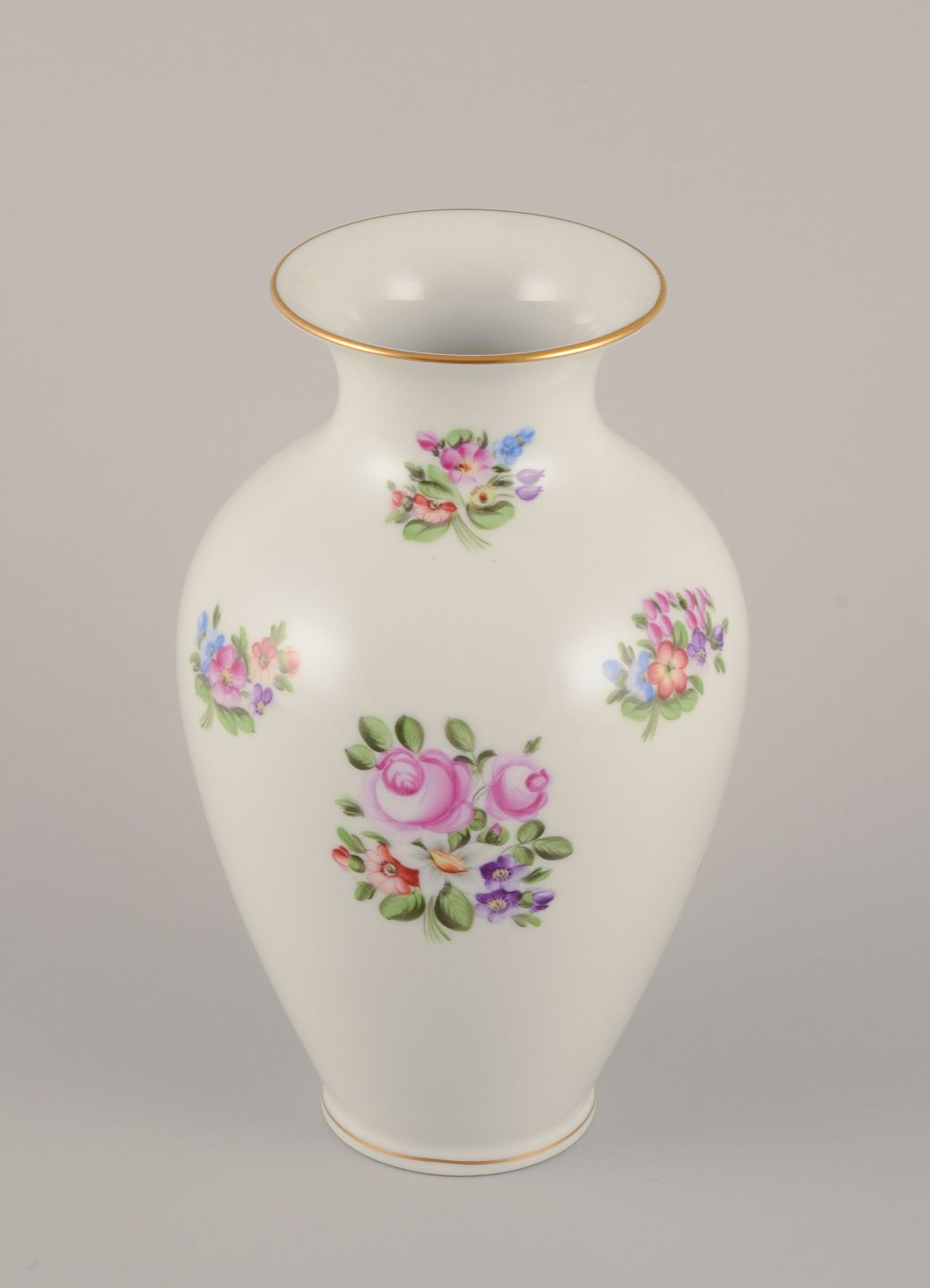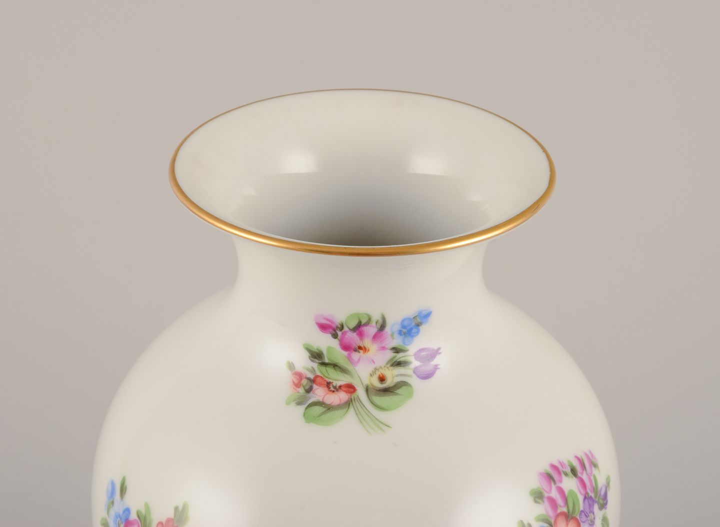 Herend, Ungarn. Stor porcelænsvase håndmalet med polykrome blomstermotiver og guldkant. Midt 1900-tallet. Stemplet. Perfekt stand. Mål: H 23,0 cm. x D 13,0 cm.