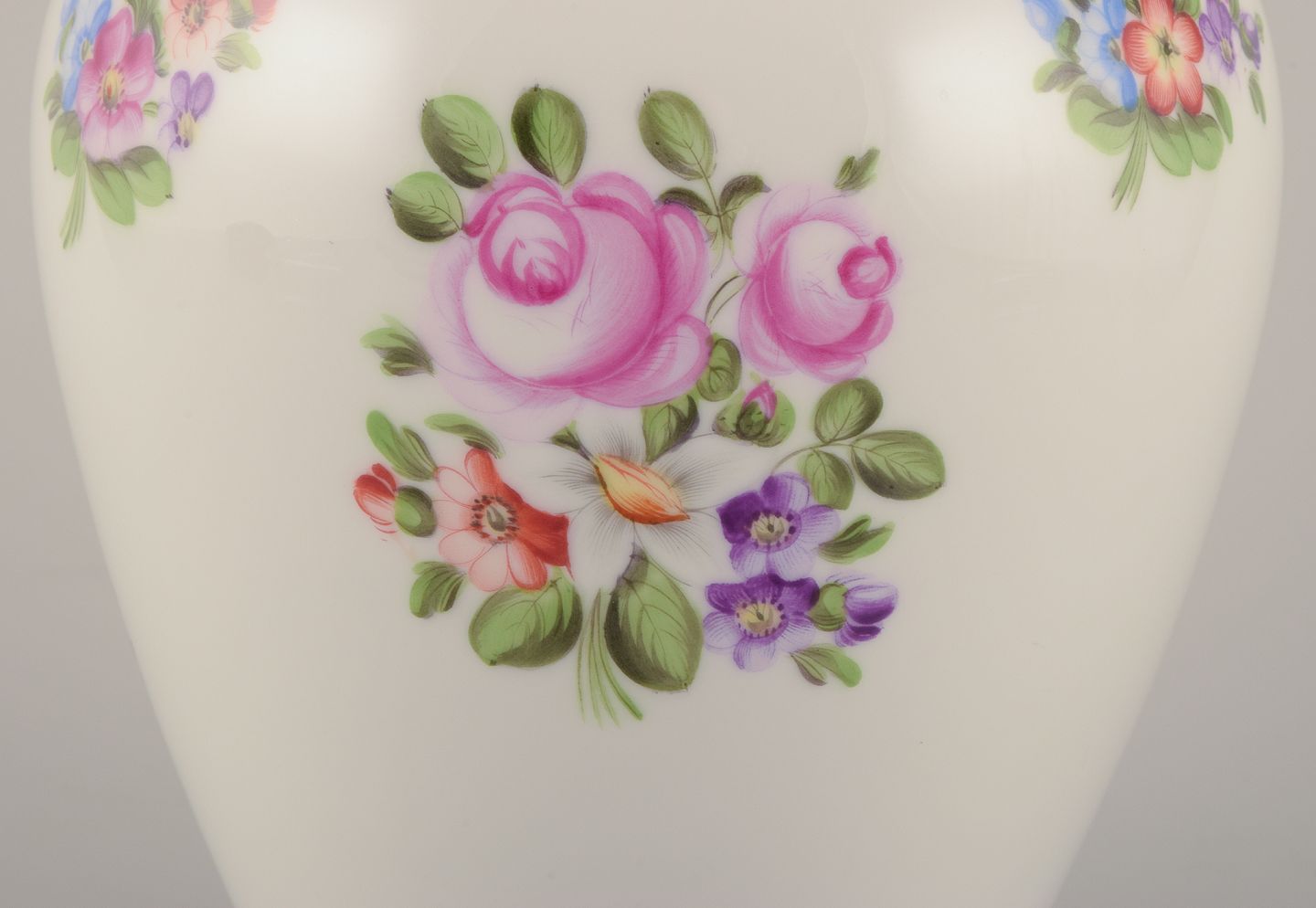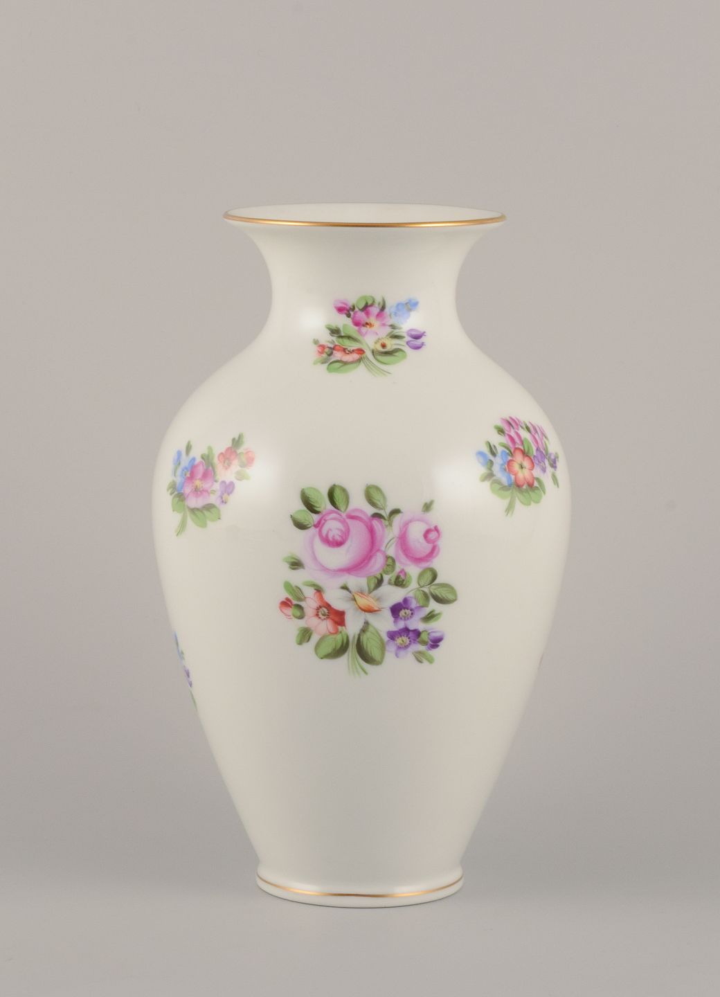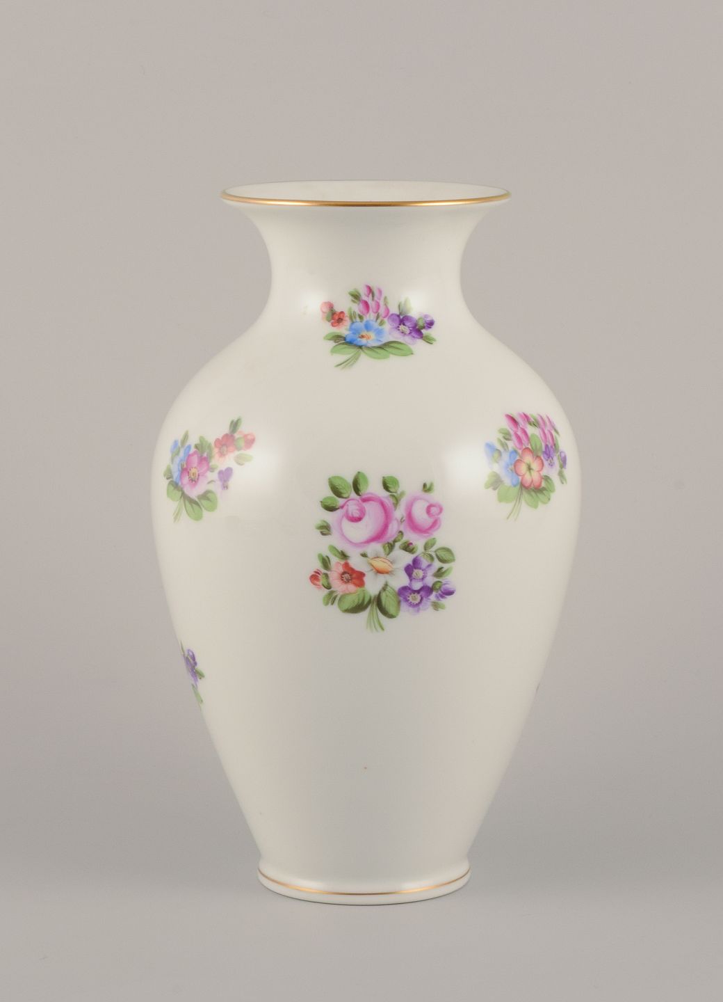 Herend, Ungarn. Stor porcelænsvase håndmalet med polykrome blomstermotiver og guldkant. Midt 1900-tallet. Stemplet. Perfekt stand. Mål: H 23,0 cm. x D 13,0 cm.
