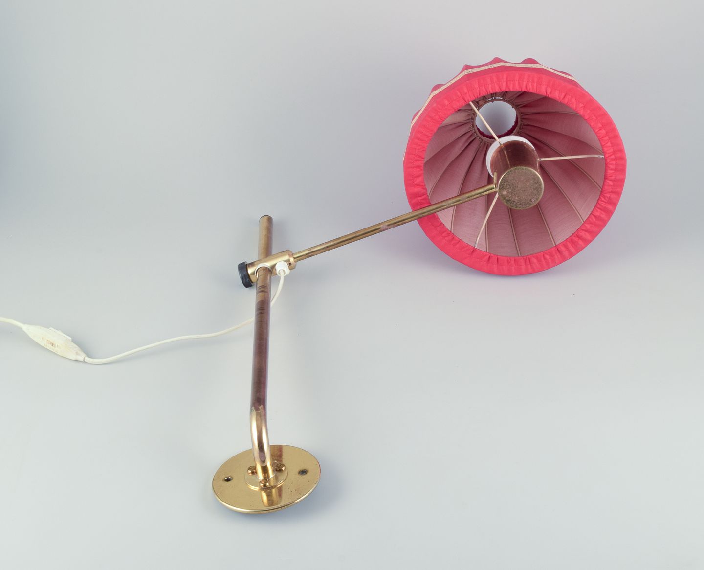 Hans Agne Jakobsson, svensk designer. Væglampe i messing med lampeskærm i rødt stof. Modernistisk design.
