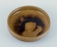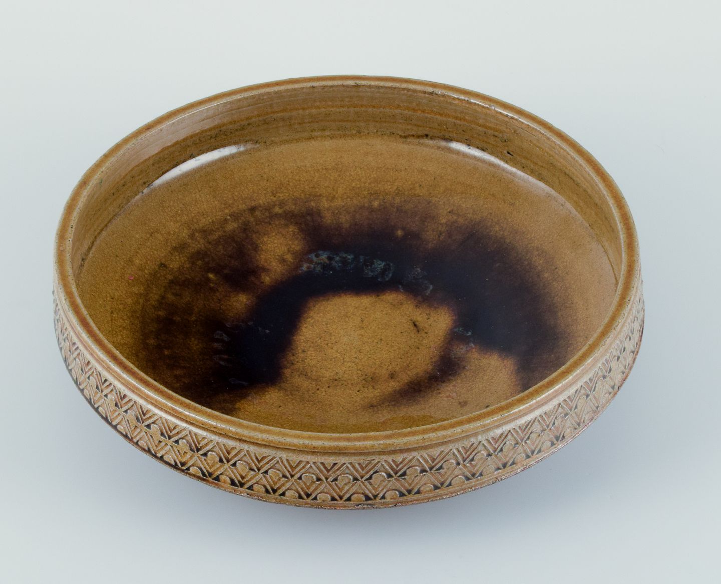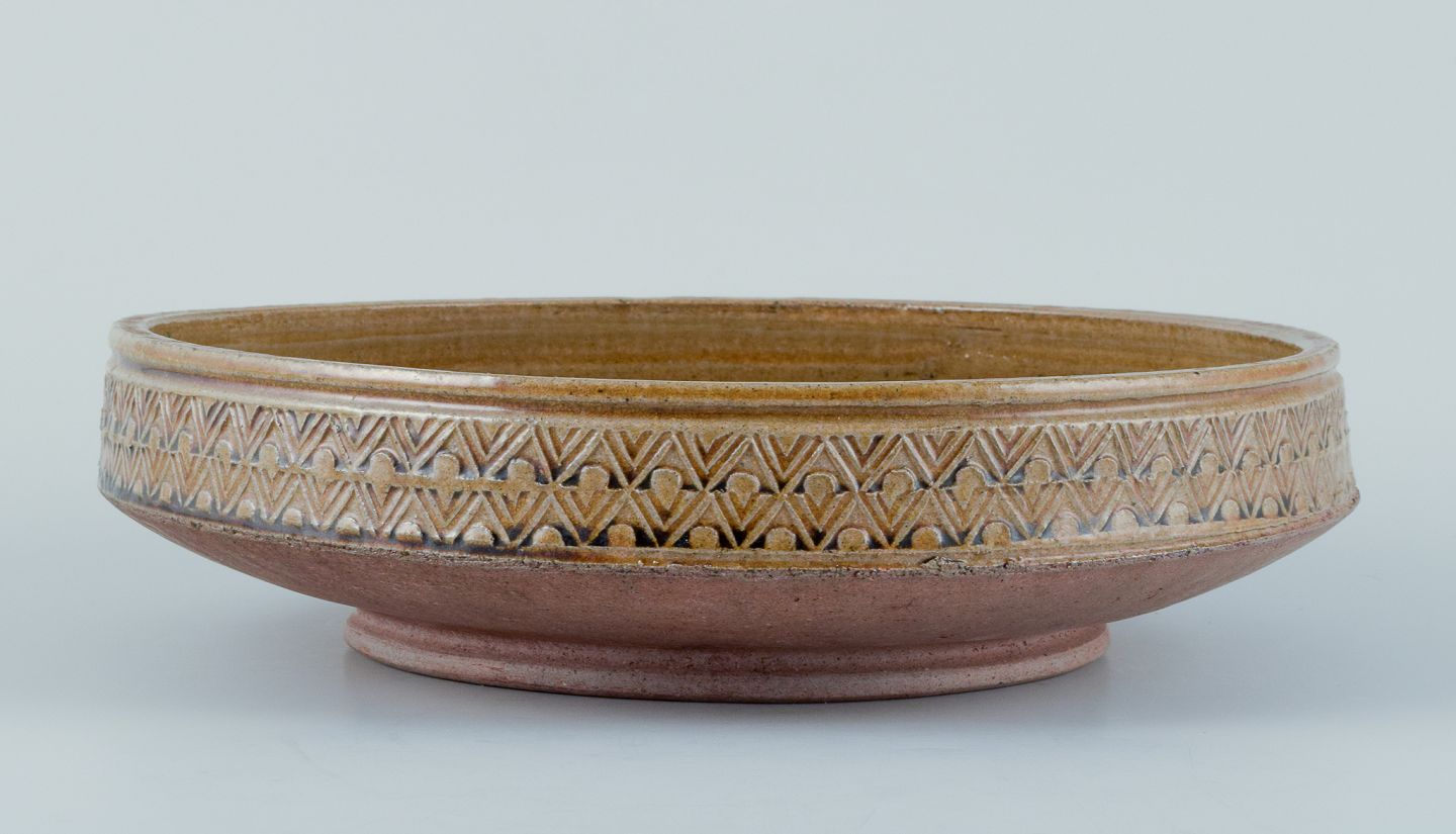 Nils Kähler for Kähler. Stor keramikskål i modernistisk design. Urangul glasur. Geometrisk mønster. Ca. 1970. I perfekt stand med naturlige krakeleringer. Stemplet. Mål: D 29,0 cm. x H 7,0 cm.