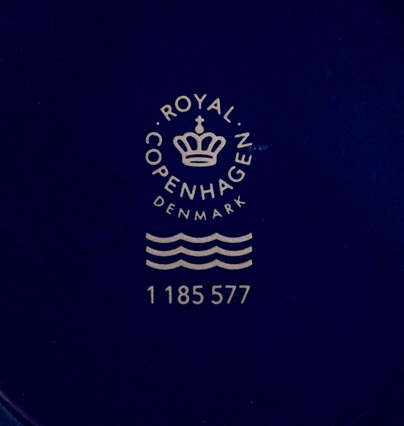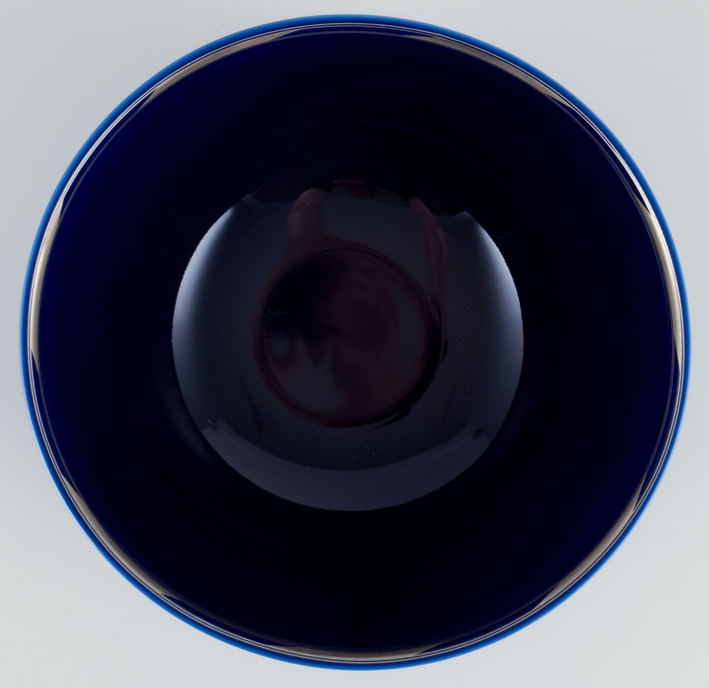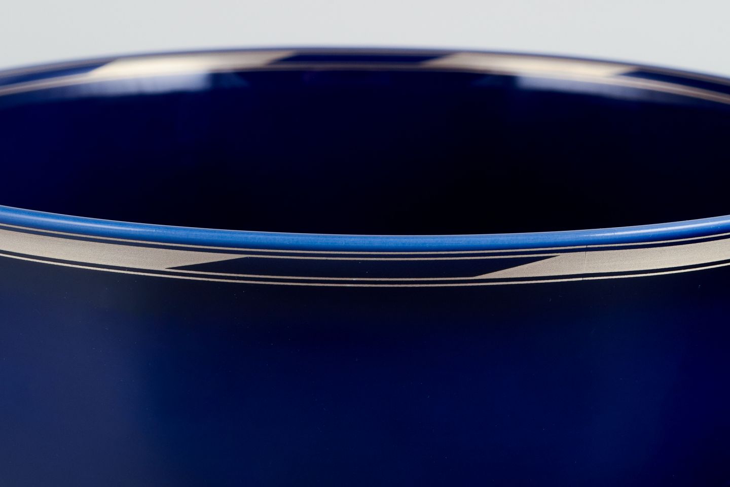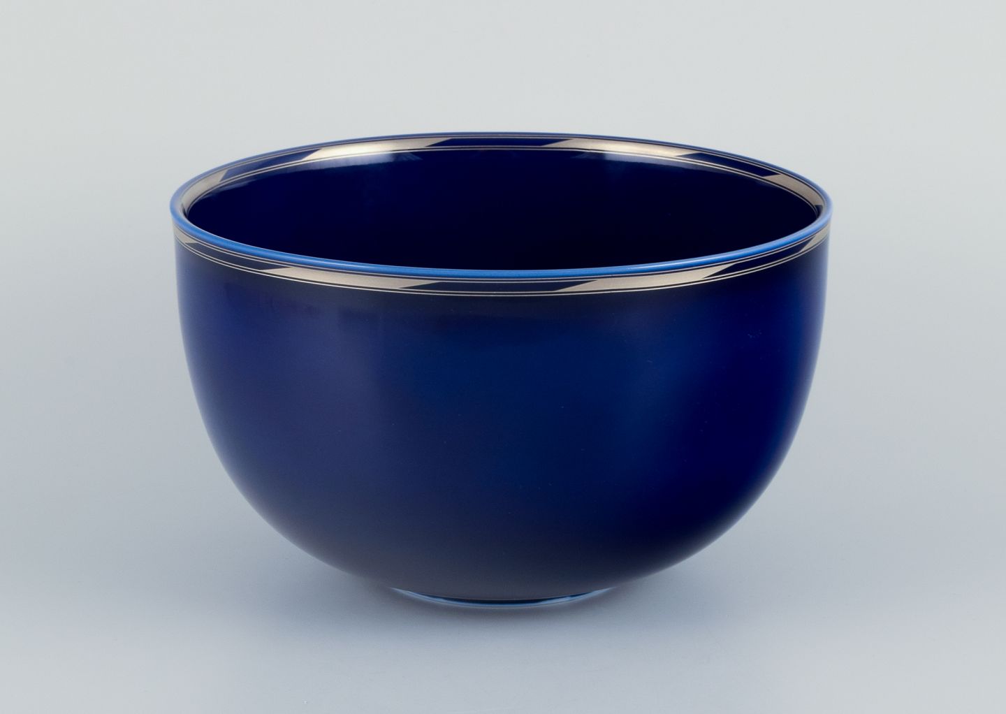 Alev Siesbye for Royal Copenhagen. Stor skål i porcelæn dekoreret med blå glasur og kantdekoreret med bladsølv.