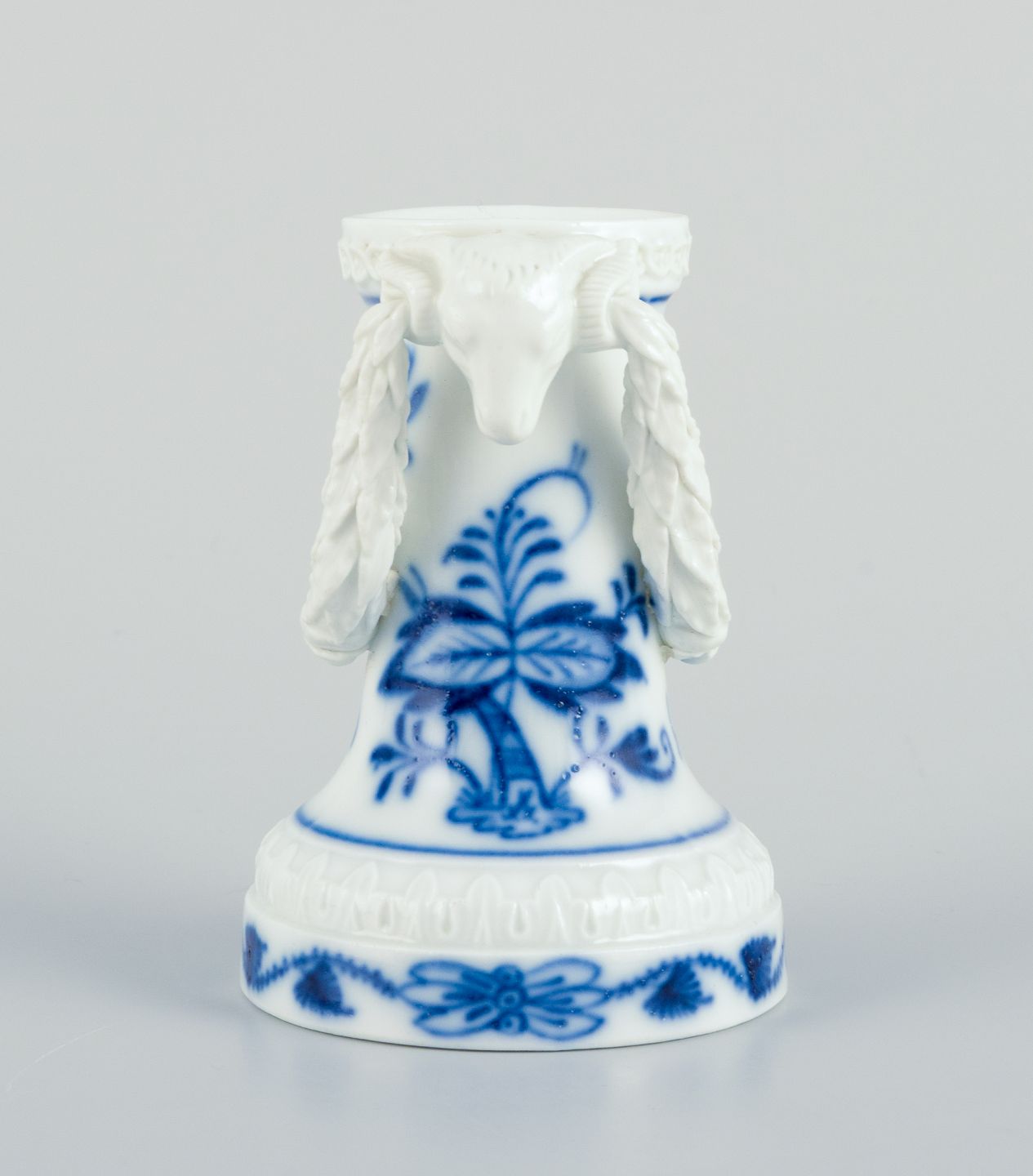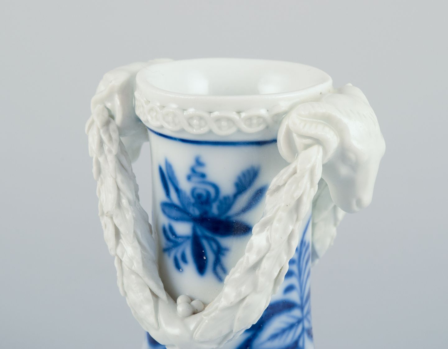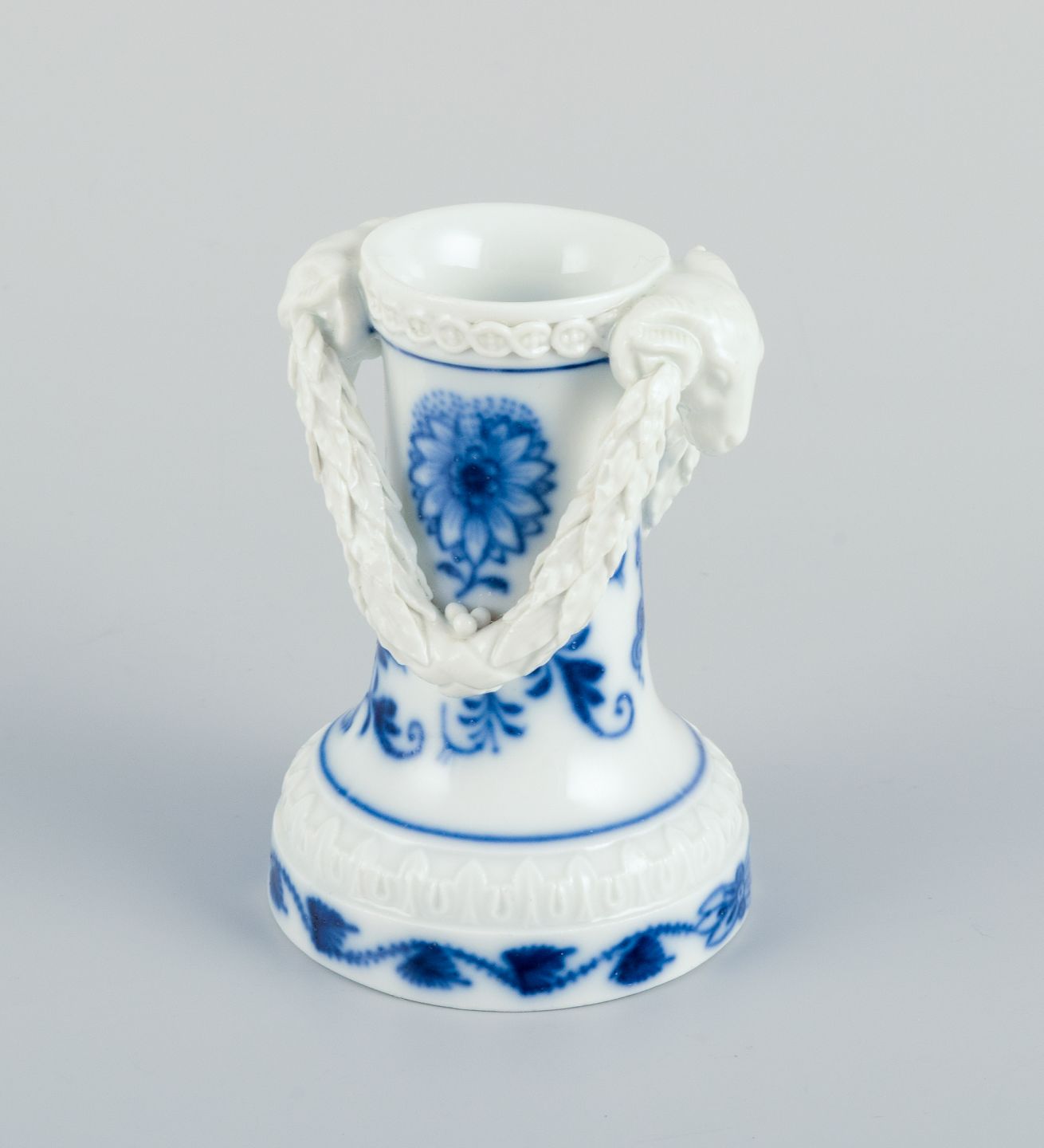 Meissen, Tyskland. Sjælden løgmønstret miniaturevase med vædderhoveder. Tidlig 1900-tallet. Første sortering. Perfekt stand. Stemplet. Mål: H 8,0 cm. x D 5,6 cm.