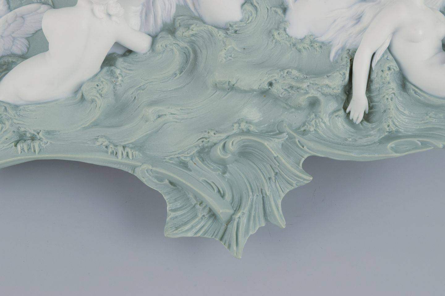 Volkstedt, Tyskland. Stort Art Nouveau vægrelief i biscuit. Motiv af nøgne kvinder i landskab. Ca. 1900. Stemplet. Med ophæng. Perfekt stand. Mål: B 32,0 cm. x H 25,0 cm. x D 3,5 cm.