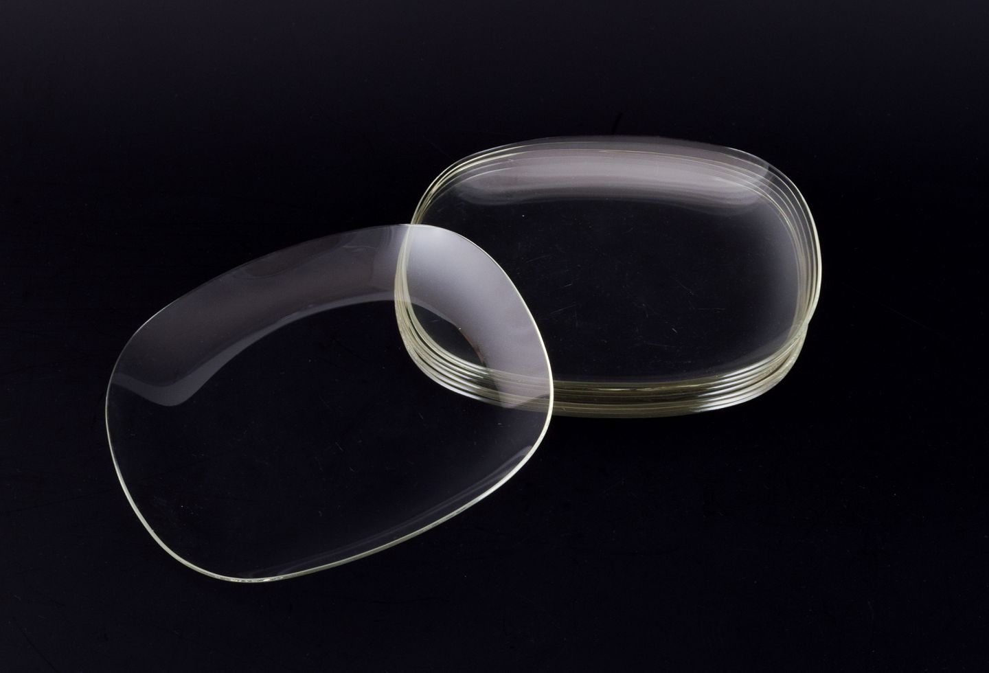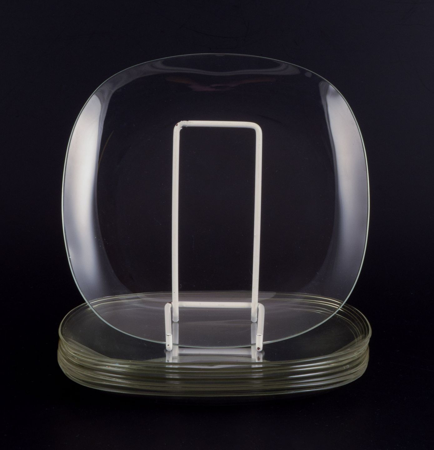 Wilhelm Wagenfeld (1900-1990). Et sæt på otte Bauhaus tallerkner i klart kunstglas. 1930/40’erne. I flot stand med mindre brugspræg. Mål: D 17,5 cm.