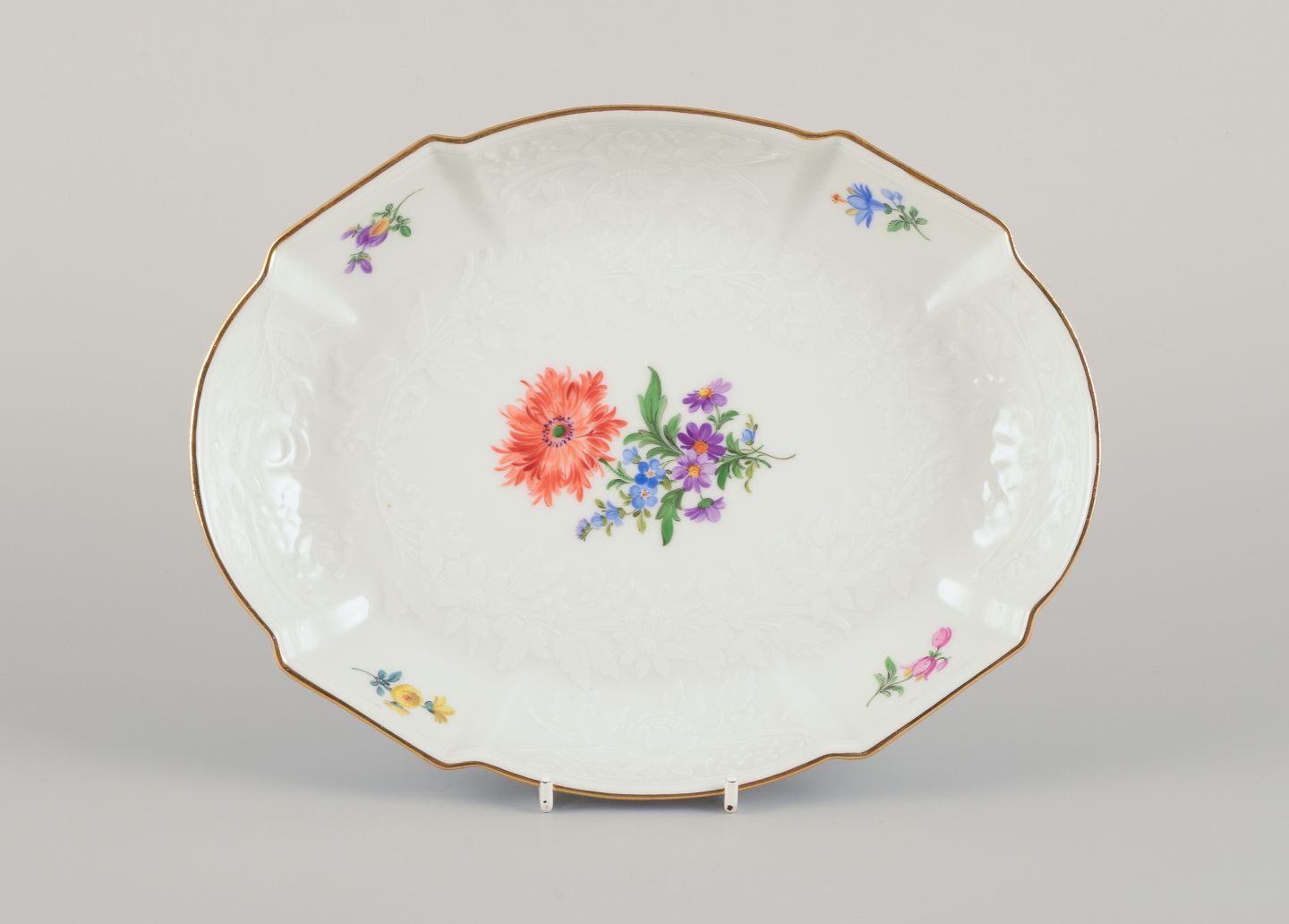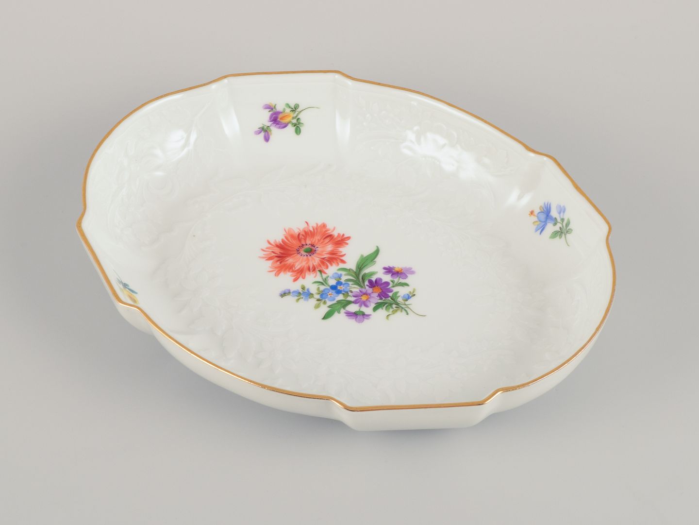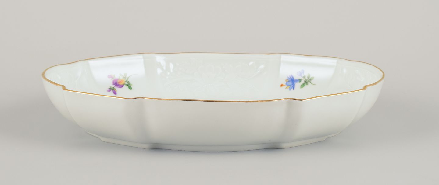 Meissen, Tyskland. Oval porcelænsskål håndmalet med polykrome blomster. Blomsterguirlander i relief. Guldkant. Ca. 1930. Stemplet. Tredje sortering. Perfekt stand. Mål: B 25,0 cm. x D 19,0 cm. x H 4,0 cm