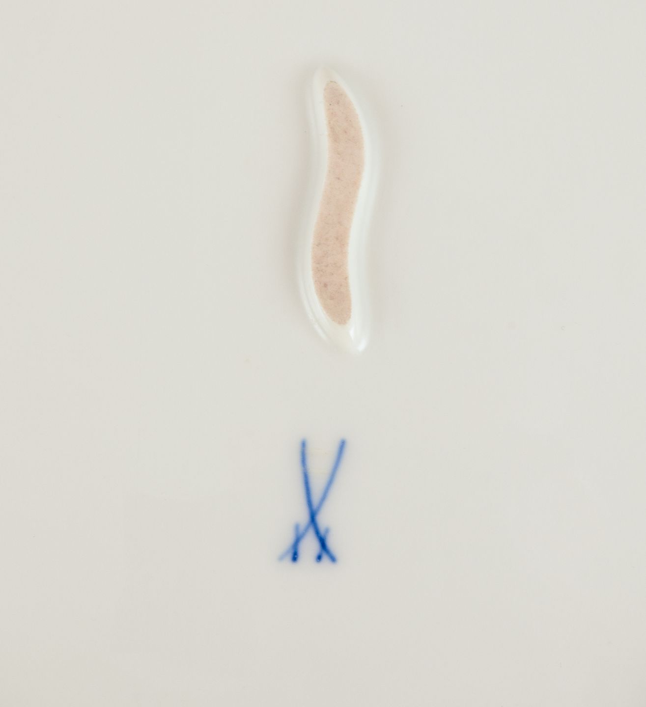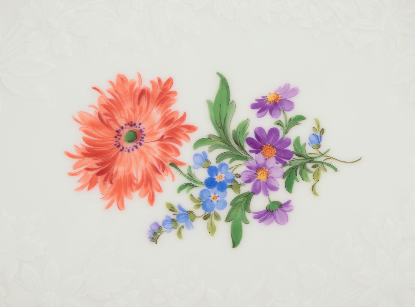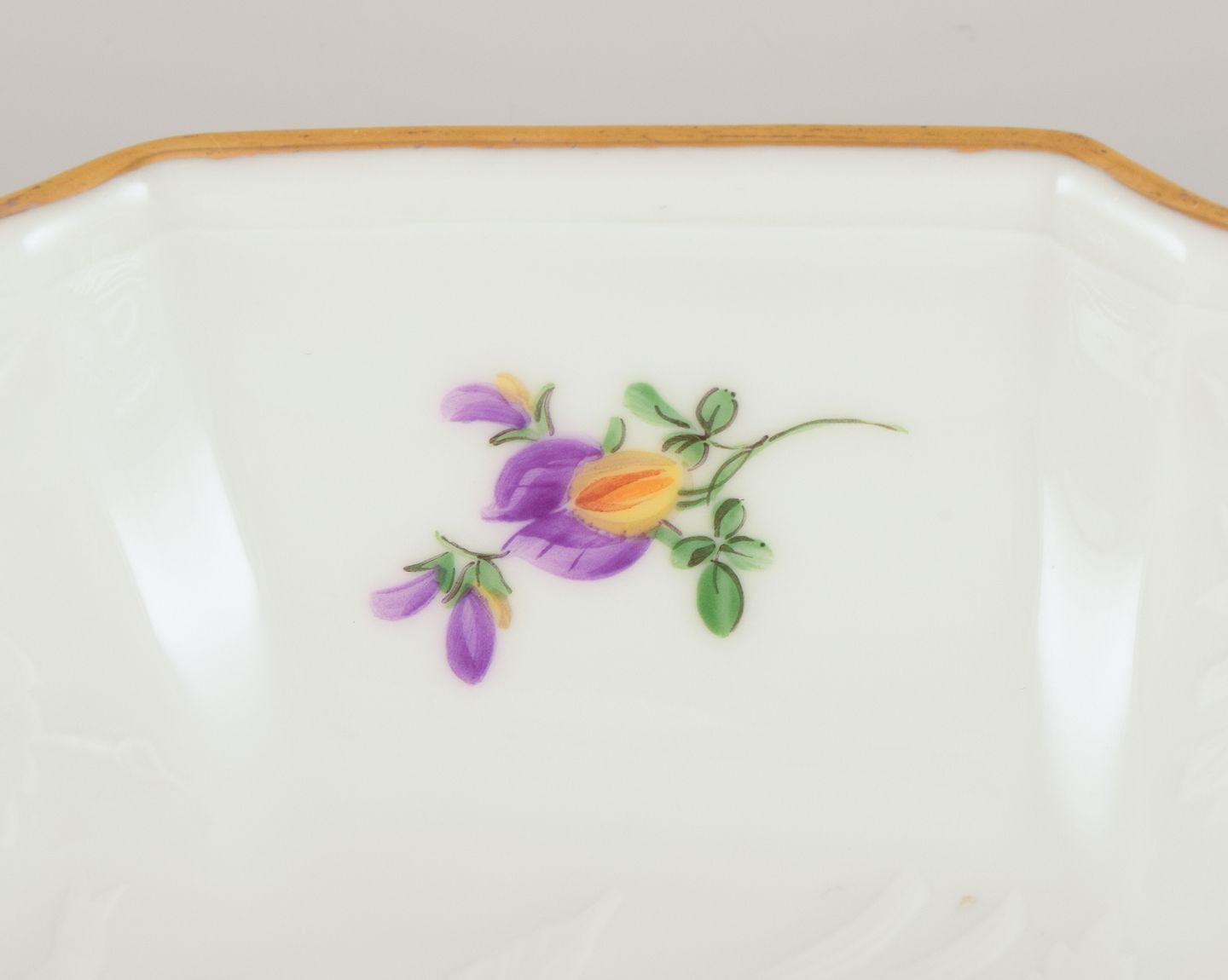 Meissen, Tyskland. Oval porcelænsskål håndmalet med polykrome blomster. Blomsterguirlander i relief. Guldkant. Ca. 1930. Stemplet. Tredje sortering. Perfekt stand. Mål: B 25,0 cm. x D 19,0 cm. x H 4,0 cm
