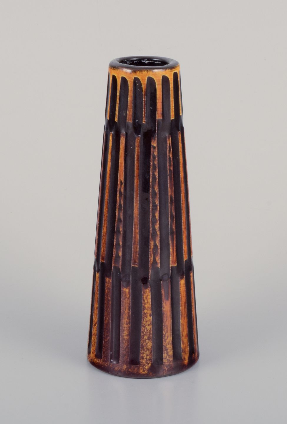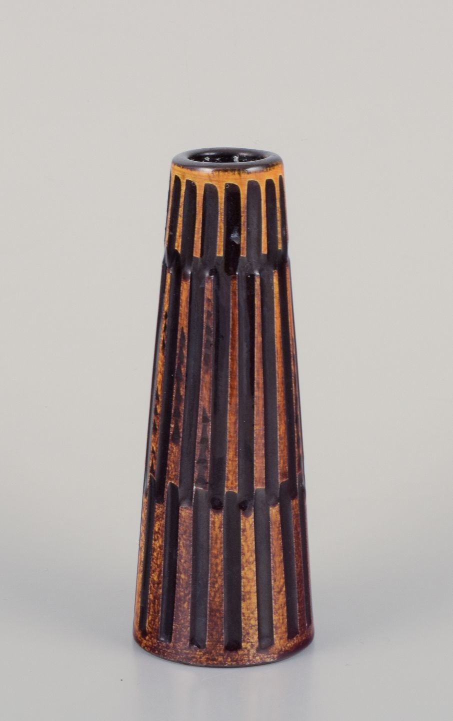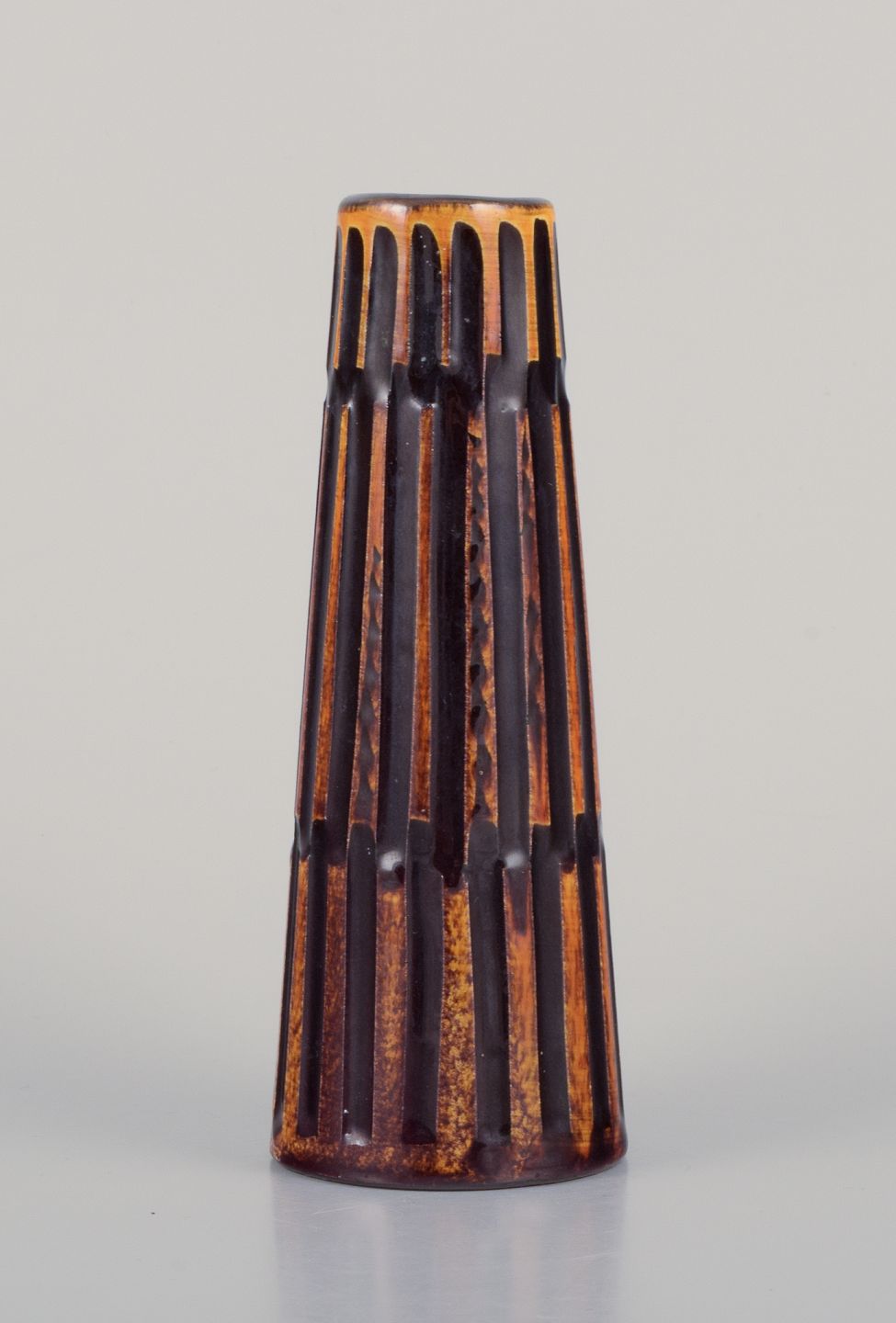 Ingrid Atterberg (1920-2008) for Upsala Ekeby. Keramikvase i modernistisk stil. Glasur i brune og okkergule nuancer. Ca. 1960. Modelnummer: 2643. Stemplet. Perfekt stand. Mål: H 15,0 cm. x D 5,5 cm.