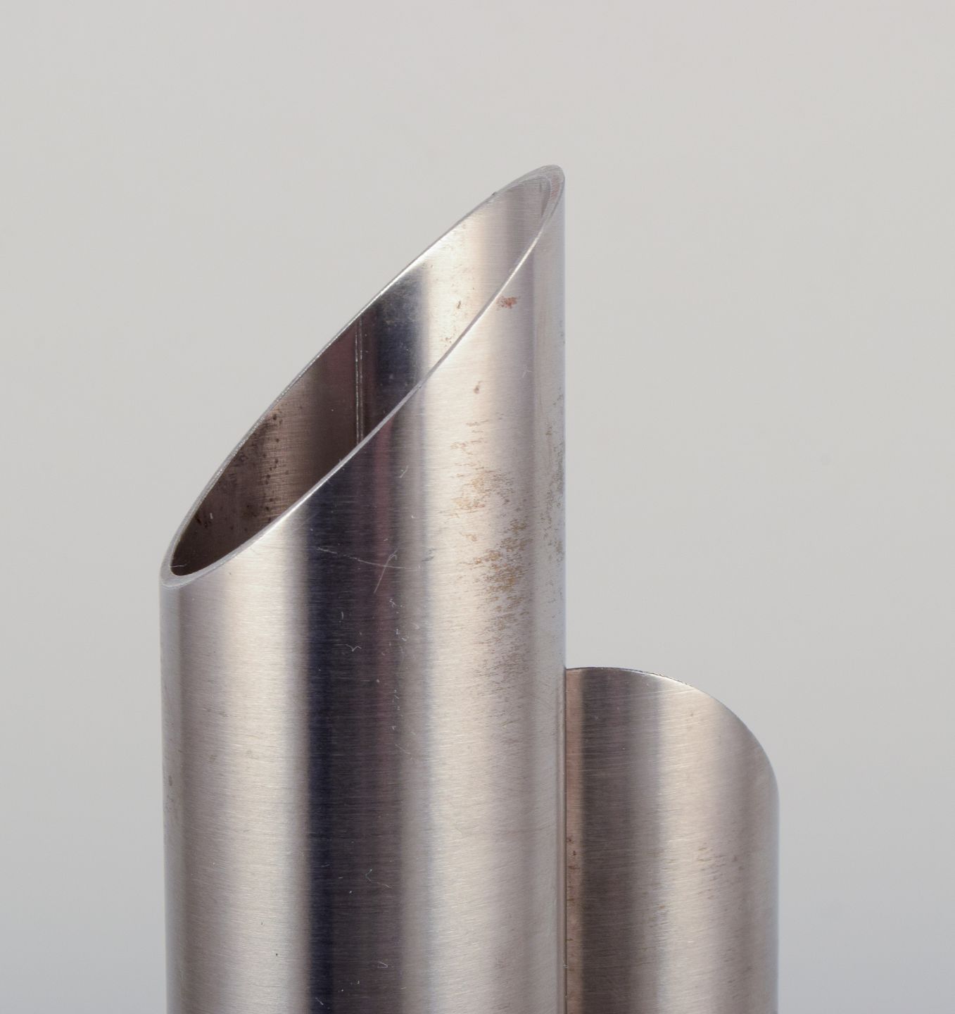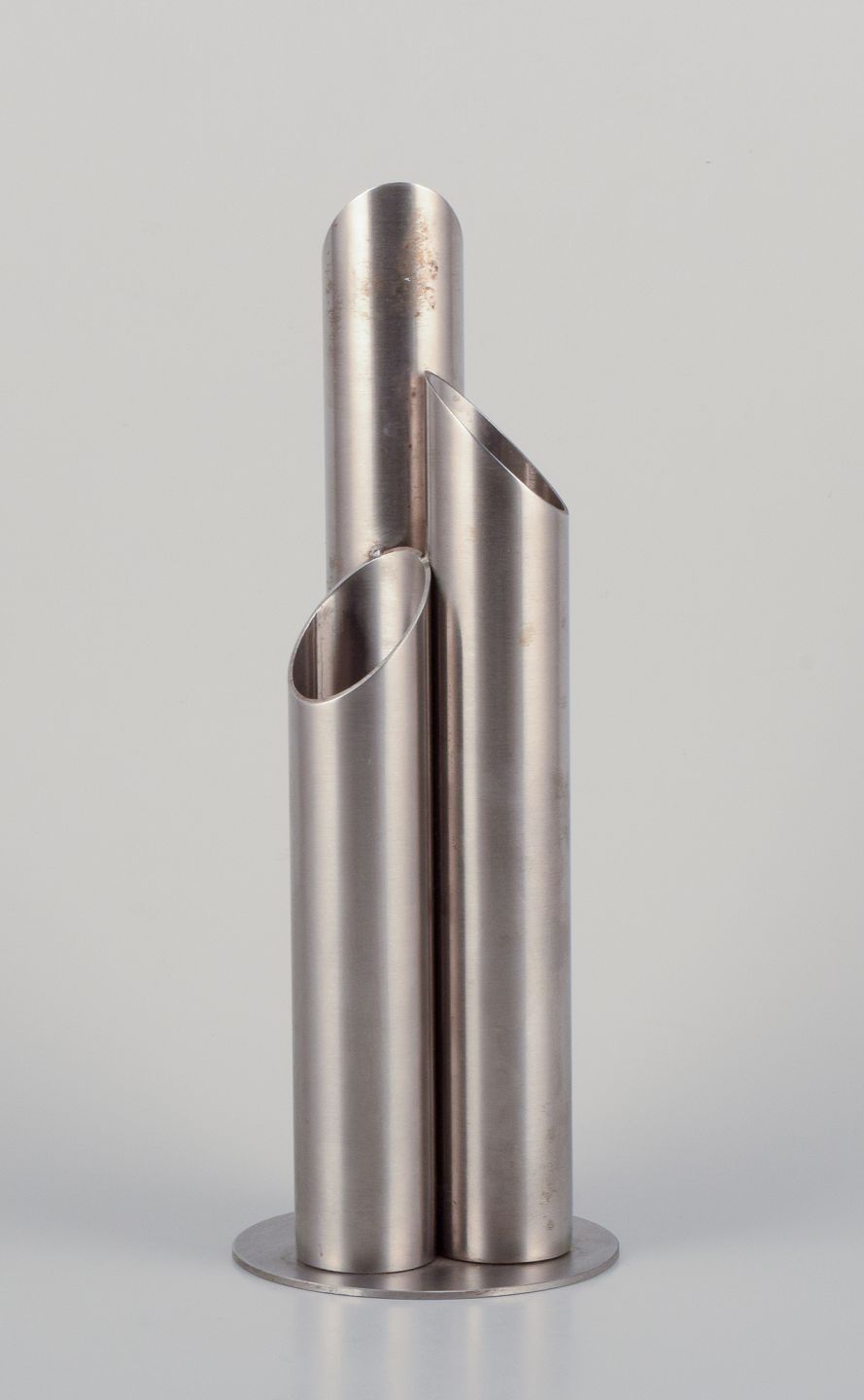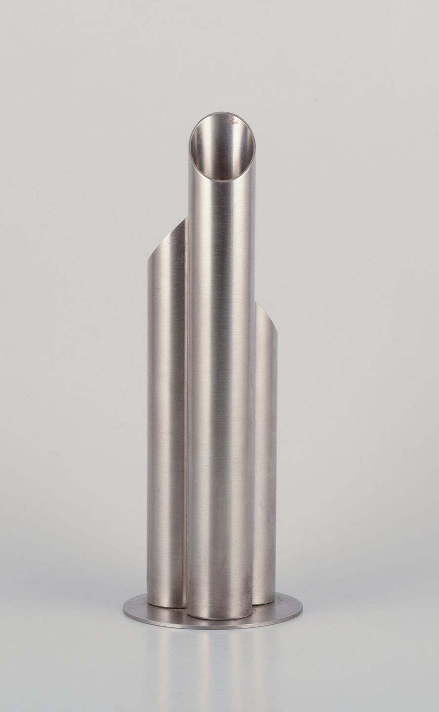 Svensk industriel designer. Vase i rustfrit stål udformet med tre sammensatte rør på rund sokkel. Brutalistisk stil. Ca. 1970. I flot stand. Mål: H 30,0 cm. x D 11,0 cm.