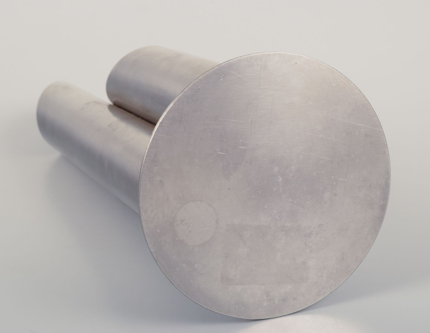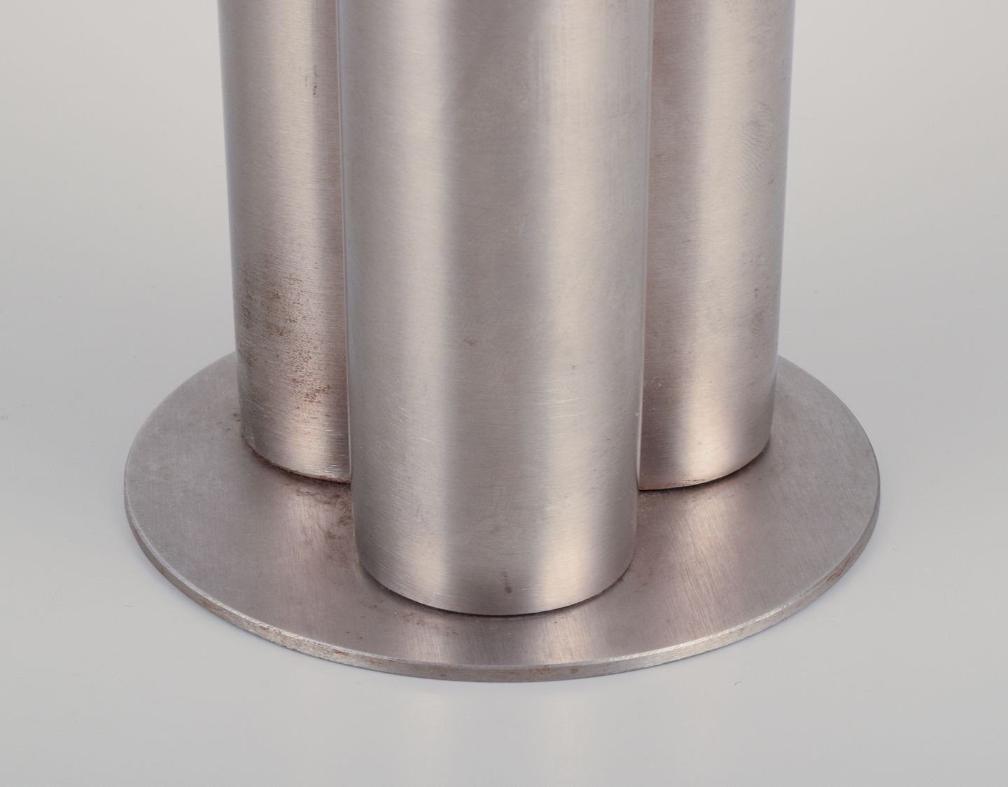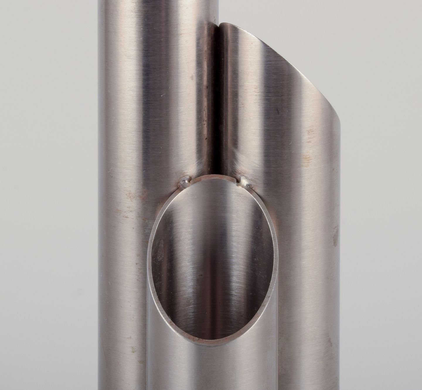 Svensk industriel designer. Vase i rustfrit stål udformet med tre sammensatte rør på rund sokkel. Brutalistisk stil. Ca. 1970. I flot stand. Mål: H 30,0 cm. x D 11,0 cm.