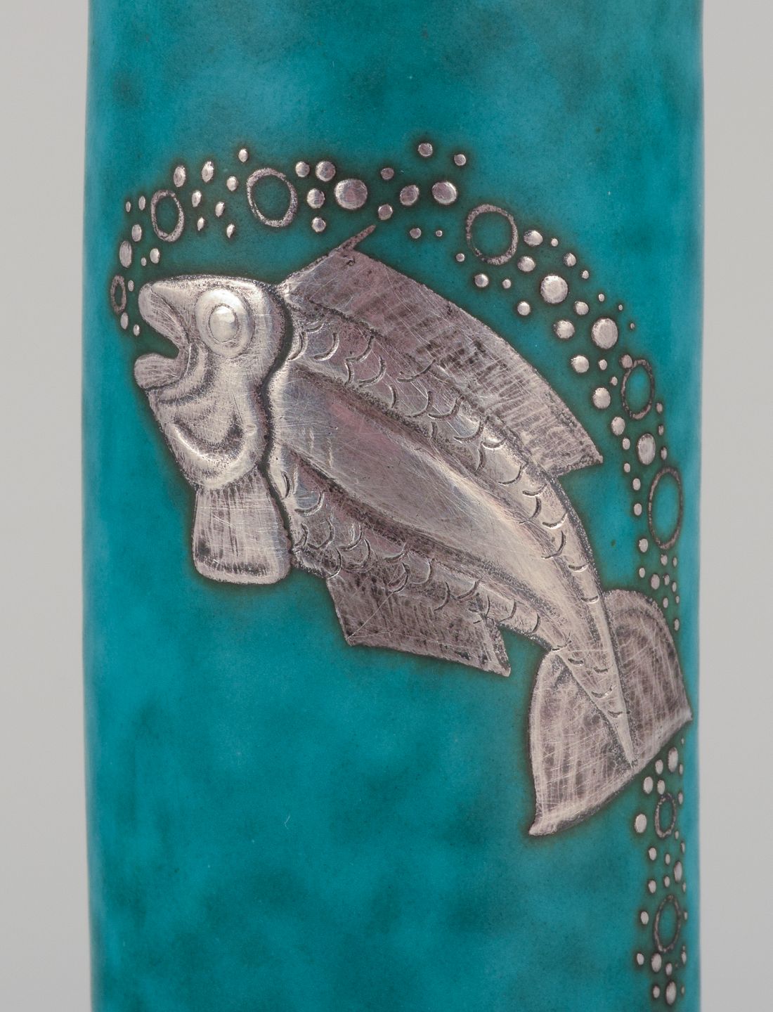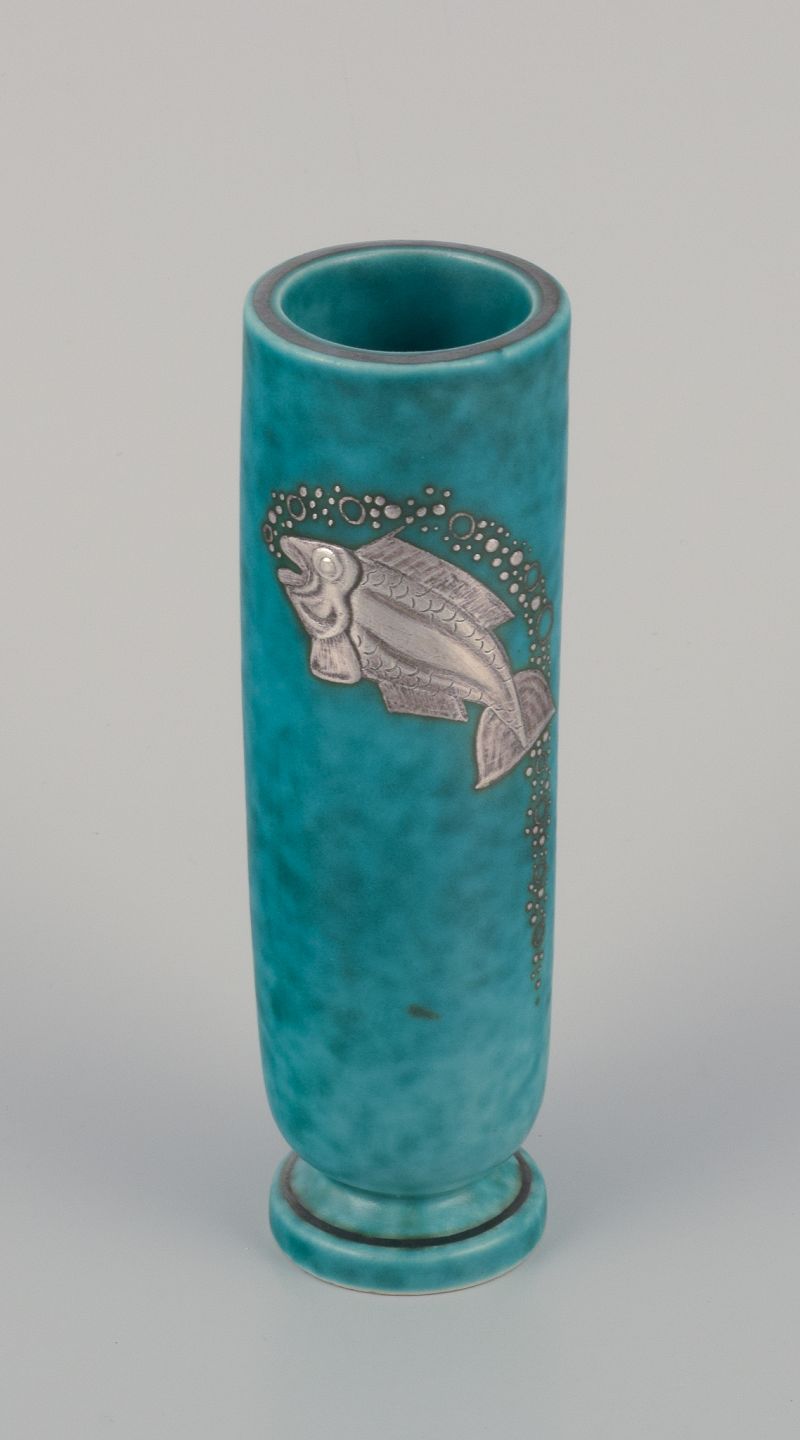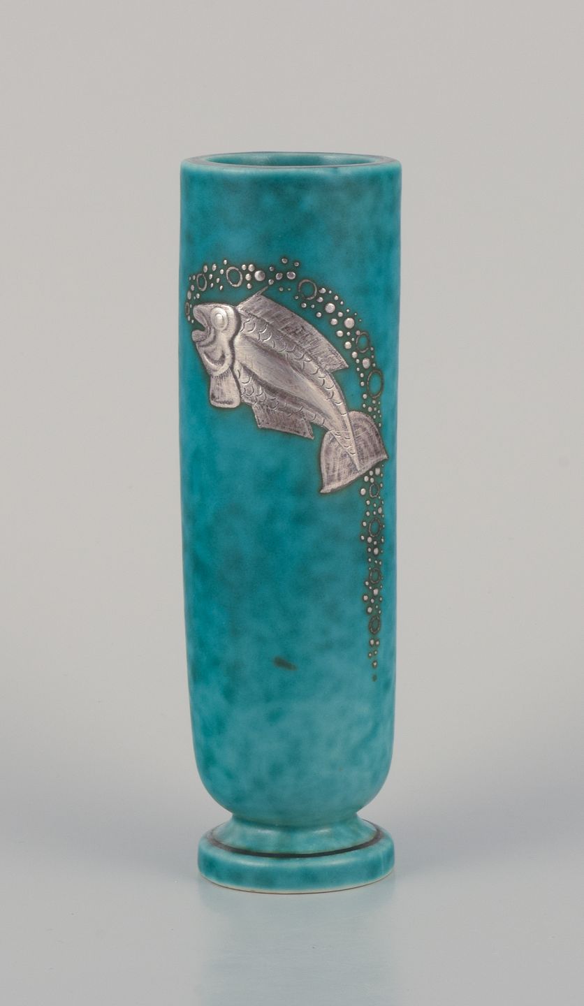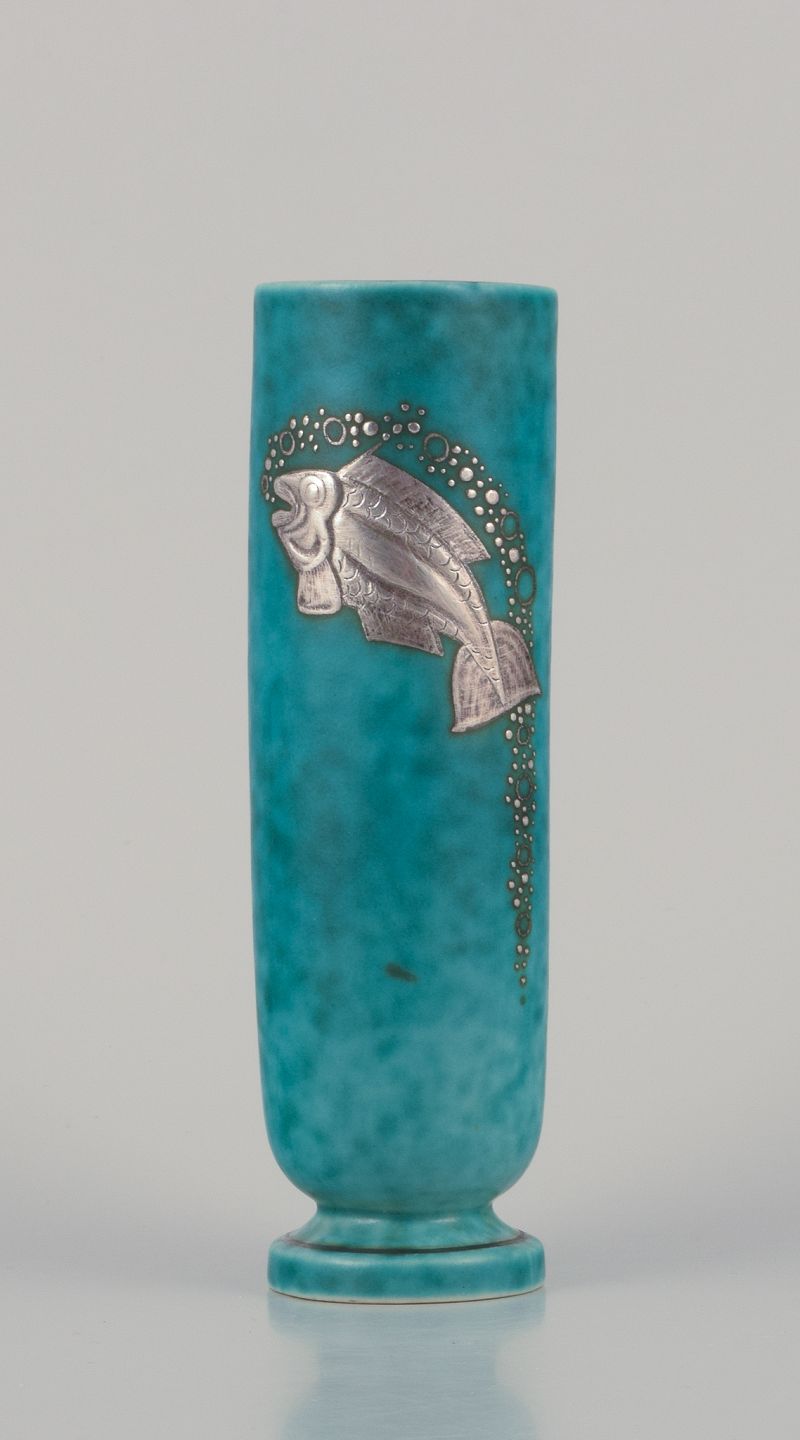 Wilhelm Kåge (1889-1960) for Gustavsberg. Slank keramikvase fra ”Argenta” serien. Motiv af fisk. Model 1029 Midt 1900-tallet. Stemplet. I perfekt stand. Mål: H 15,1 x D 4,5 cm.