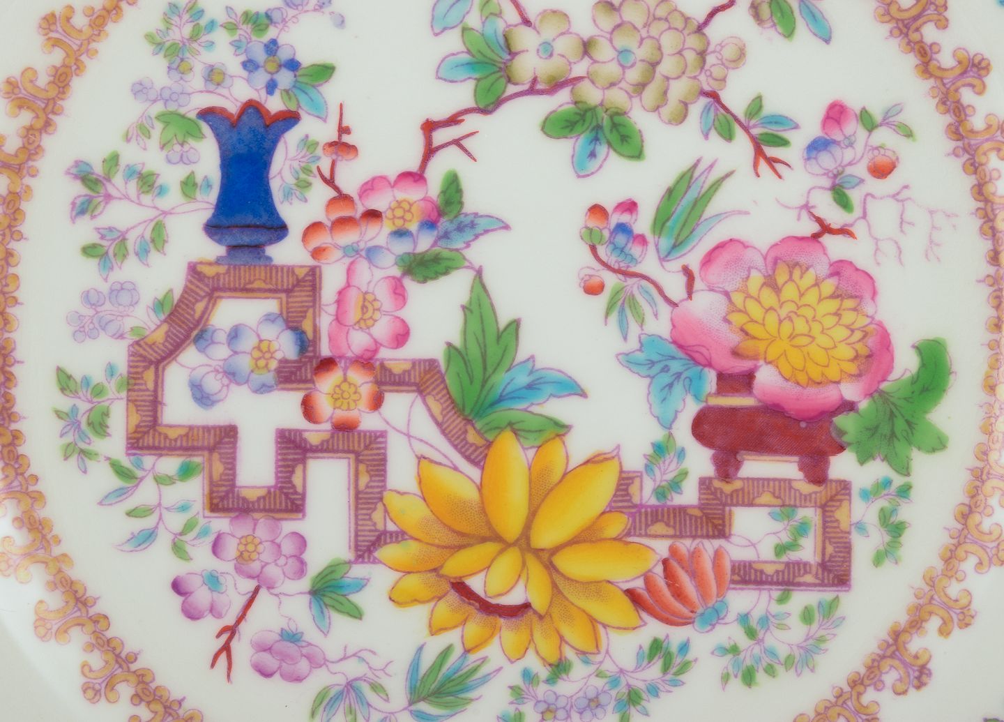 Mintons, England. Fire frokosttallerkner i fajance. Kinesisk stil. Dekoreret med blomster. Sent 1800-talllet. Stemplet. I flot stand med naturlige krakeleringer. Mål: D 20,5 cm.