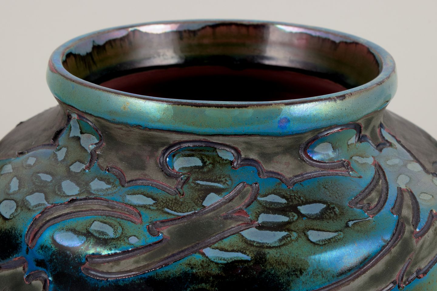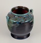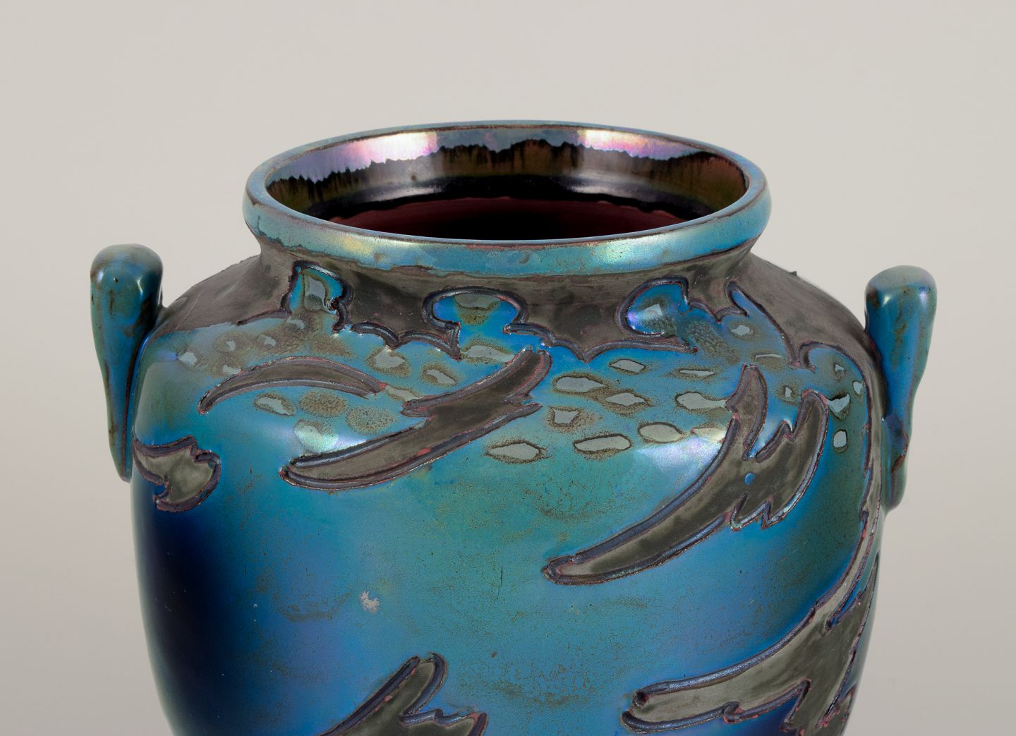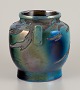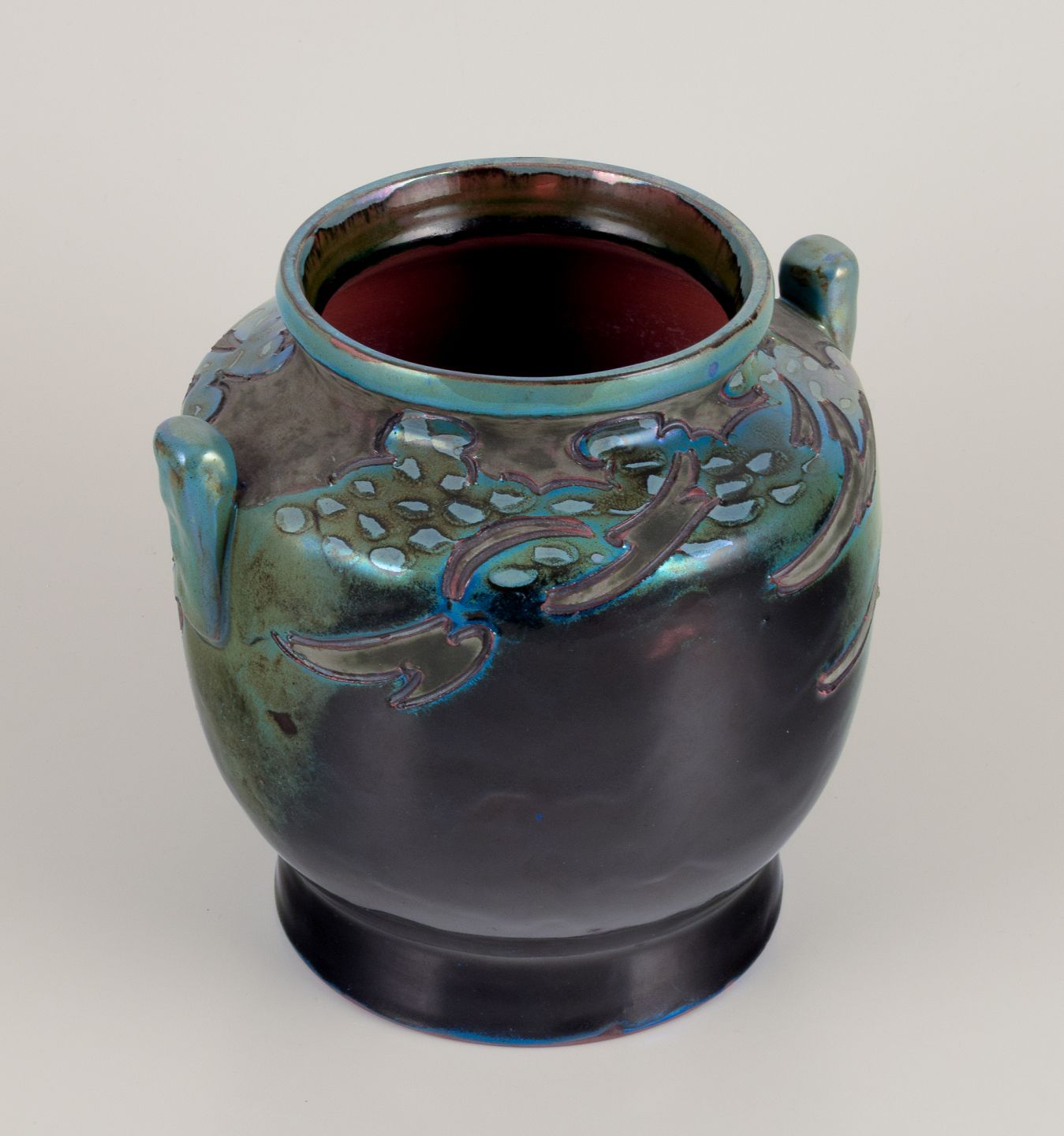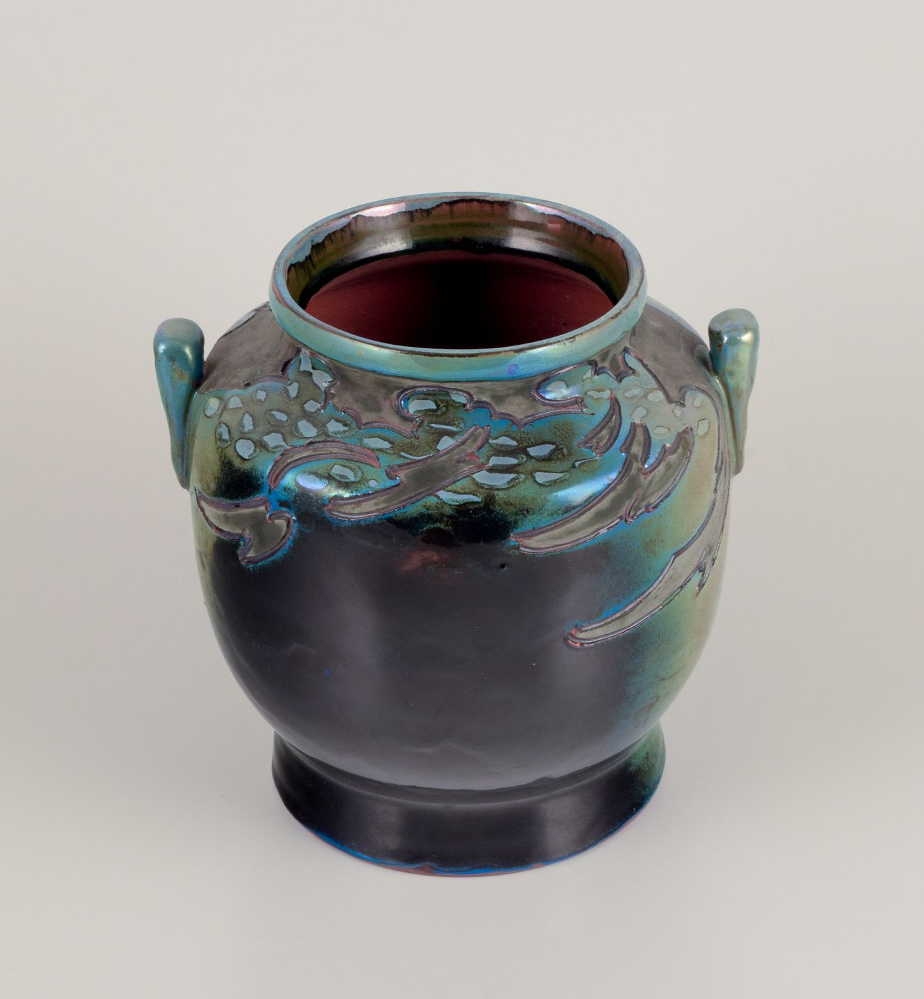 Delft, Holland. Unika Art Nouveau keramikvase med hanke. Lustre glasur. Glasur i blågrønne nuancer. Ca. 1920. Stemplet. Perfekt stand. Mål: D 18,5 cm. x H 18,5 cm.