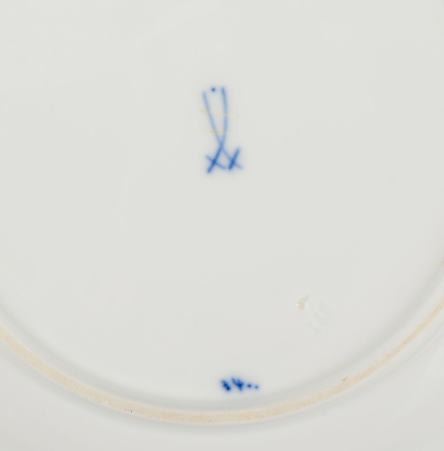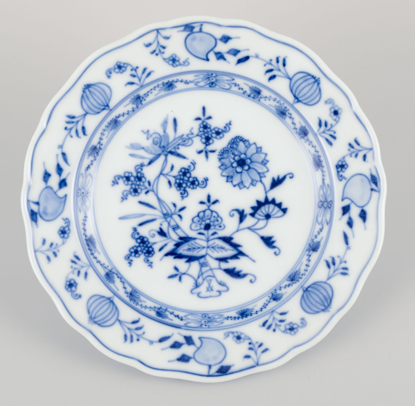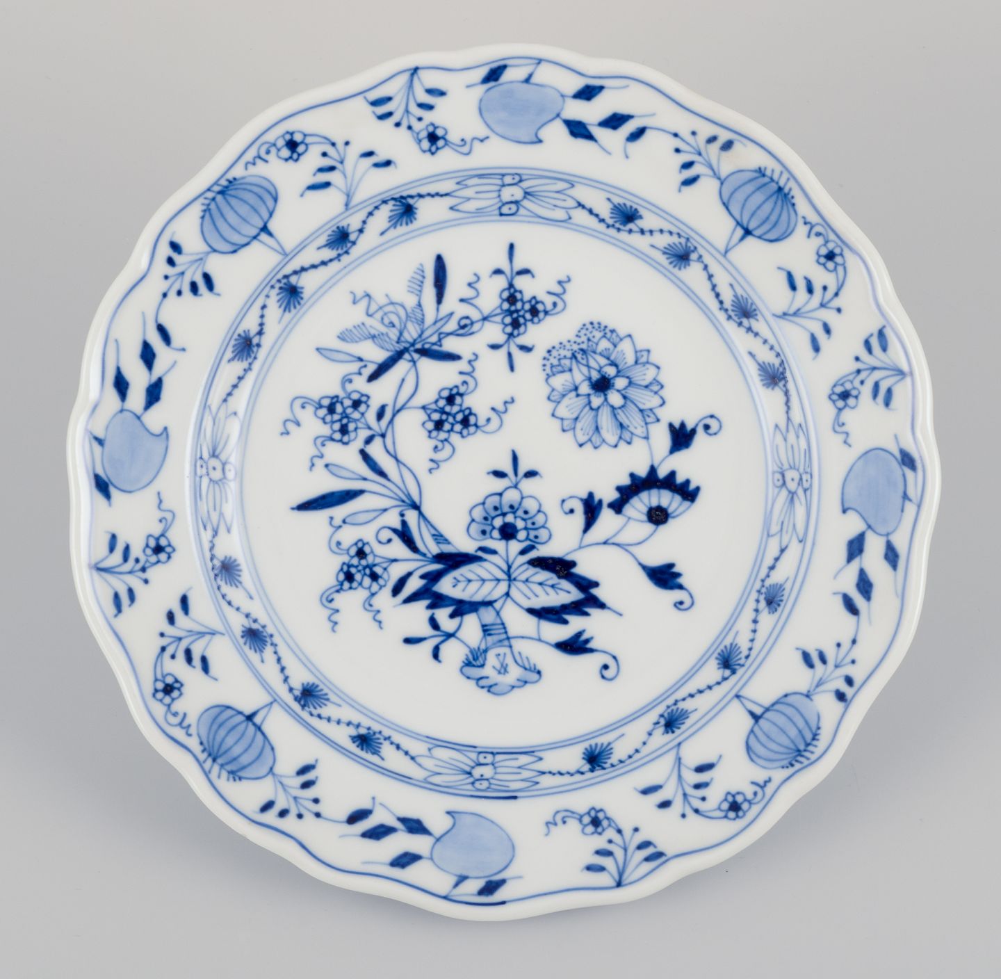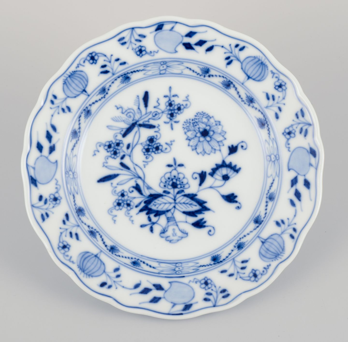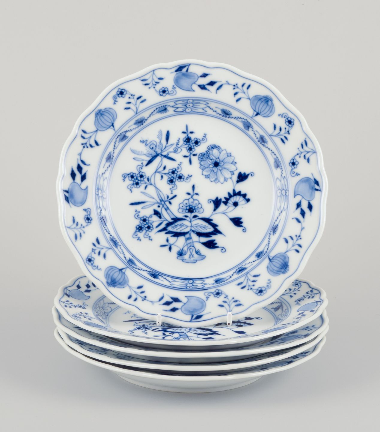 Meissen, Tyskland. Løgmønstret. Fem tallerkner. Håndmalet i blåt. Ca. 1900. Stemplet. Perfekt stand. Tredje sortering. Mål: D 19,5 cm. x H 2,5 cm.
