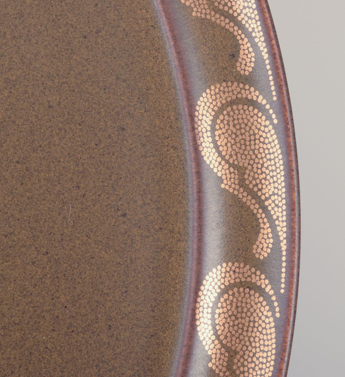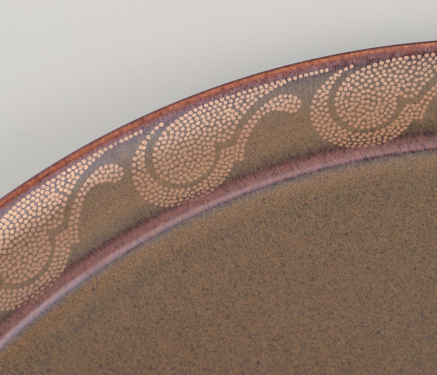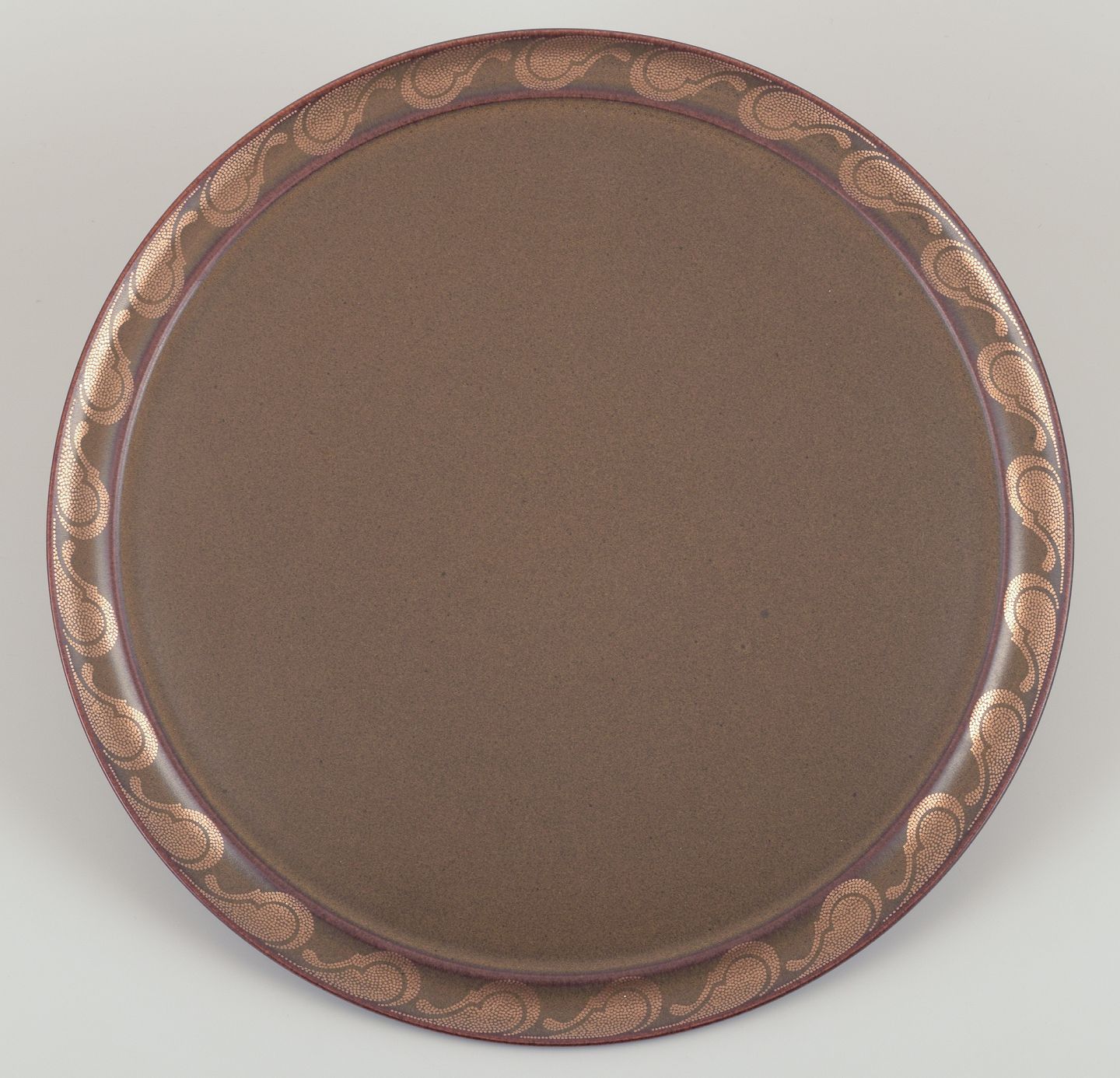 Timo Sarpaneva for Rosenthal. ”Kaari”. En rund bakke i porcelæn. Brun glasur med gulddekoration. 1980’erne. Stemplet. I perfekt stand. Fremstår som nyt. Mål: D 35,0 cm. x H 1,6 cm.
