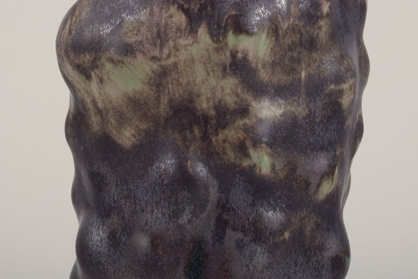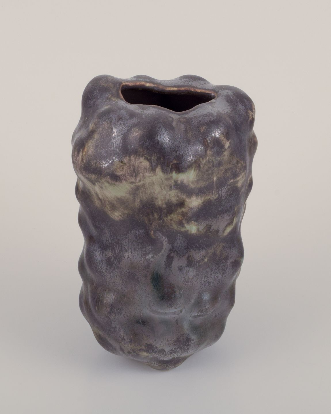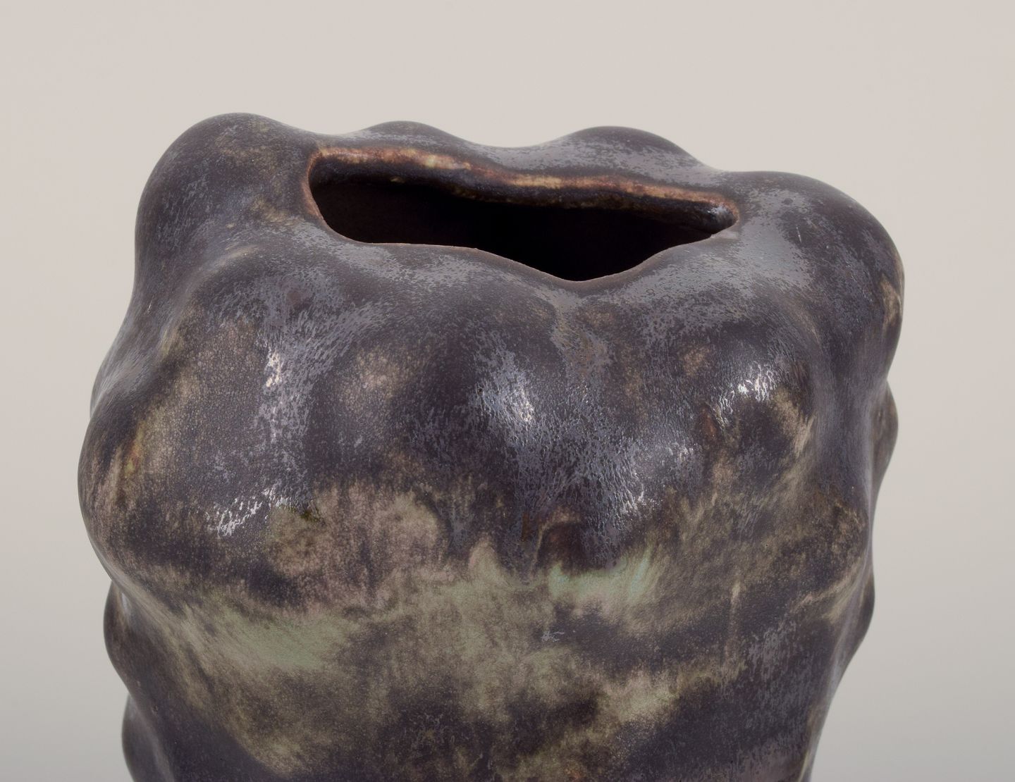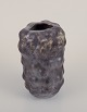 Unika skulpturel vase, organisk udformet i stentøjsler. Sort glasur med næsten metallisk skær og irgrønne områder.