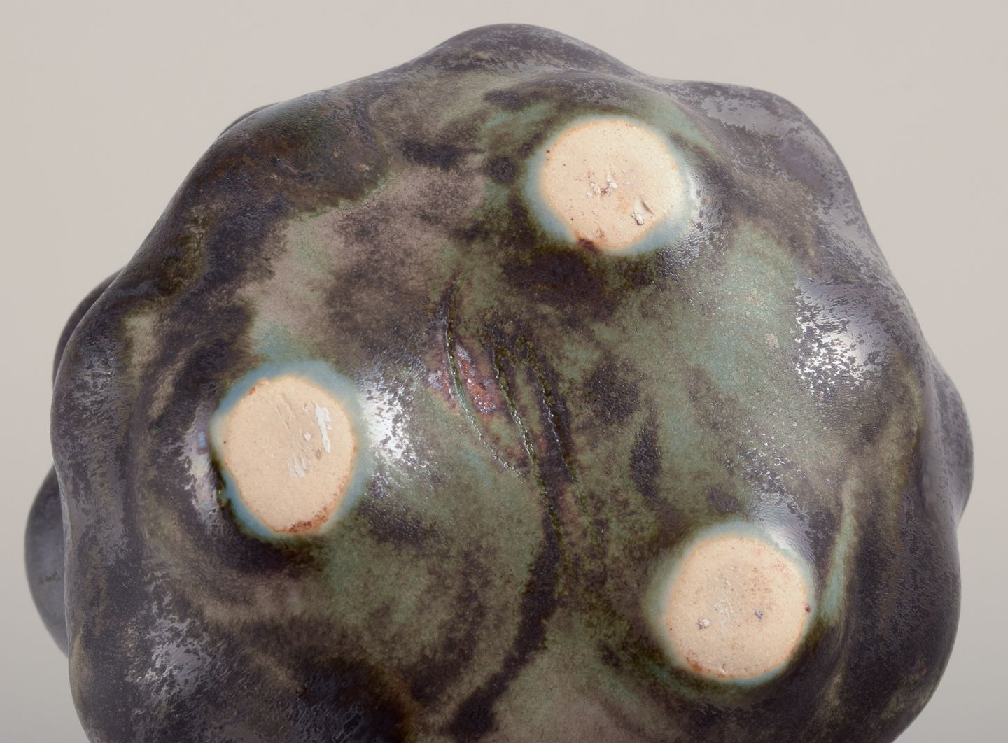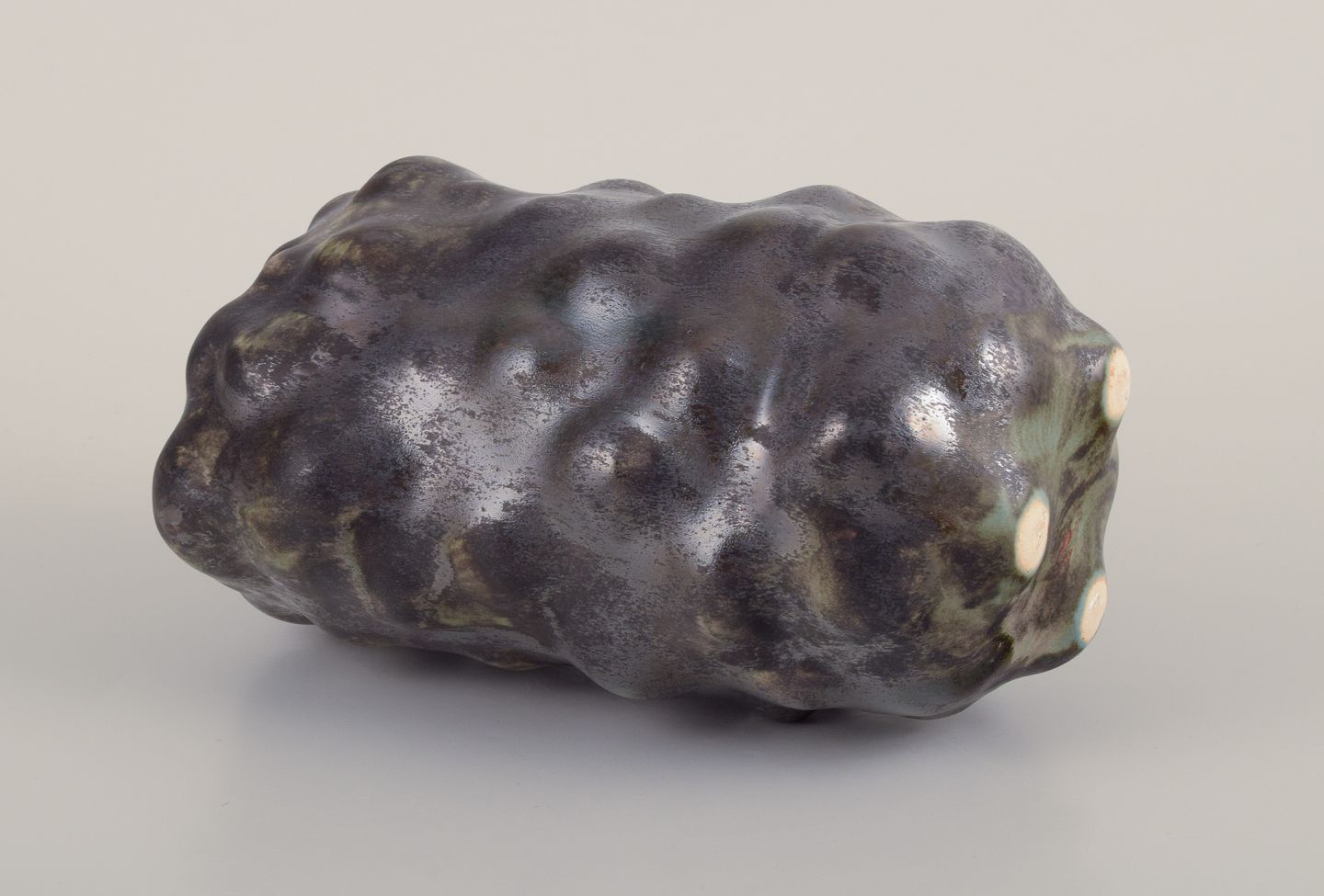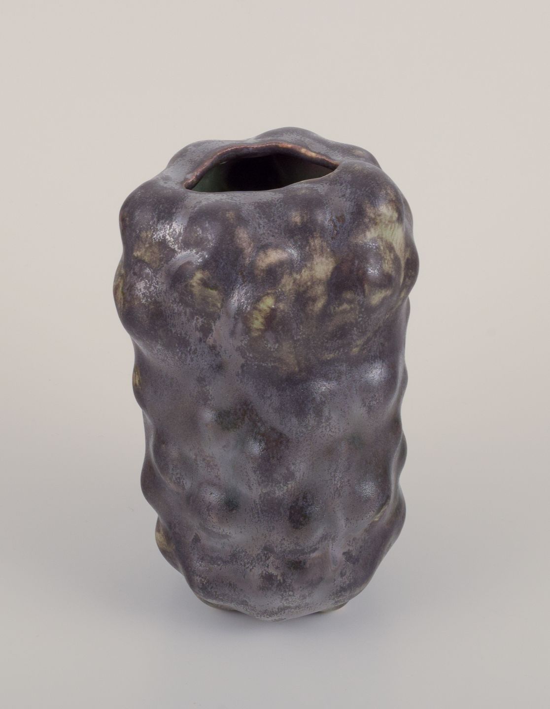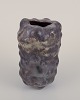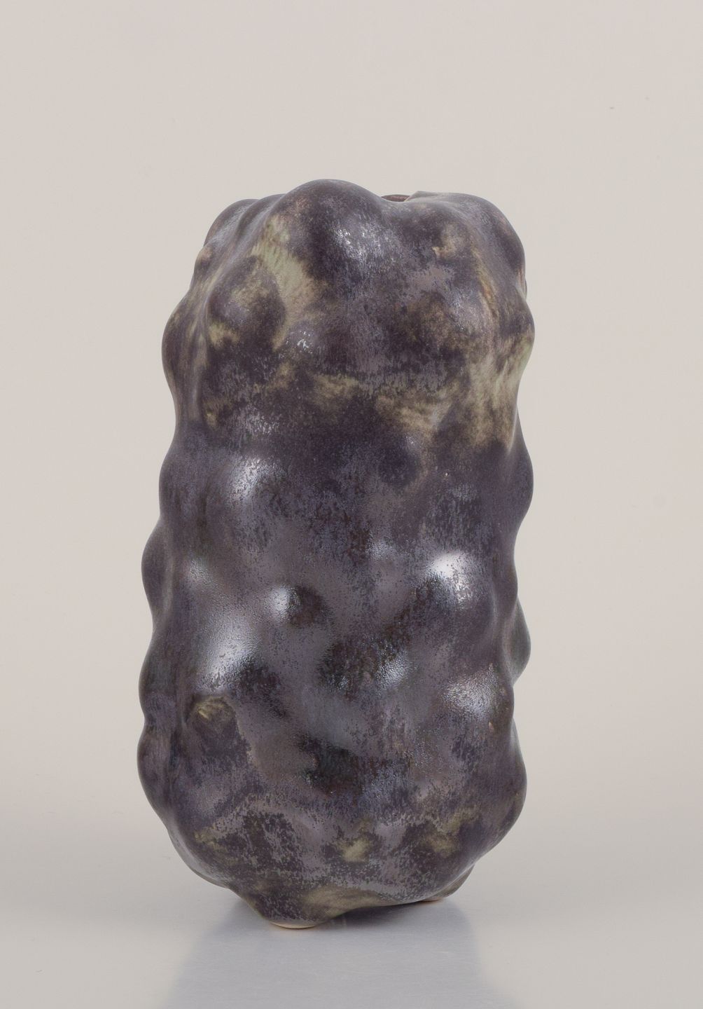 Unika skulpturel vase, organisk udformet i stentøjsler. Sort glasur med næsten metallisk skær og irgrønne områder.