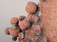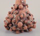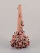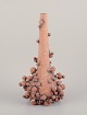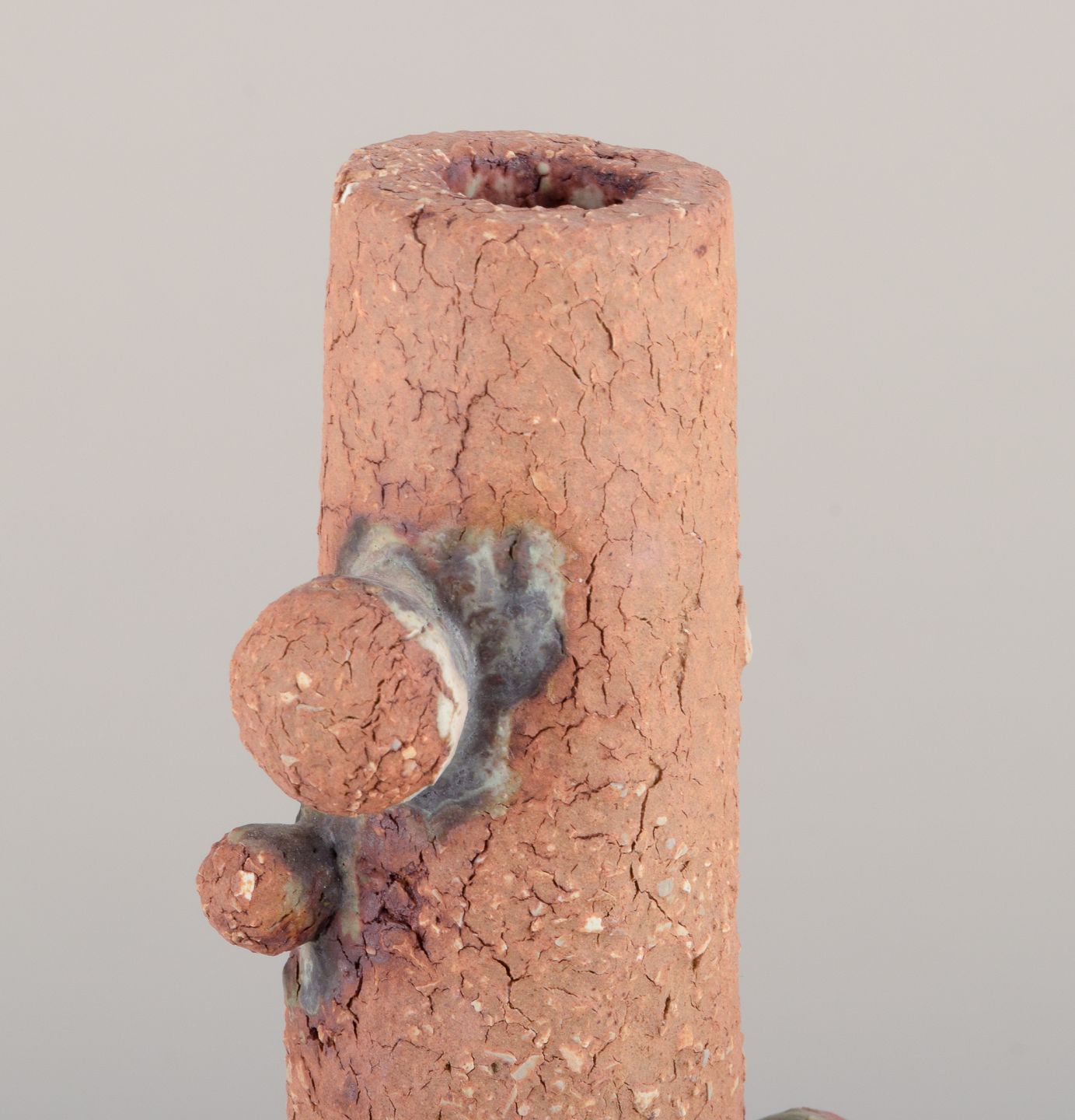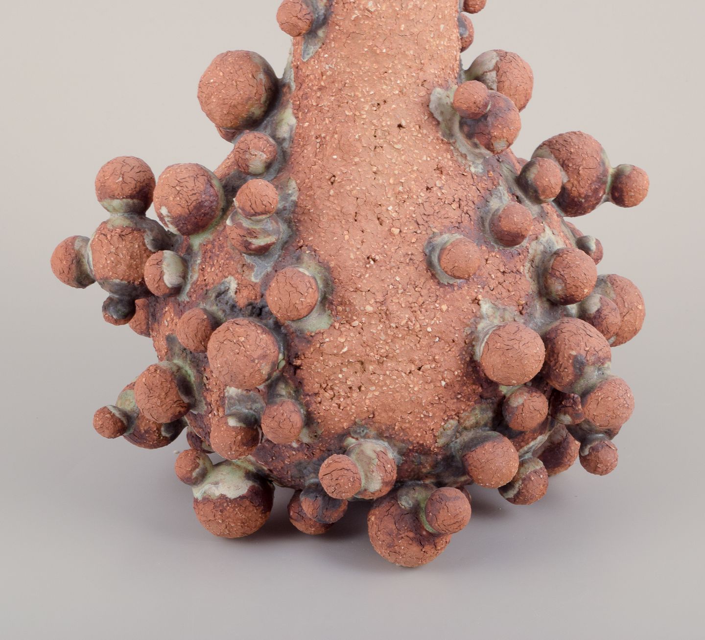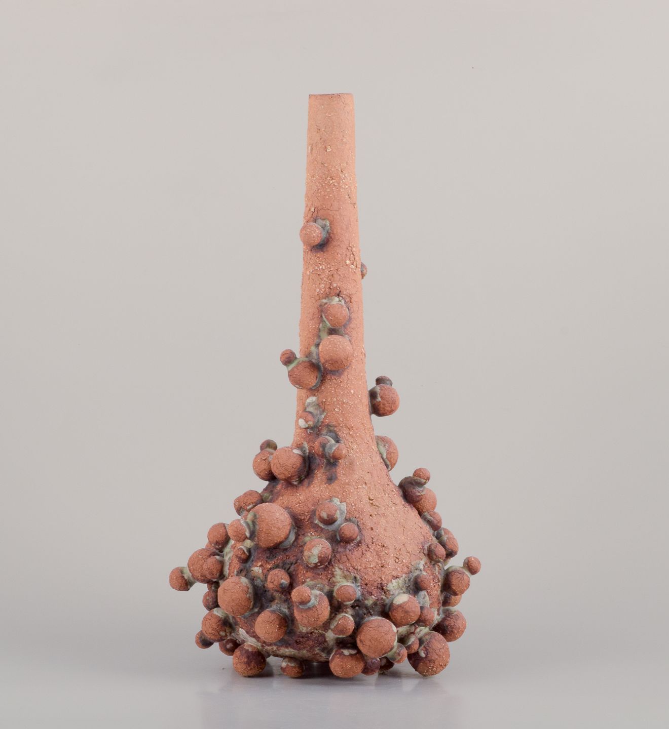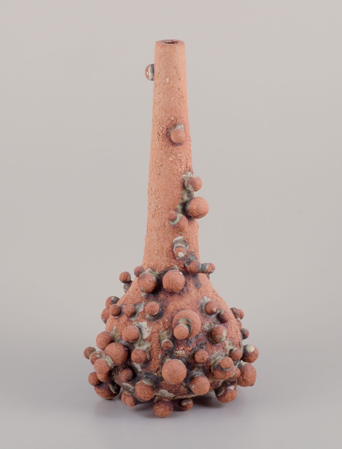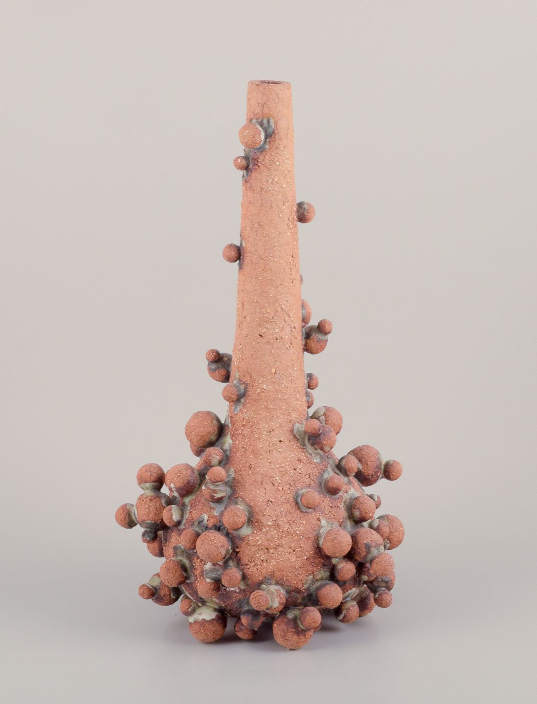 Høj vase med flaskehals prydet med små kugler af stentøjsler. Skulpturen er kun delvist glaseret, med en hvid-sort glasur med irgrønne nister.