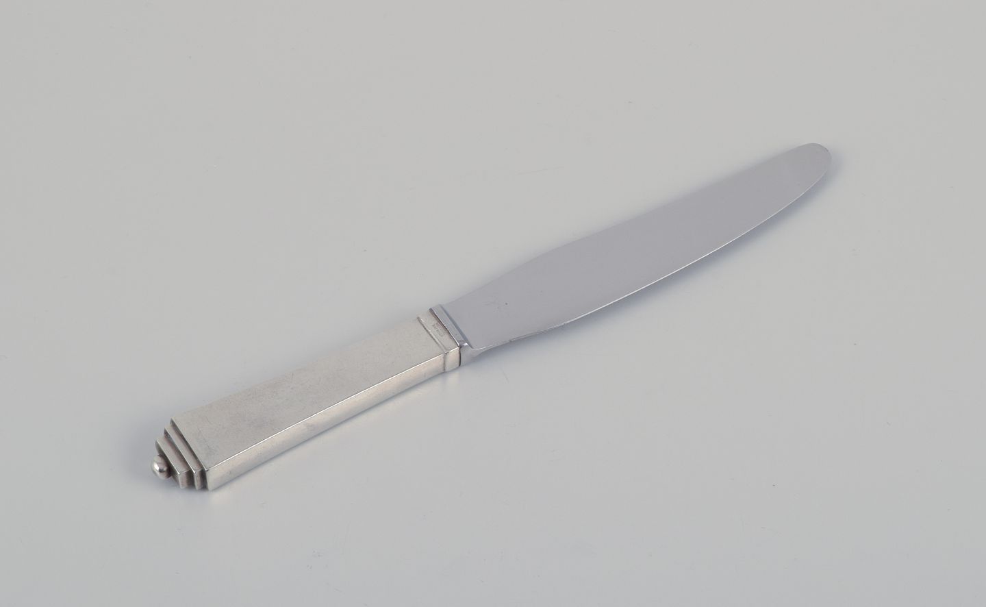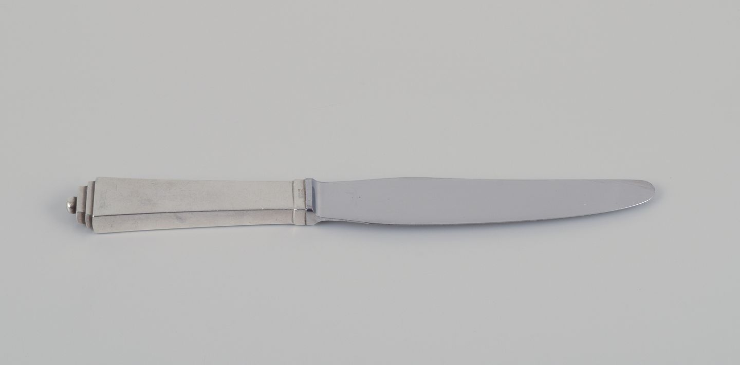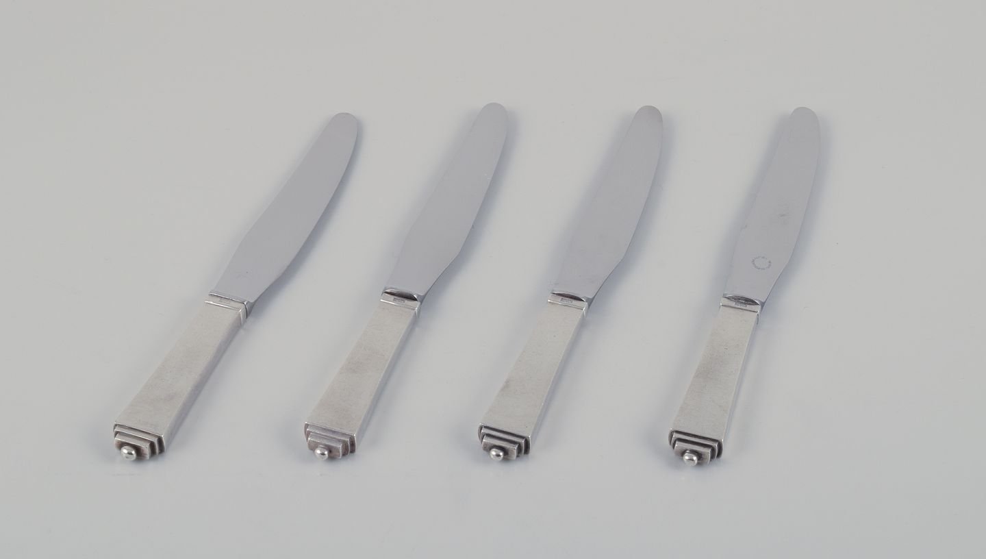 Georg Jensen Pyramide, et sæt på fire kortskaftede middagsknive i sterlingsølv. Knivblad i rustfrit stål. Datering: 1933-1944 samt efter 1945. I flot stand med brugspræg. Stemplet. Mål: L 22,5 cm.