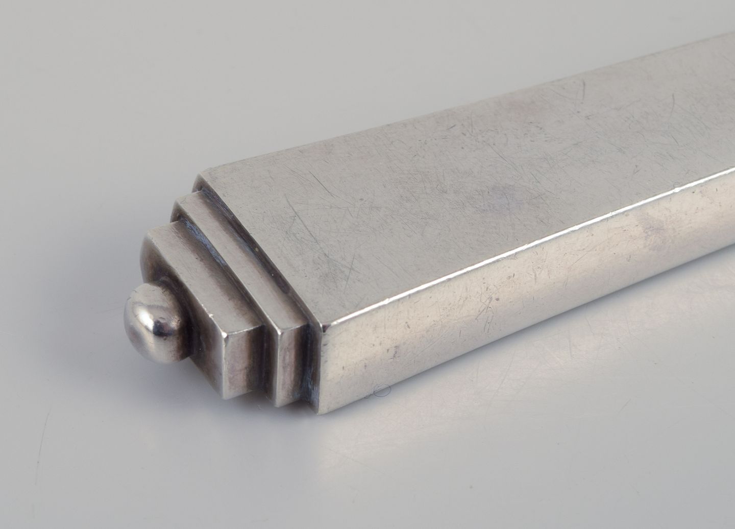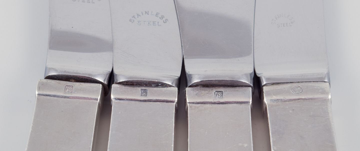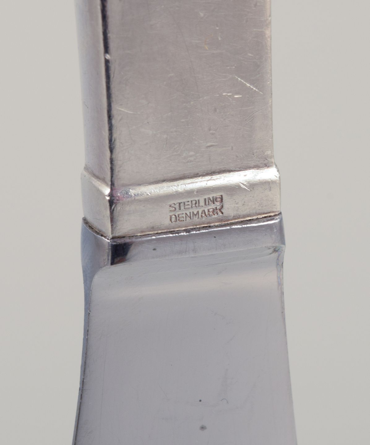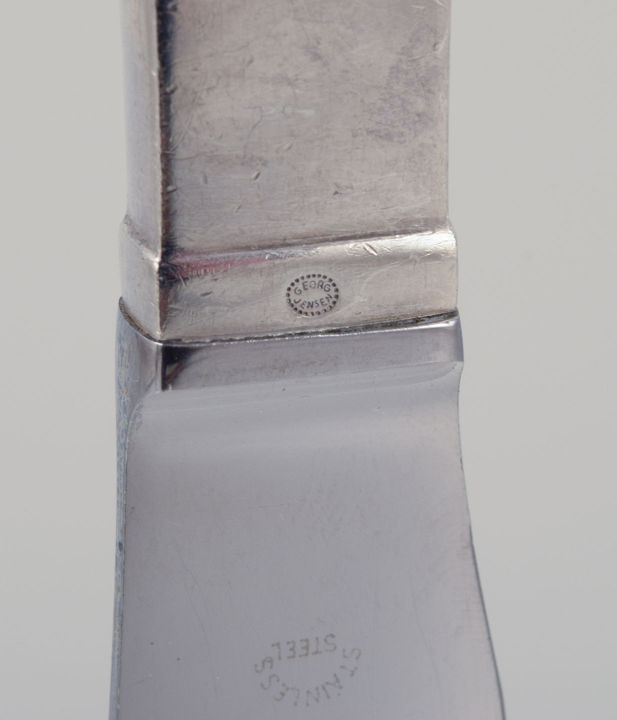 Georg Jensen Pyramide, et sæt på fire kortskaftede middagsknive i sterlingsølv. Knivblad i rustfrit stål. Datering: 1933-1944 samt efter 1945. I flot stand med brugspræg. Stemplet. Mål: L 22,5 cm.