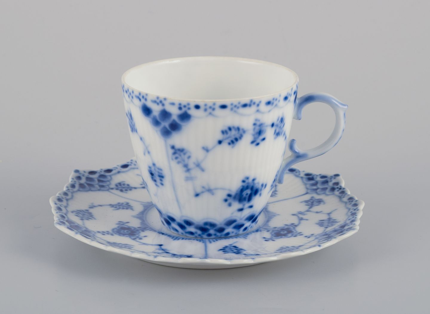 Royal Copenhagen Musselmalet Helblonde, fem mokkakopper og underkopper.