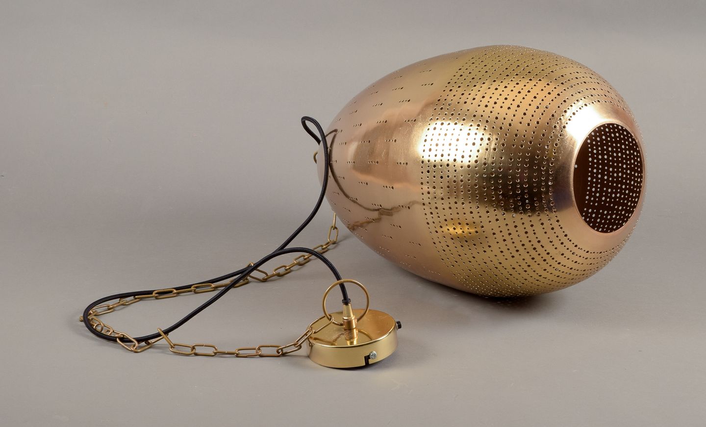 Hedemann, Danmark. Stor loftslampe i messing. Æggeformet. Designet med cirkler. I flot stand med mindre brugspræg. 2000-tallet. Mærkat. Mål: H 49,0 x D 33,0 cm.