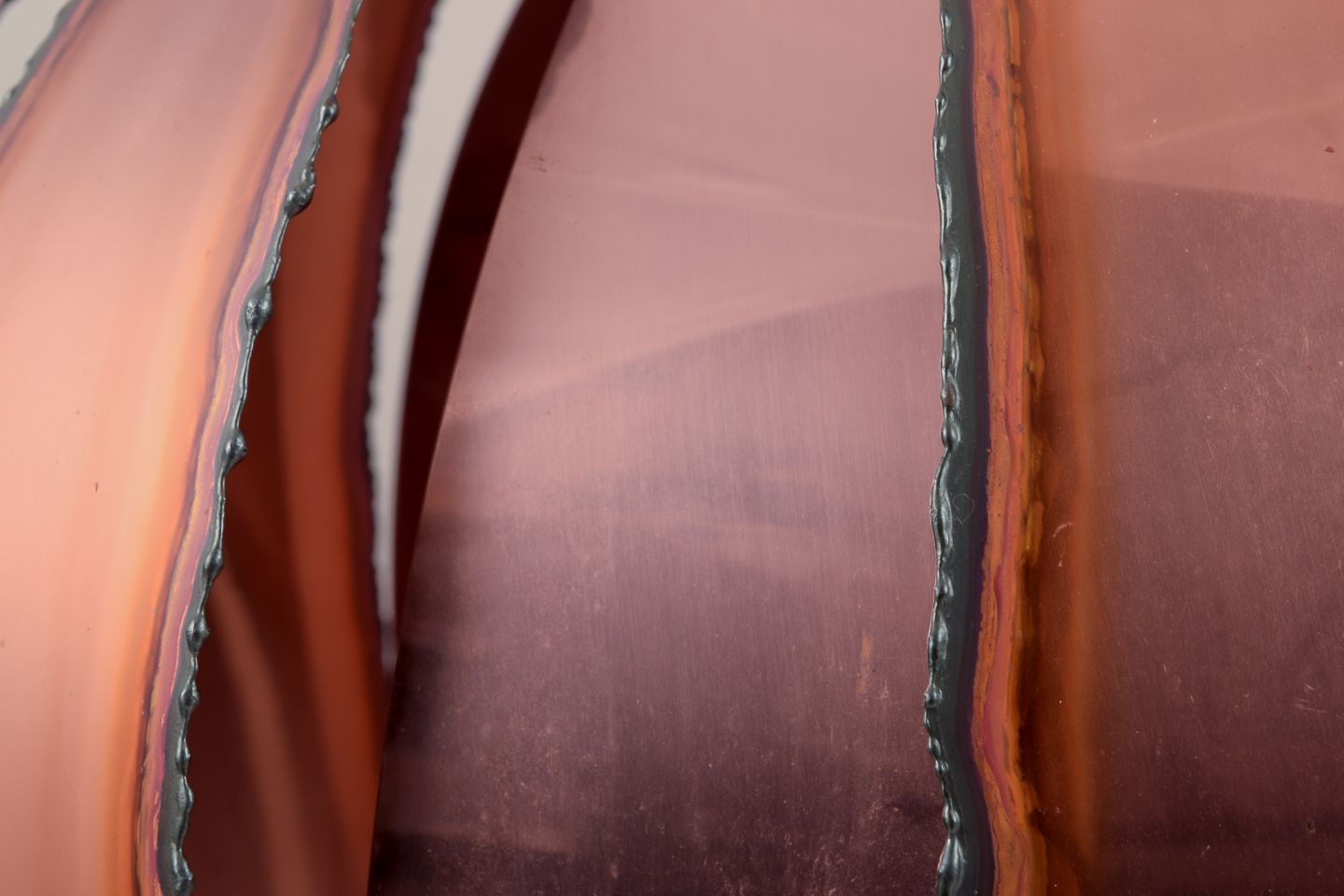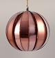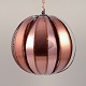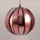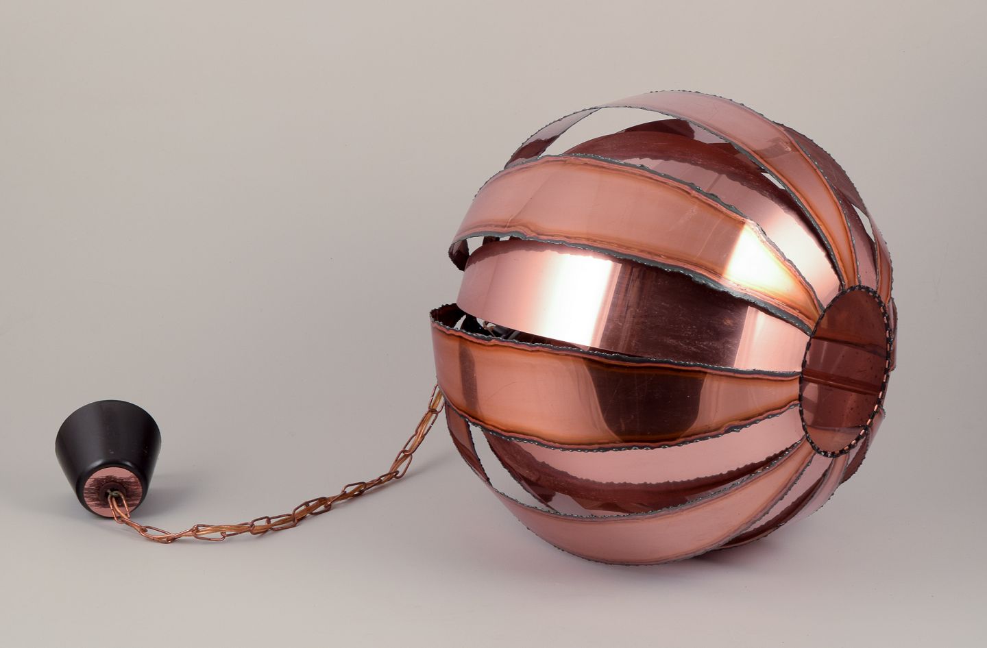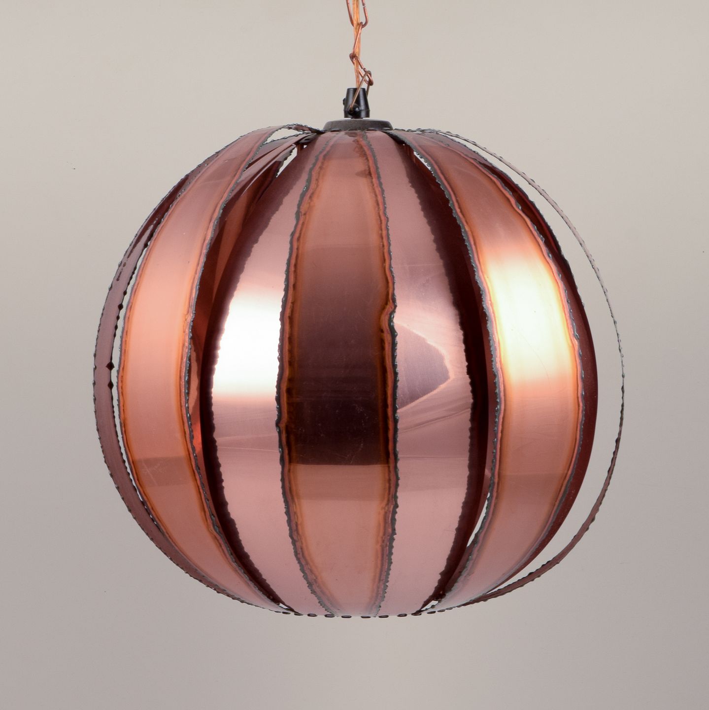 Svend Aage Holm Sørensen, kugleformet loftslampe af syreskåret kobber. Udført hos Holm Sørensen & Co. 1970'erne. I perfekt stand med almindeligt brugspræg. Mål: D 36,0 cm. x H 36,0 cm.