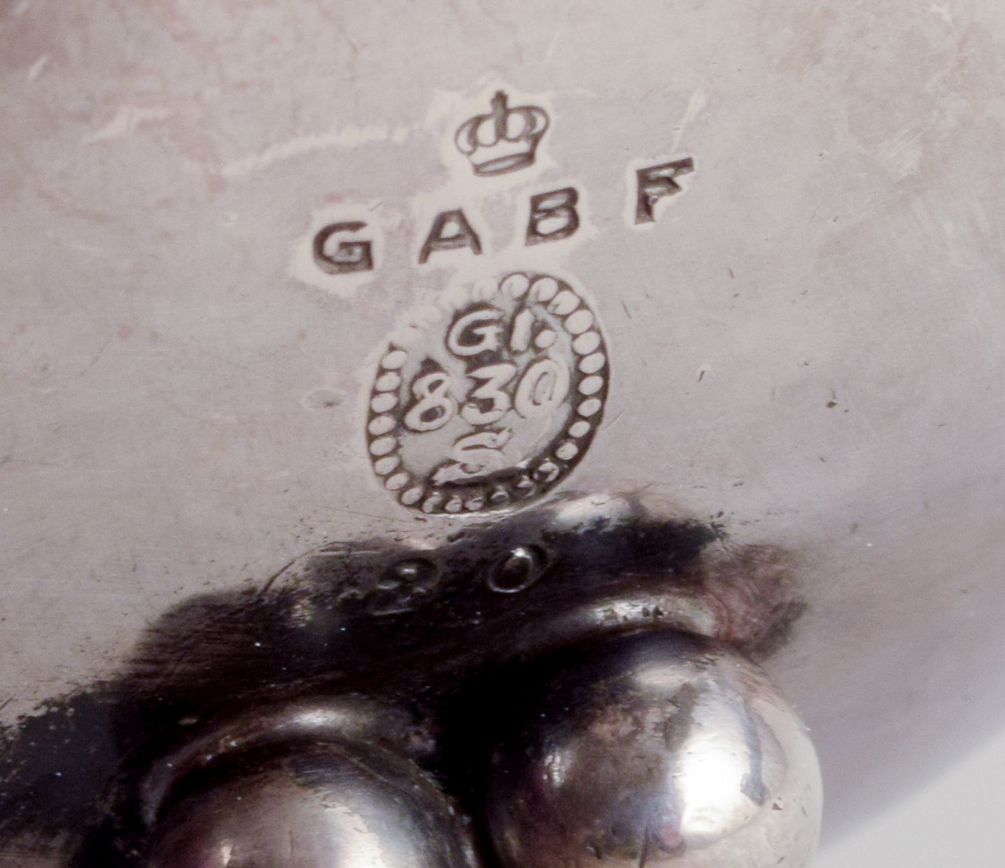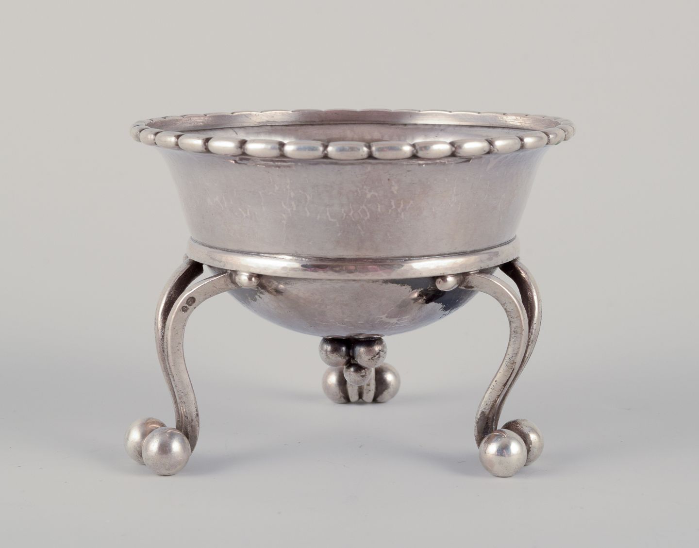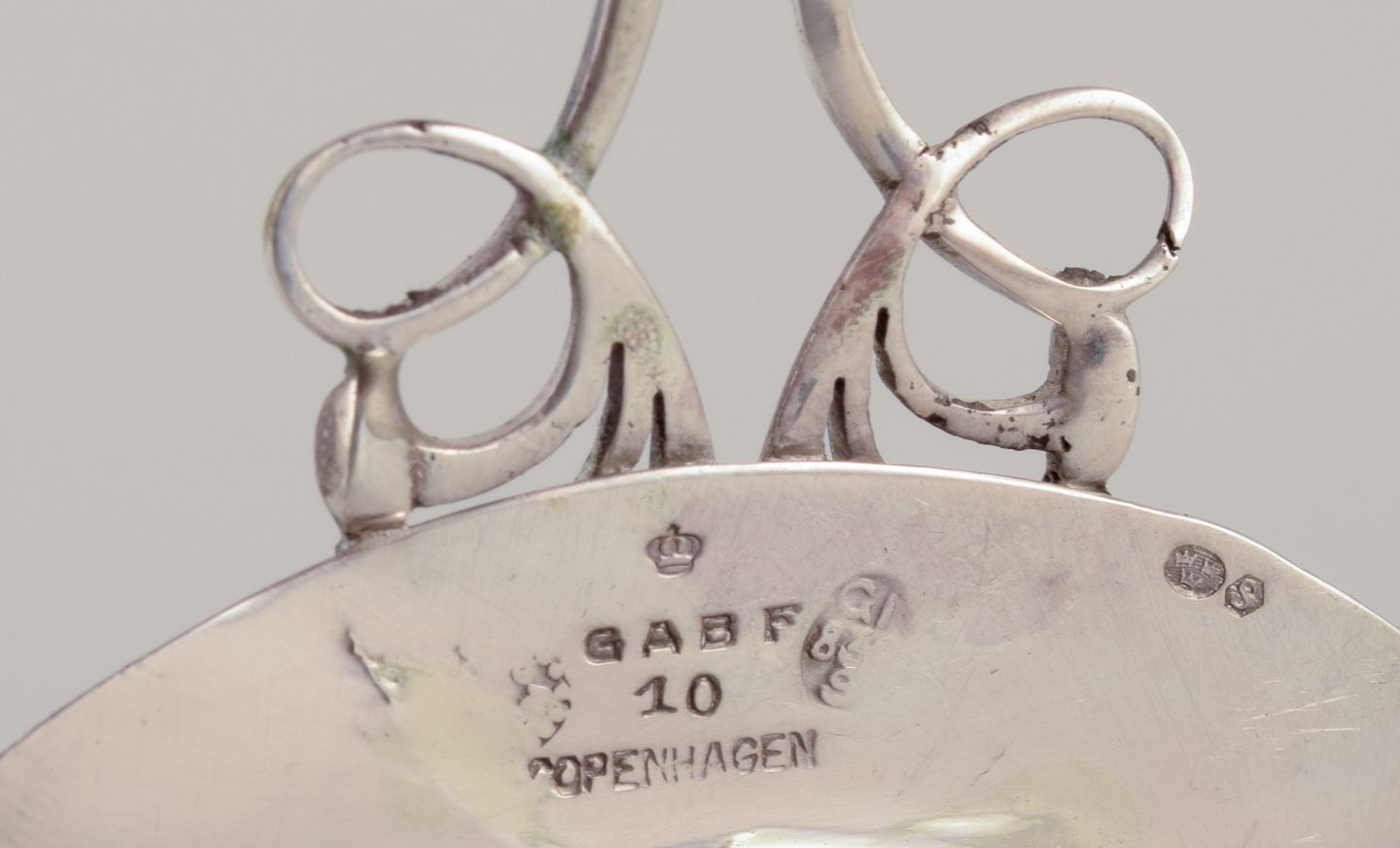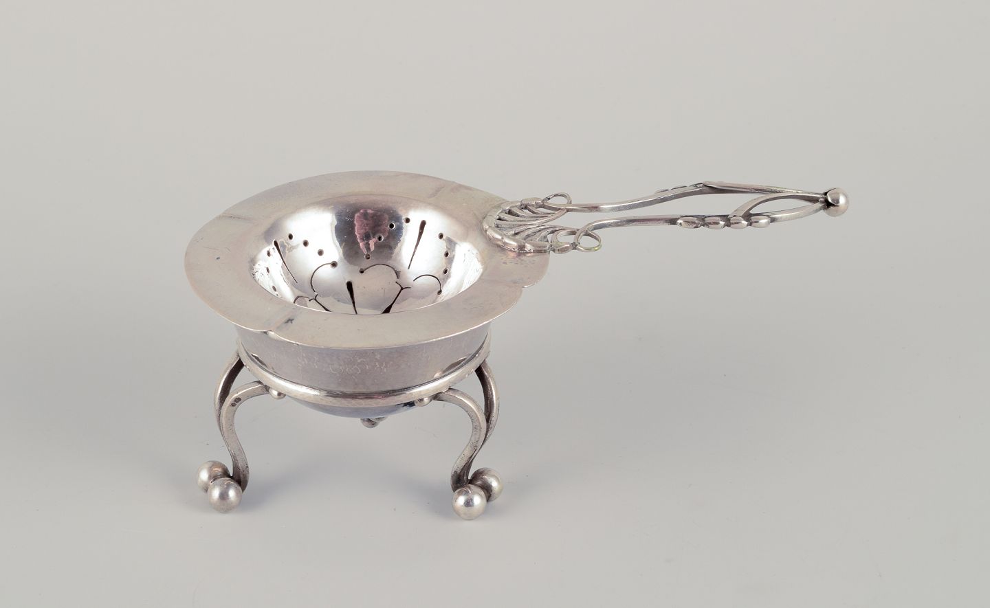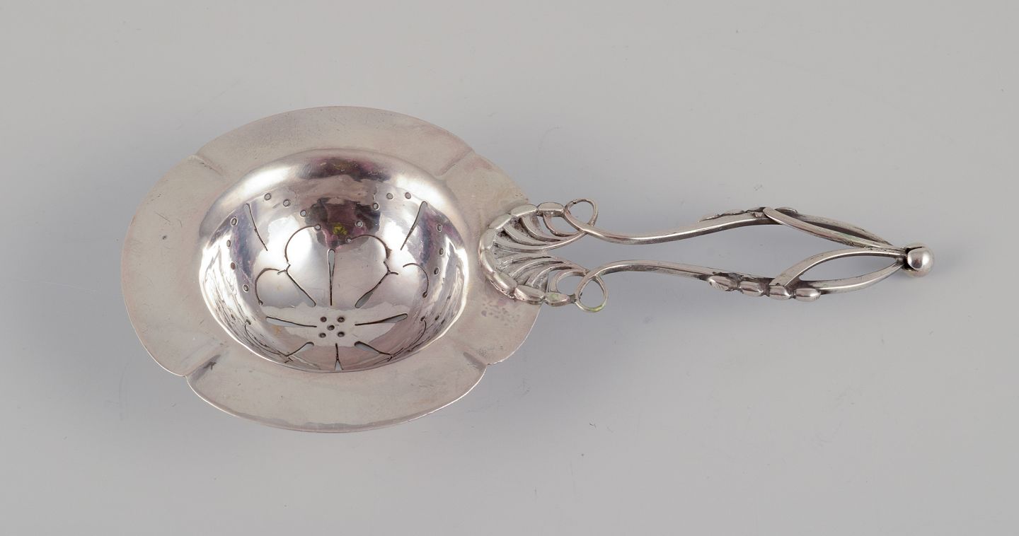 Georg Jensen dessin 10, tidlig tesi med holder i tretårnet sølv. Stemplet med 1915-1932 stempel samt svenske importstempler. I flot stand. Si: L 15,5 cm. x H 2,0 cm. Holder: D 7,5 cm. x H 5,5 cm.