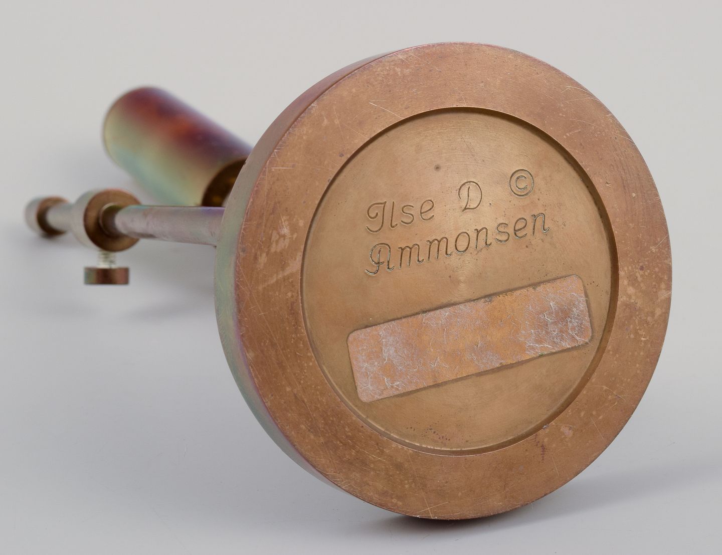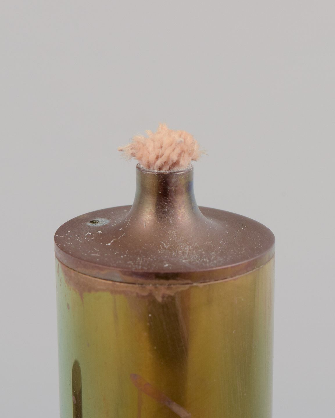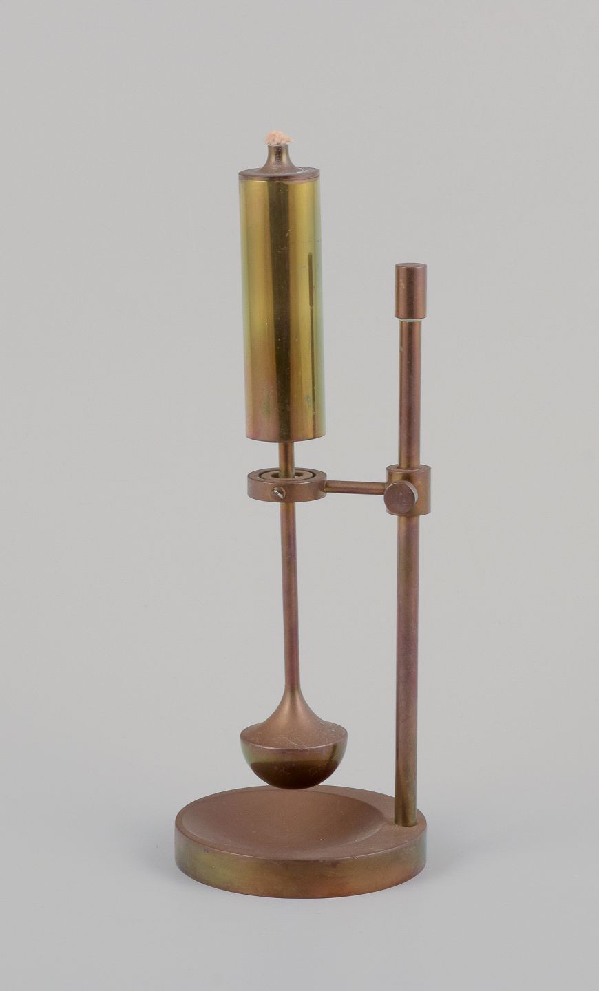 Ilse Ammundsen, petroleumsstage i messing. Dansk design. Midt 1900-tallet. Modernistisk stil. Stemplet. I flot stand. Mål: H 22,5 cm. x D 8,0 cm.