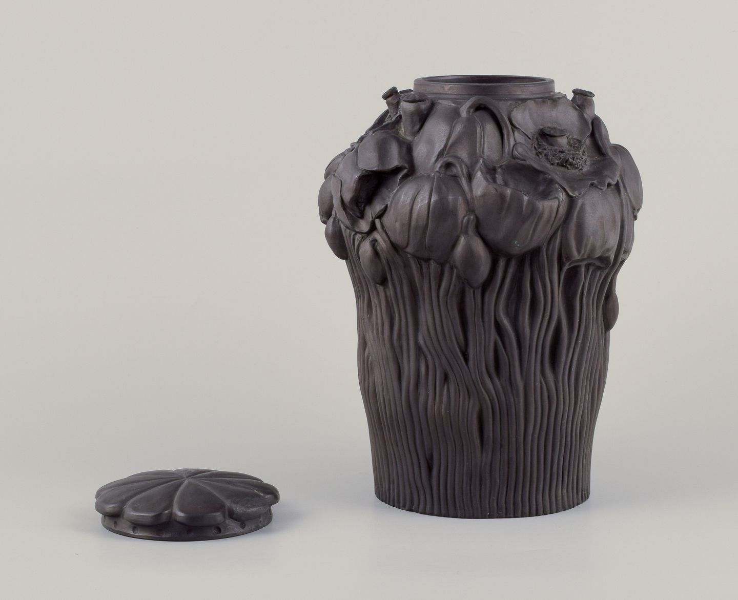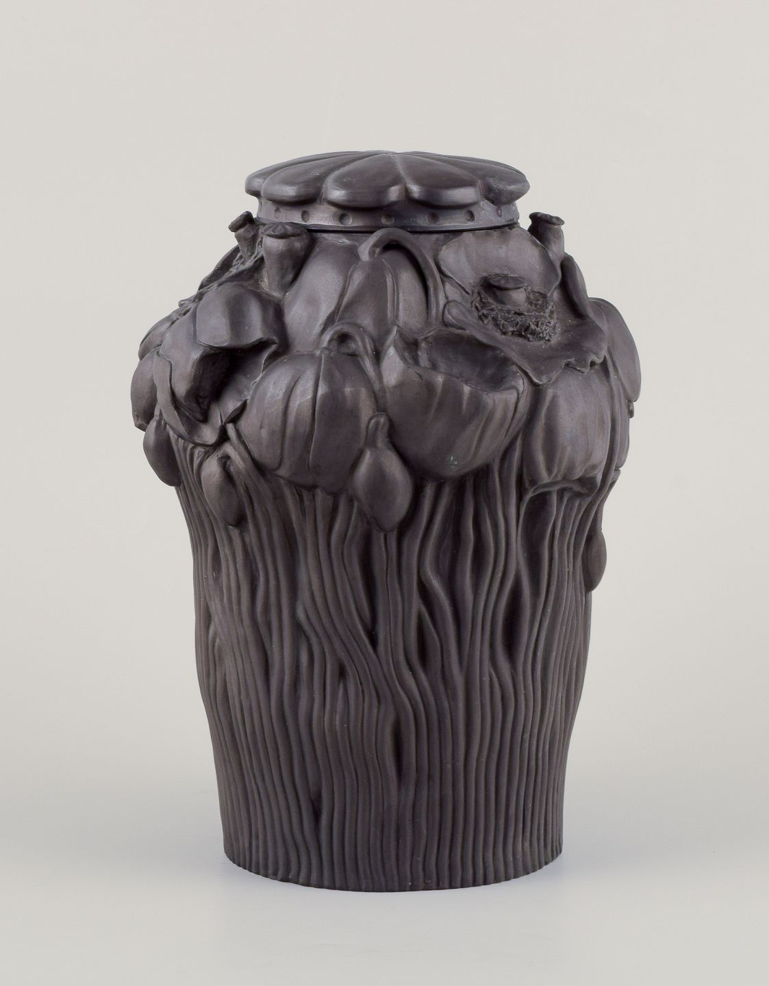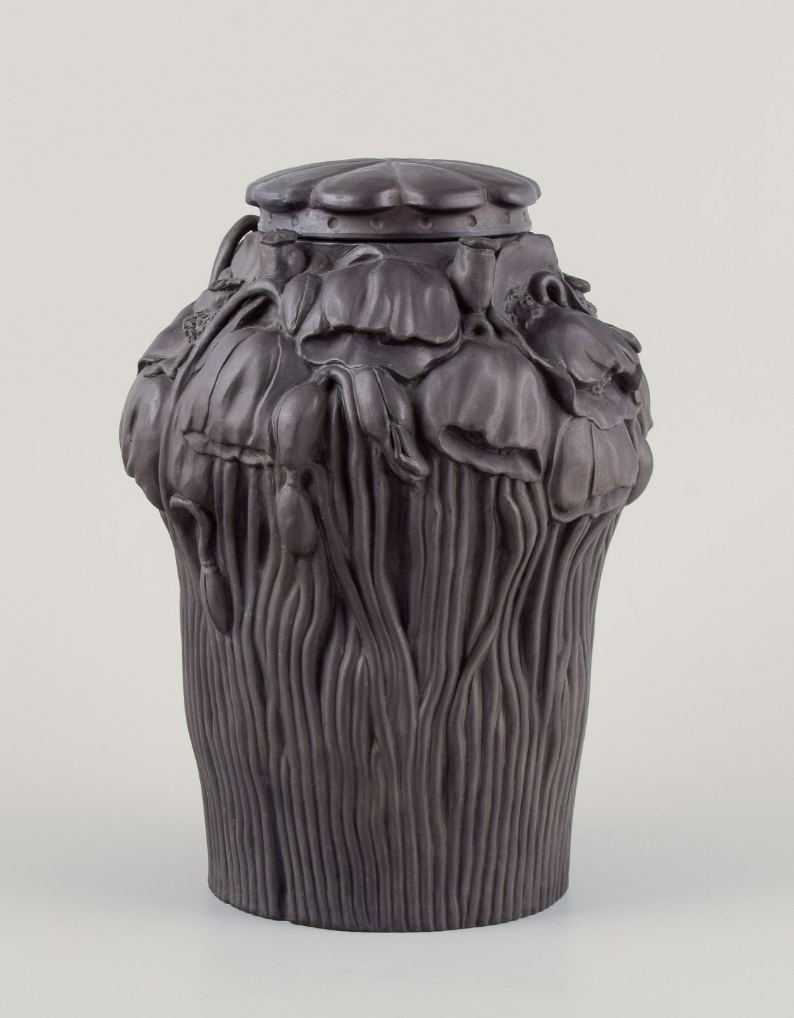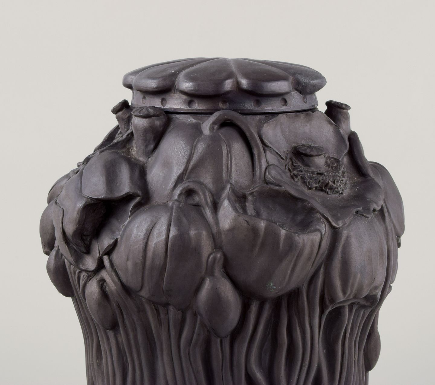 Hjorth, Bornholm. Stor skønvirke lågkrukke i sort terrakotta med blomstermotiv. Tidligt 1900-tallet. Modelnummer 798. Stemplet. I flot stand med minimalt brugspræg. Mål: H 27,0 cm. x D 18,0 cm.