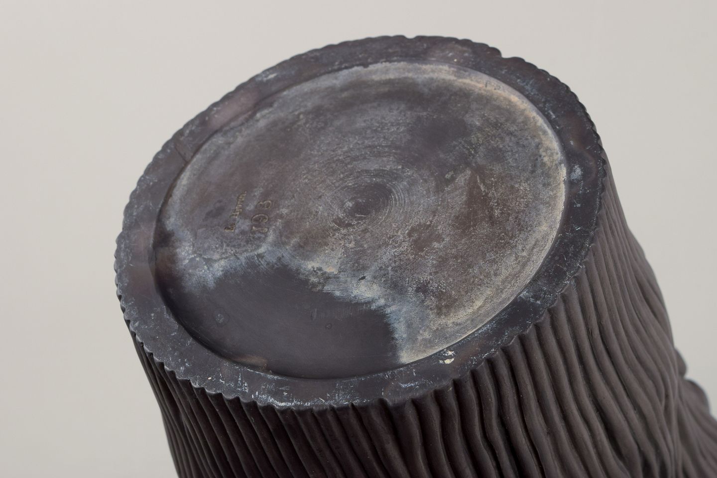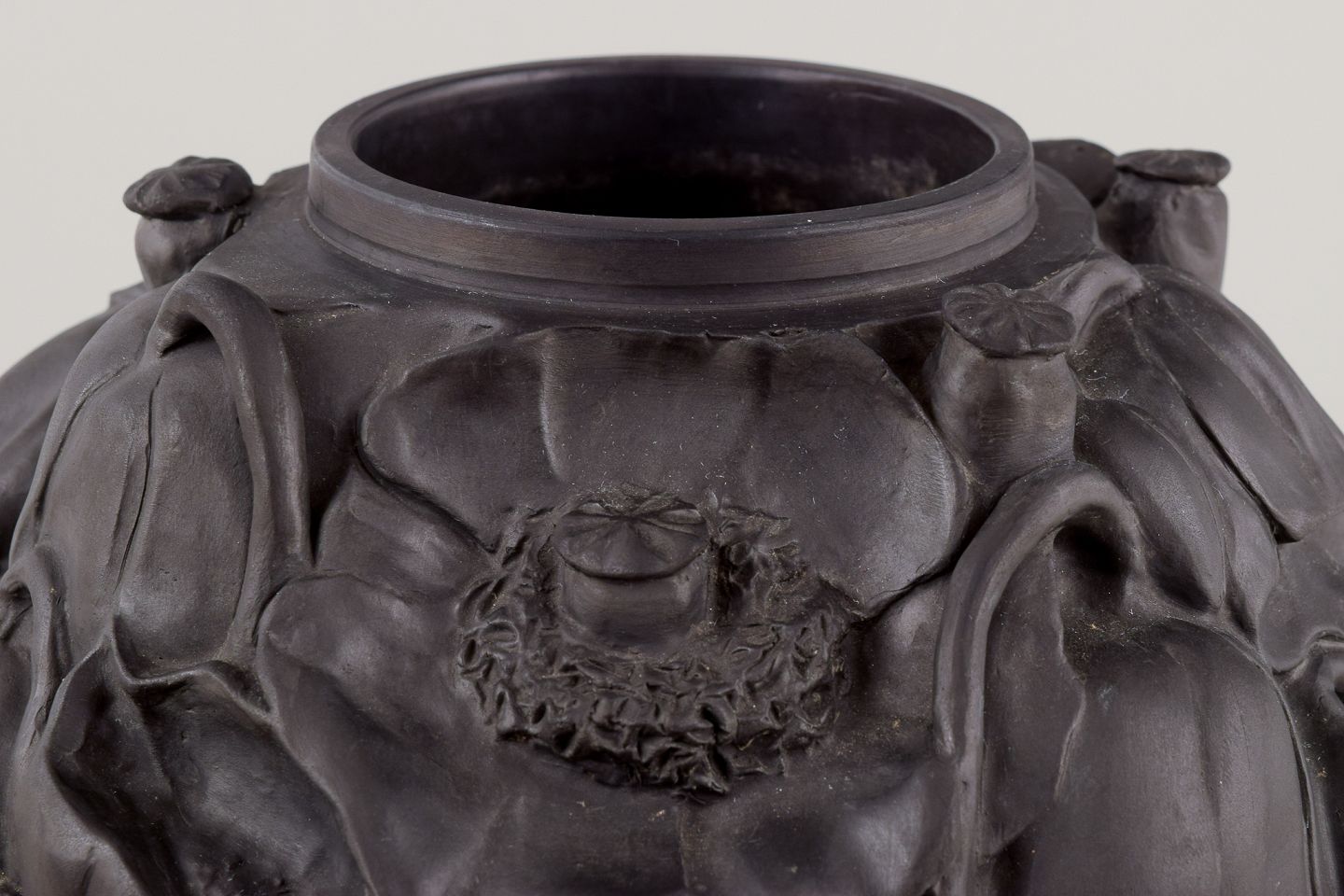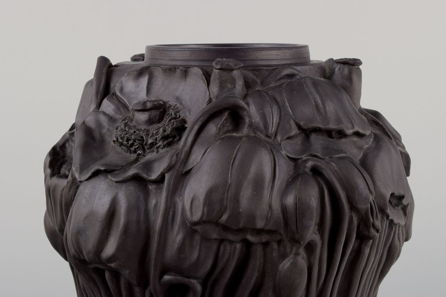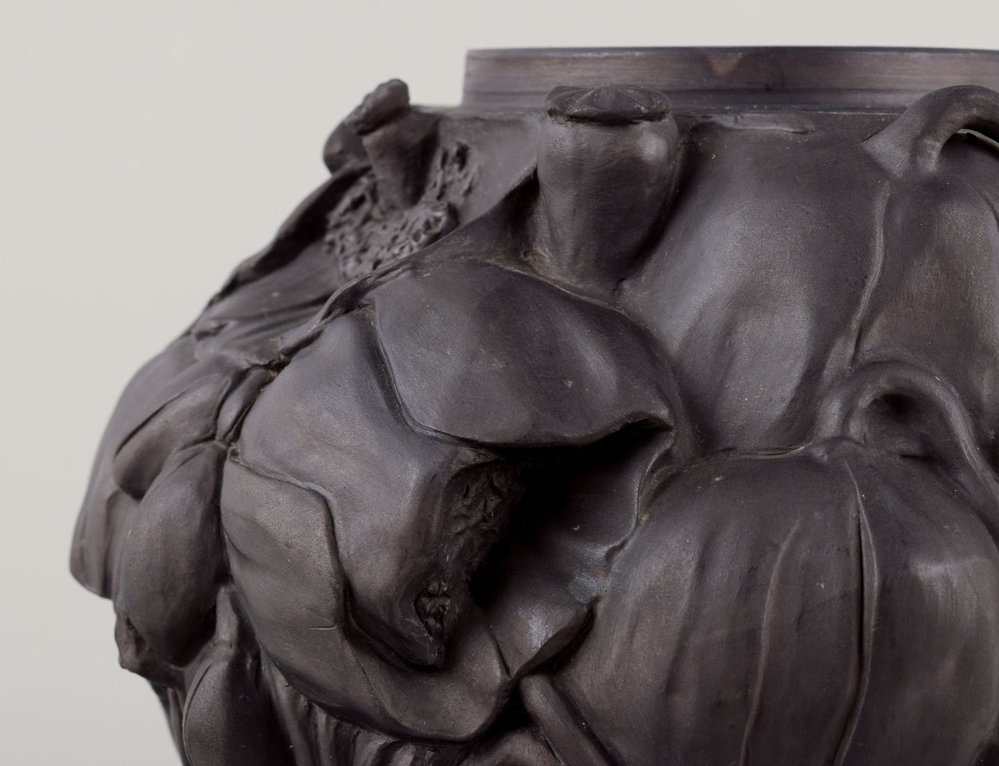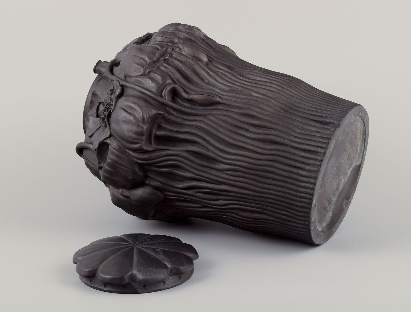 Hjorth, Bornholm. Stor skønvirke lågkrukke i sort terrakotta med blomstermotiv. Tidligt 1900-tallet. Modelnummer 798. Stemplet. I flot stand med minimalt brugspræg. Mål: H 27,0 cm. x D 18,0 cm.