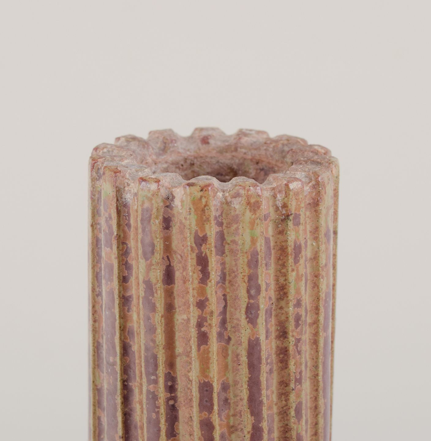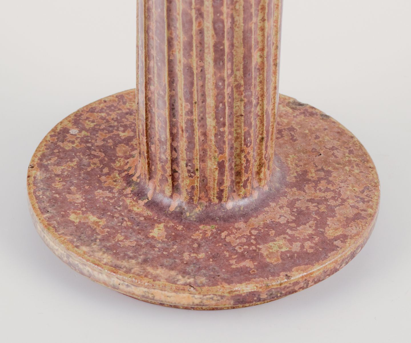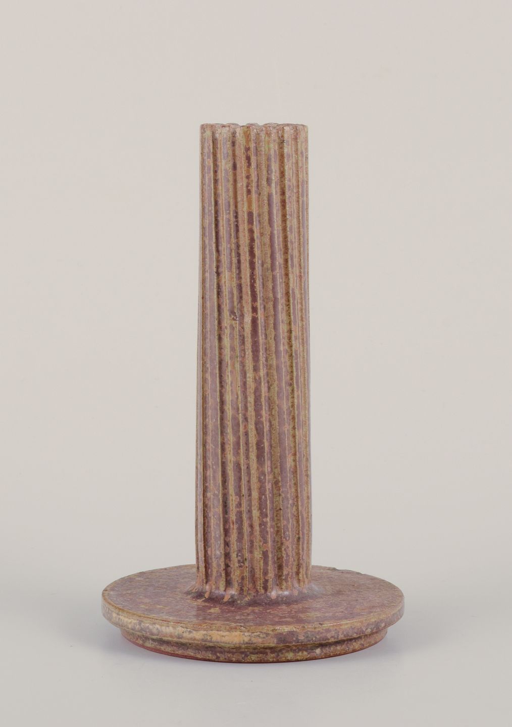 Høj lysestage i glaseret keramik. Rillet korpus med glasur i brune og grønne nuancer.