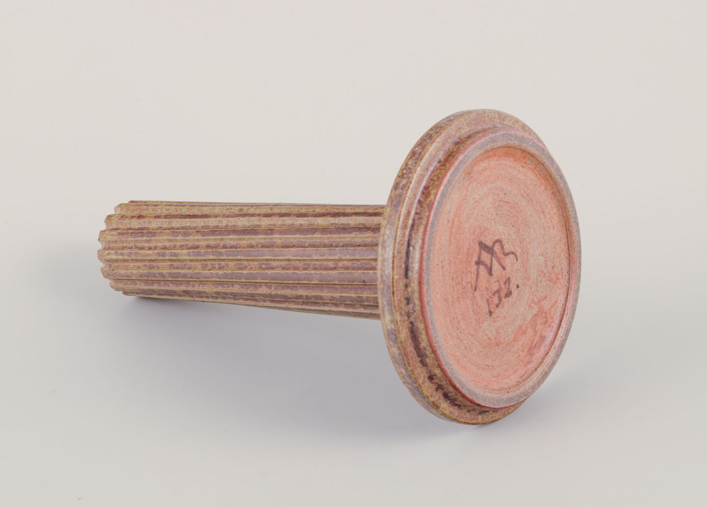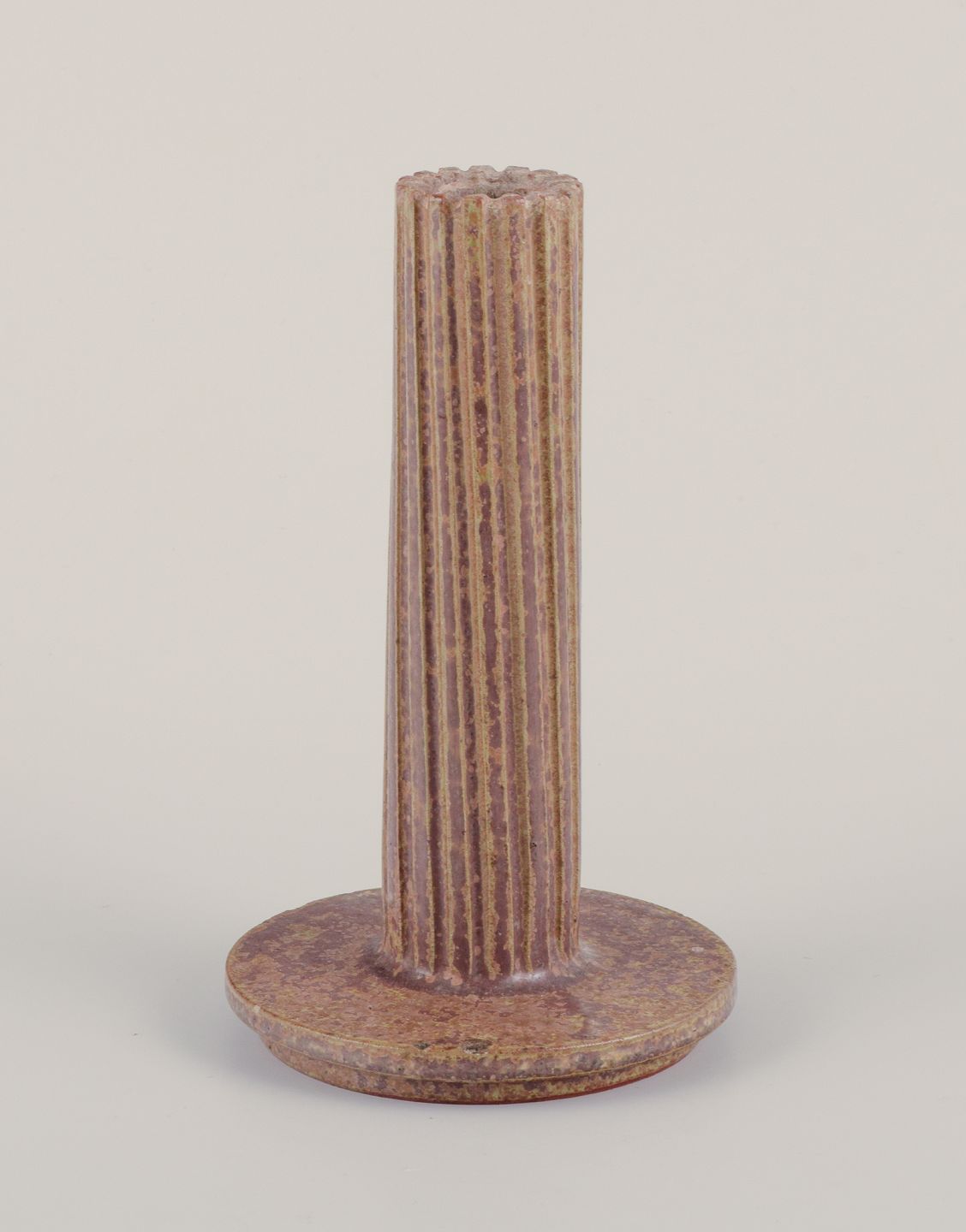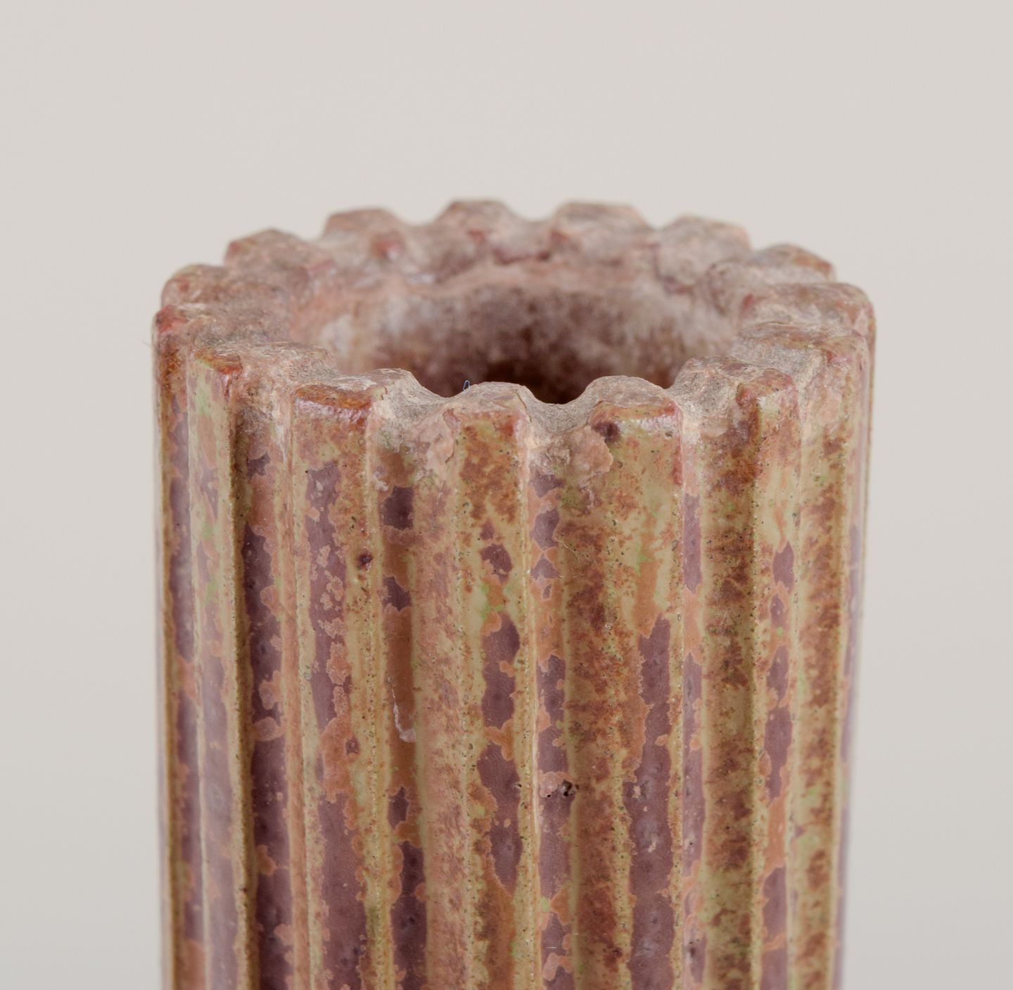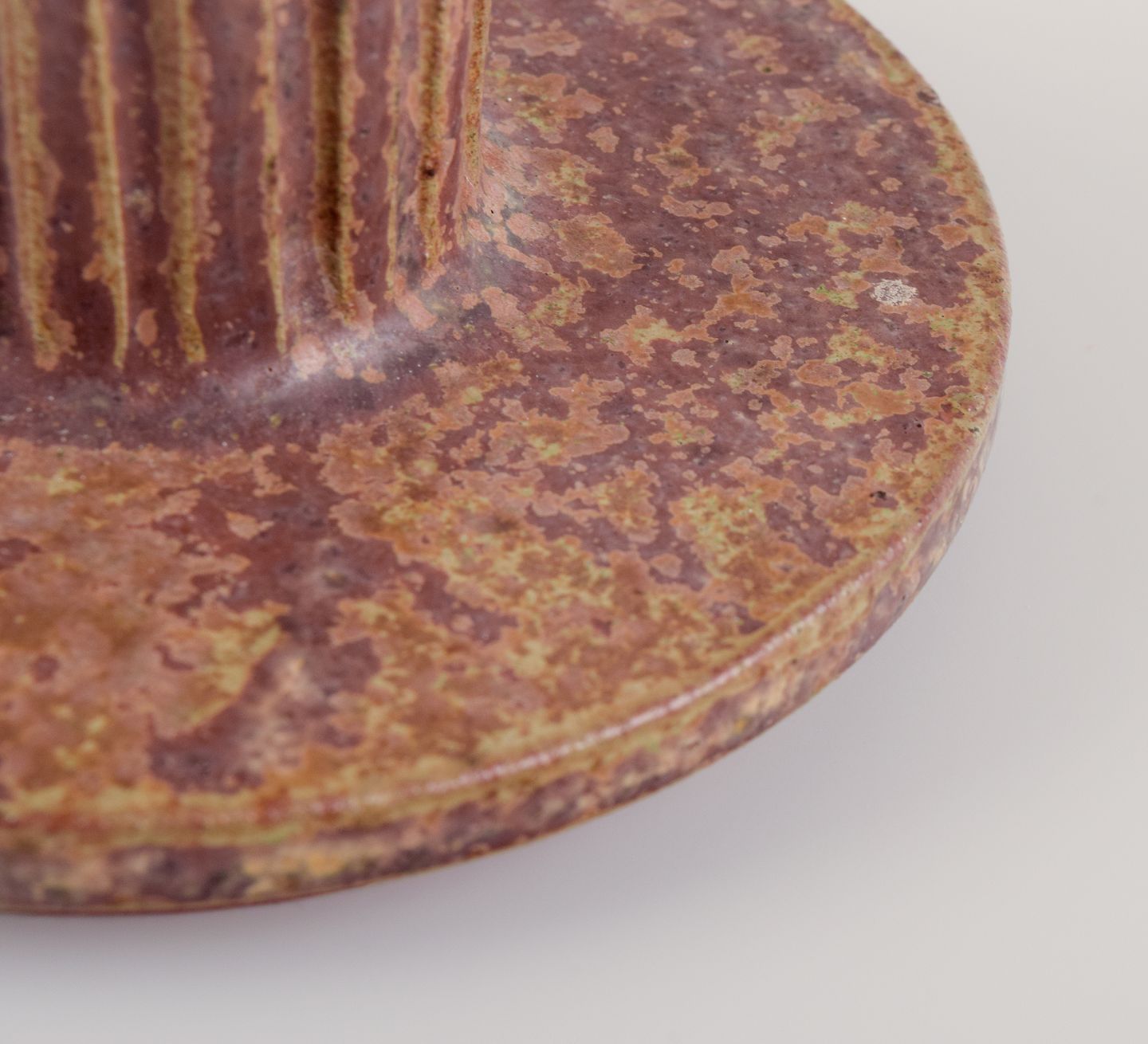 Høj lysestage i glaseret keramik. Rillet korpus med glasur i brune og grønne nuancer.