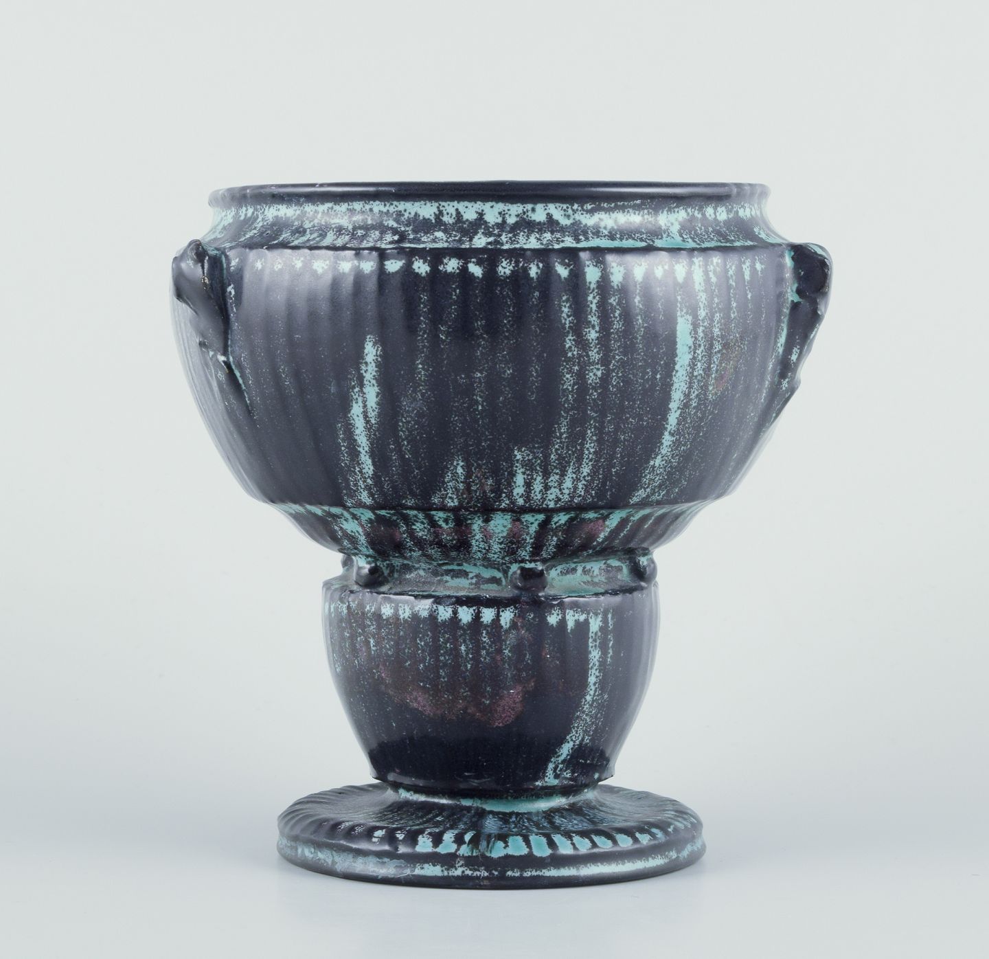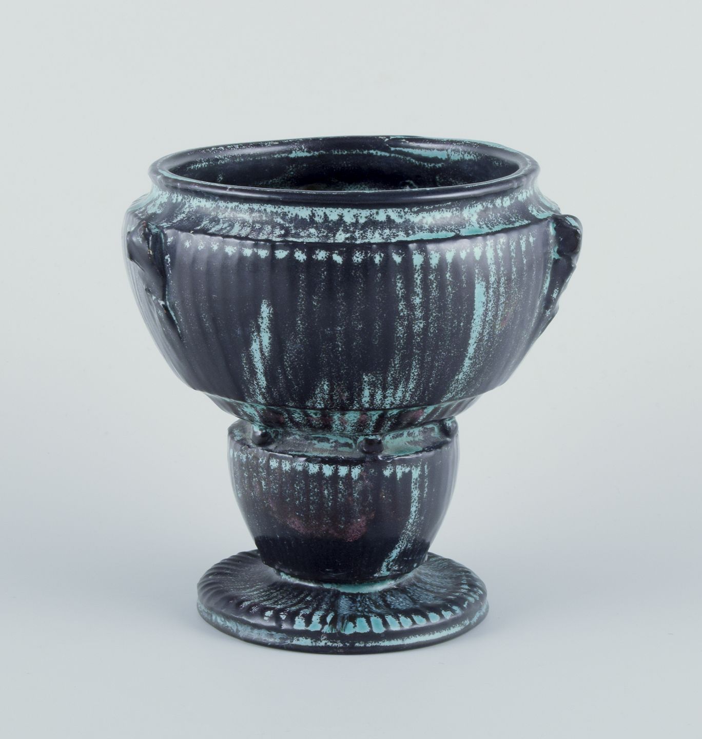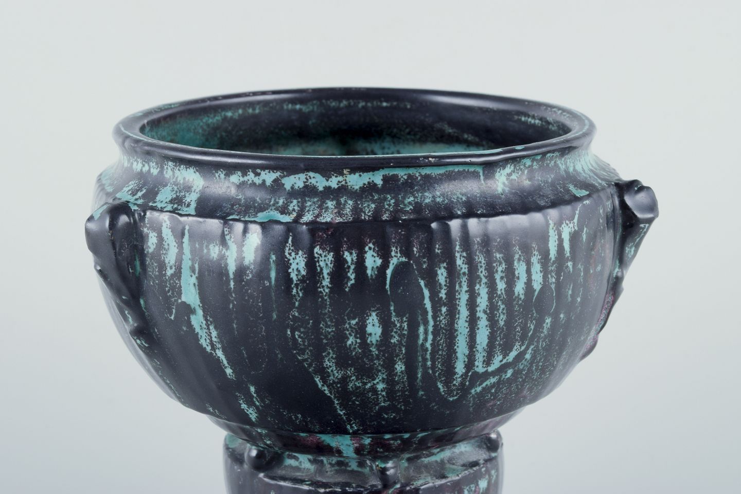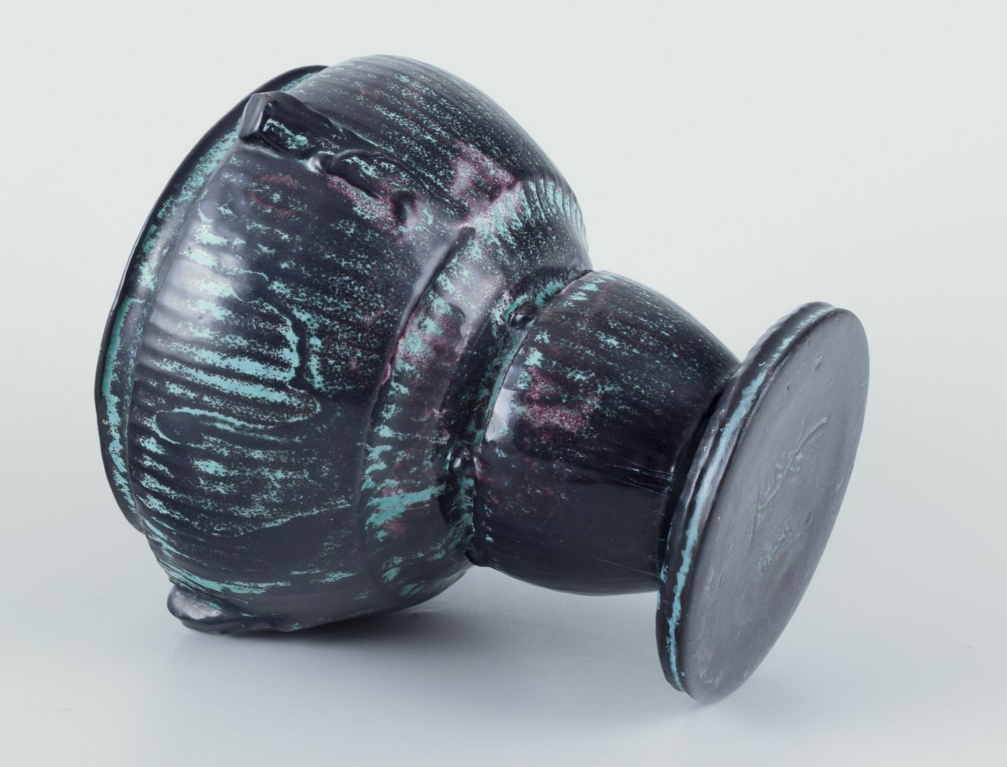 Keramikvase i grønsort dobbeltglasur med rødlige indslag.