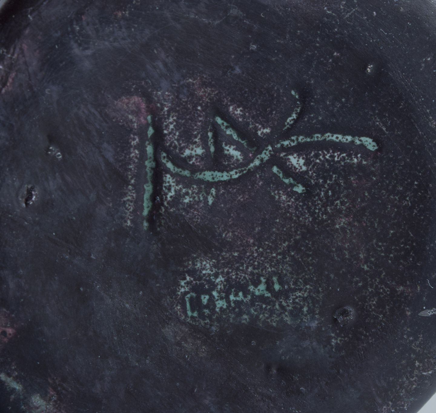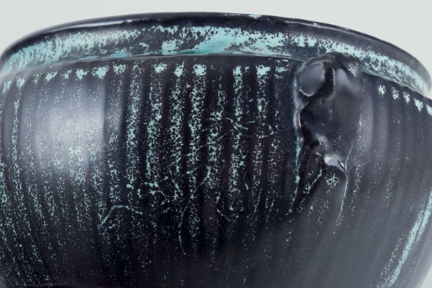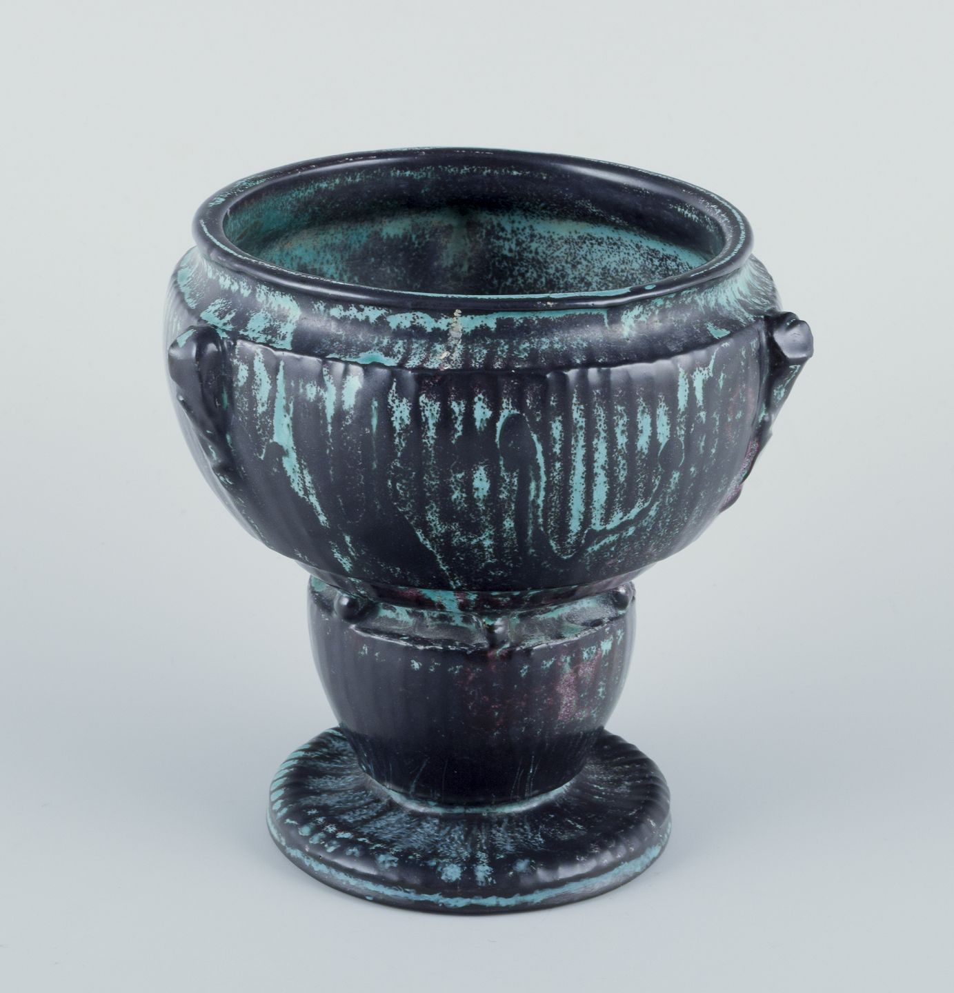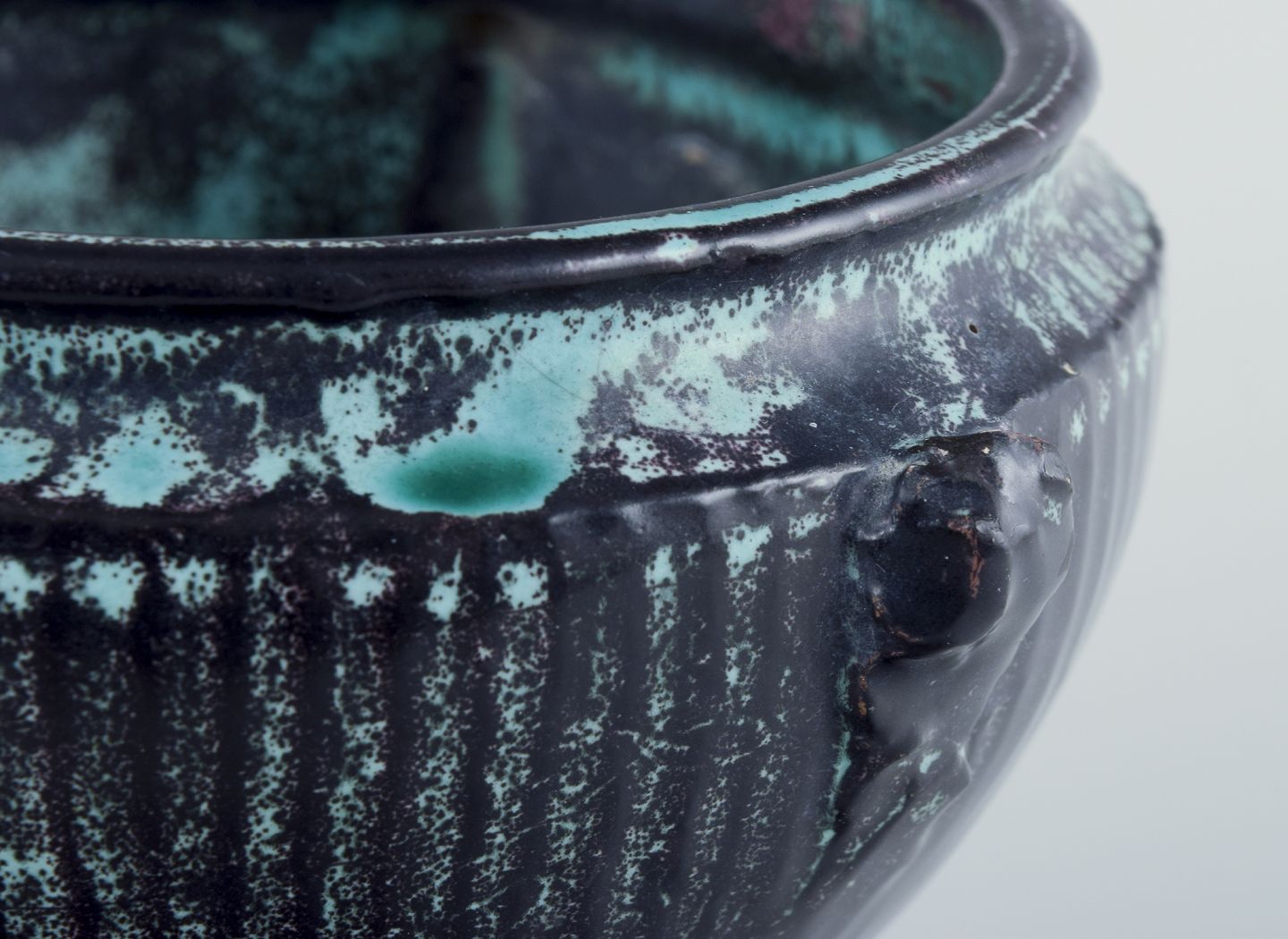 Keramikvase i grønsort dobbeltglasur med rødlige indslag.