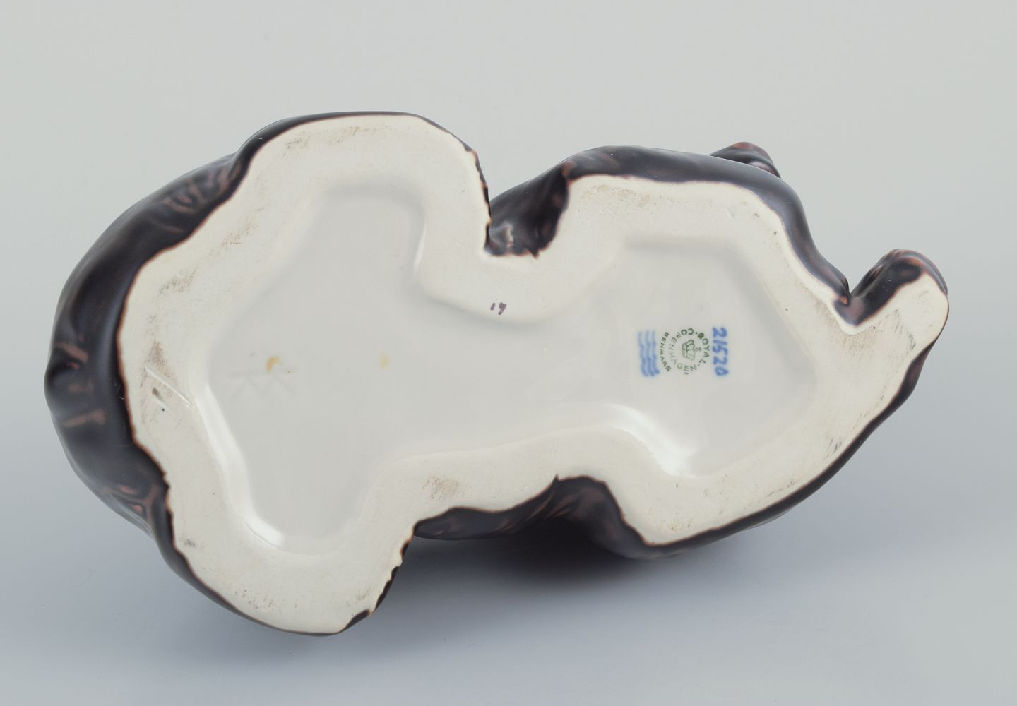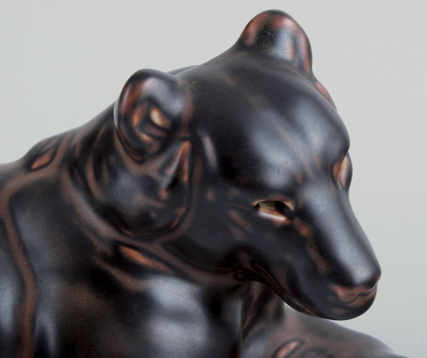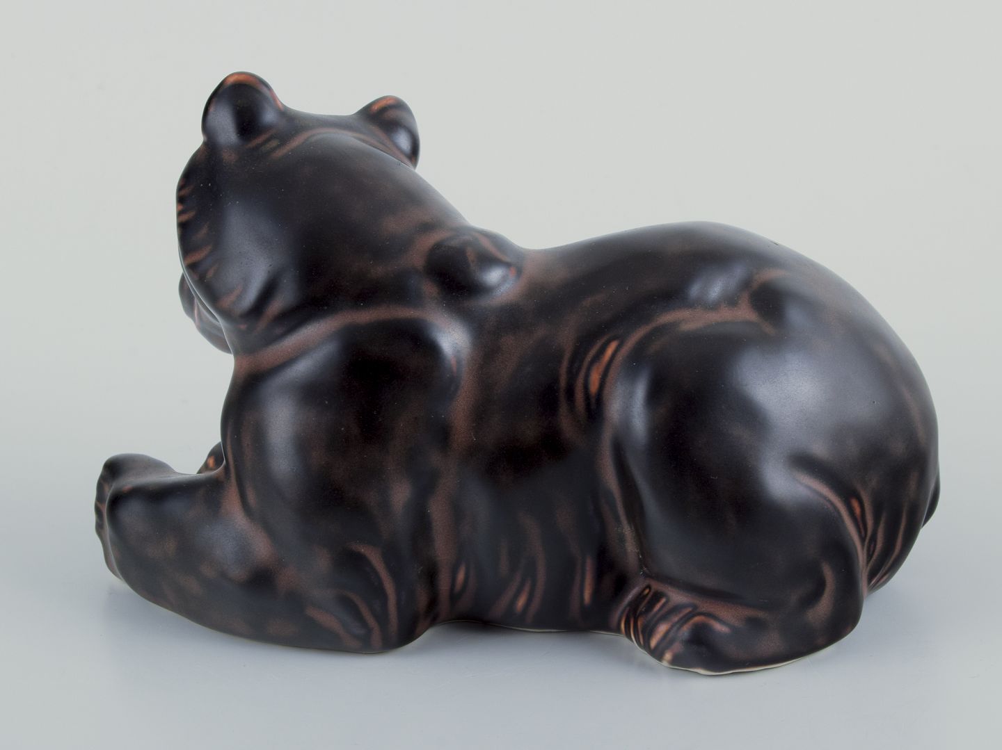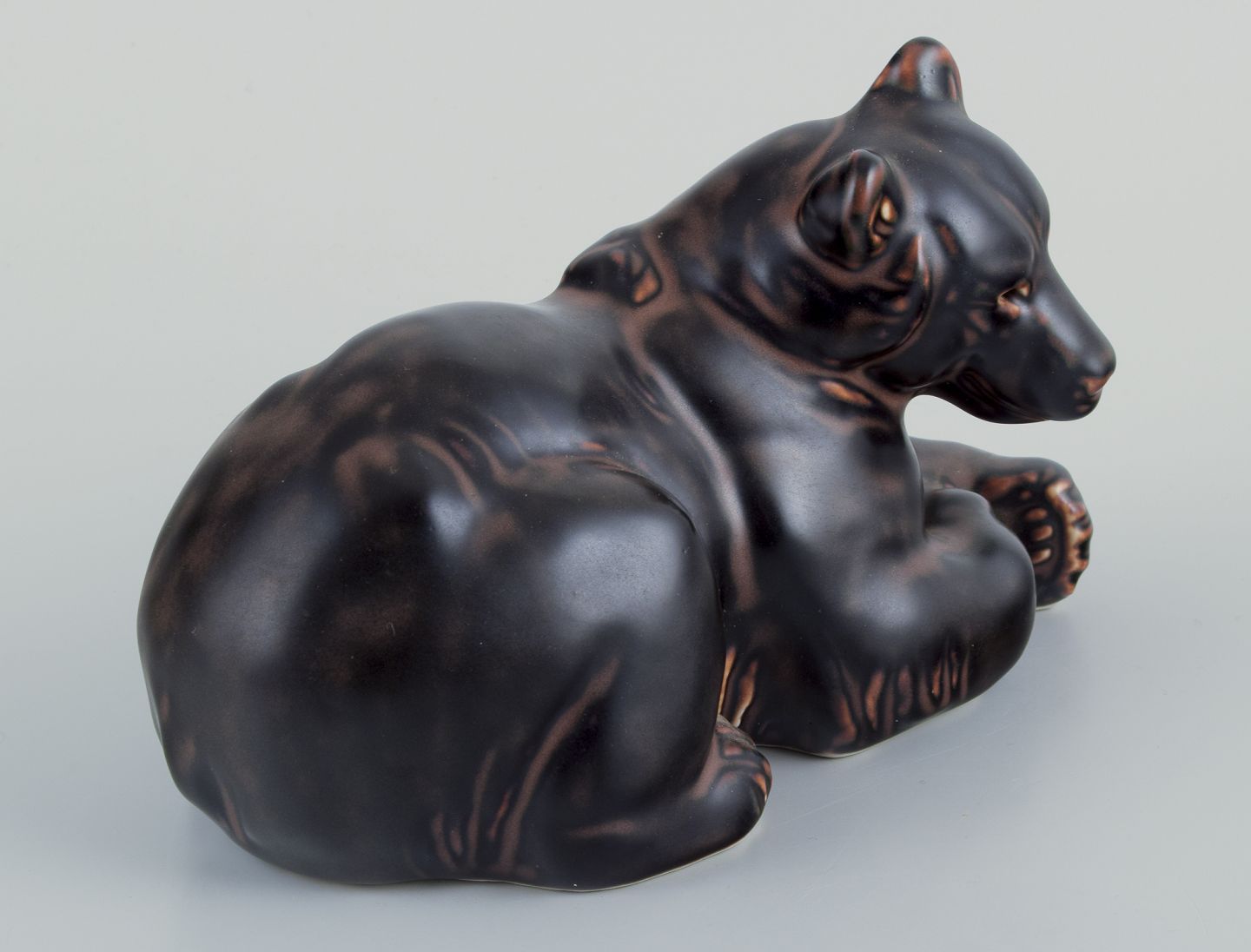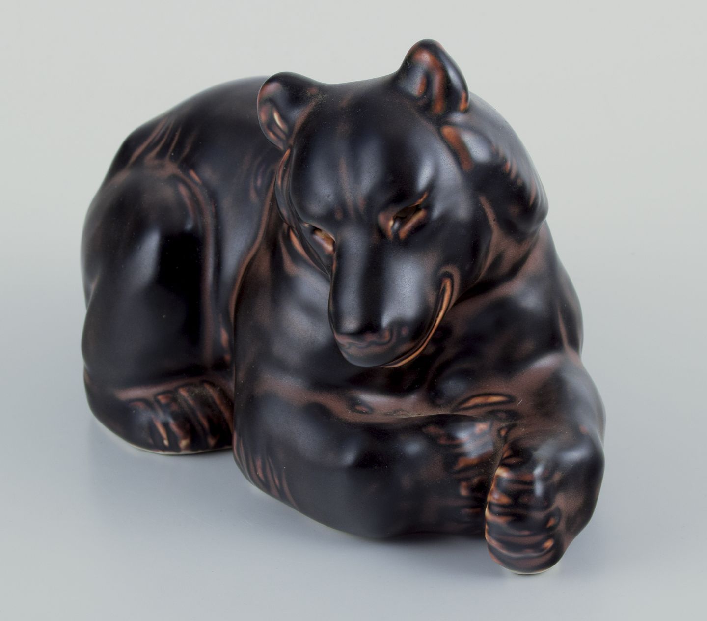 Knud Kyhn for Royal Copenhagen. Stor stentøjsfigur af brunbjørn. Glasur i brune nuancer. Modelnummer: 21520. 1930’erne. Stemplet. Perfekt stand. Første sortering. Mål: L 21,0 cm. x H 13,0 cm.