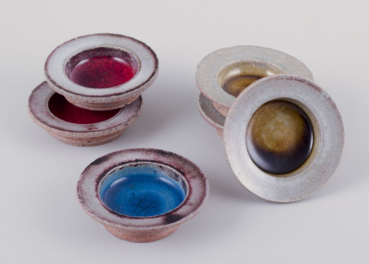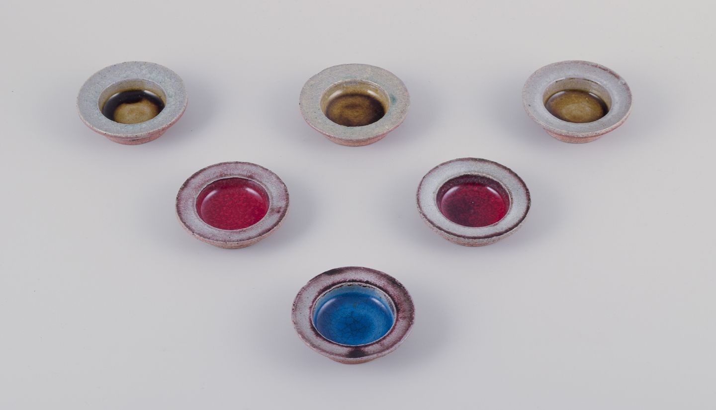 Et sæt på seks små skåle af stentøj.