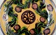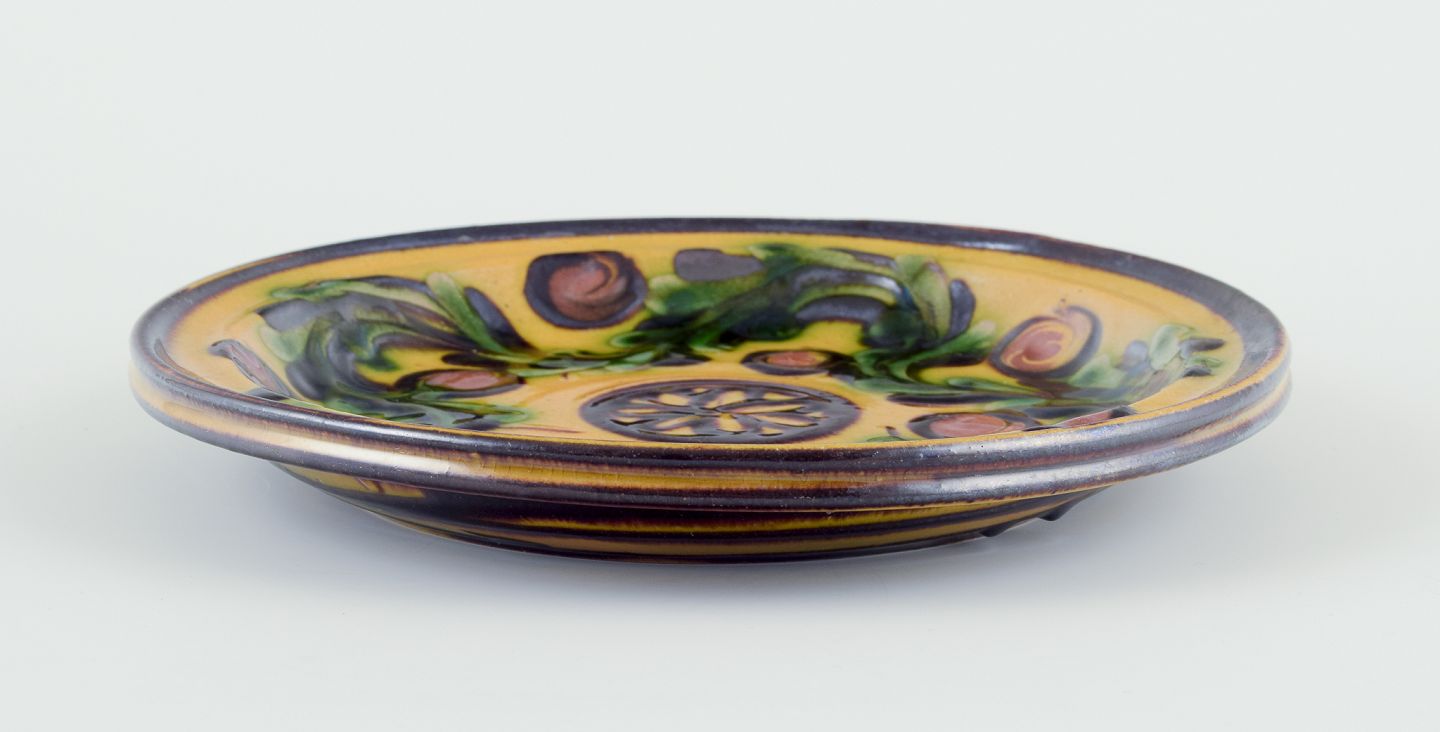 Fad/vægrelief af keramik med blomstermotiv. Glasur i grønne og sorte toner på okkergul bund.