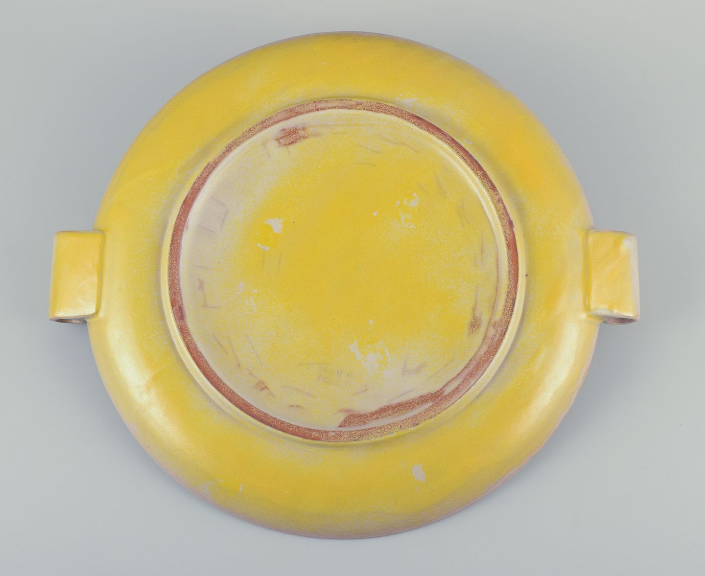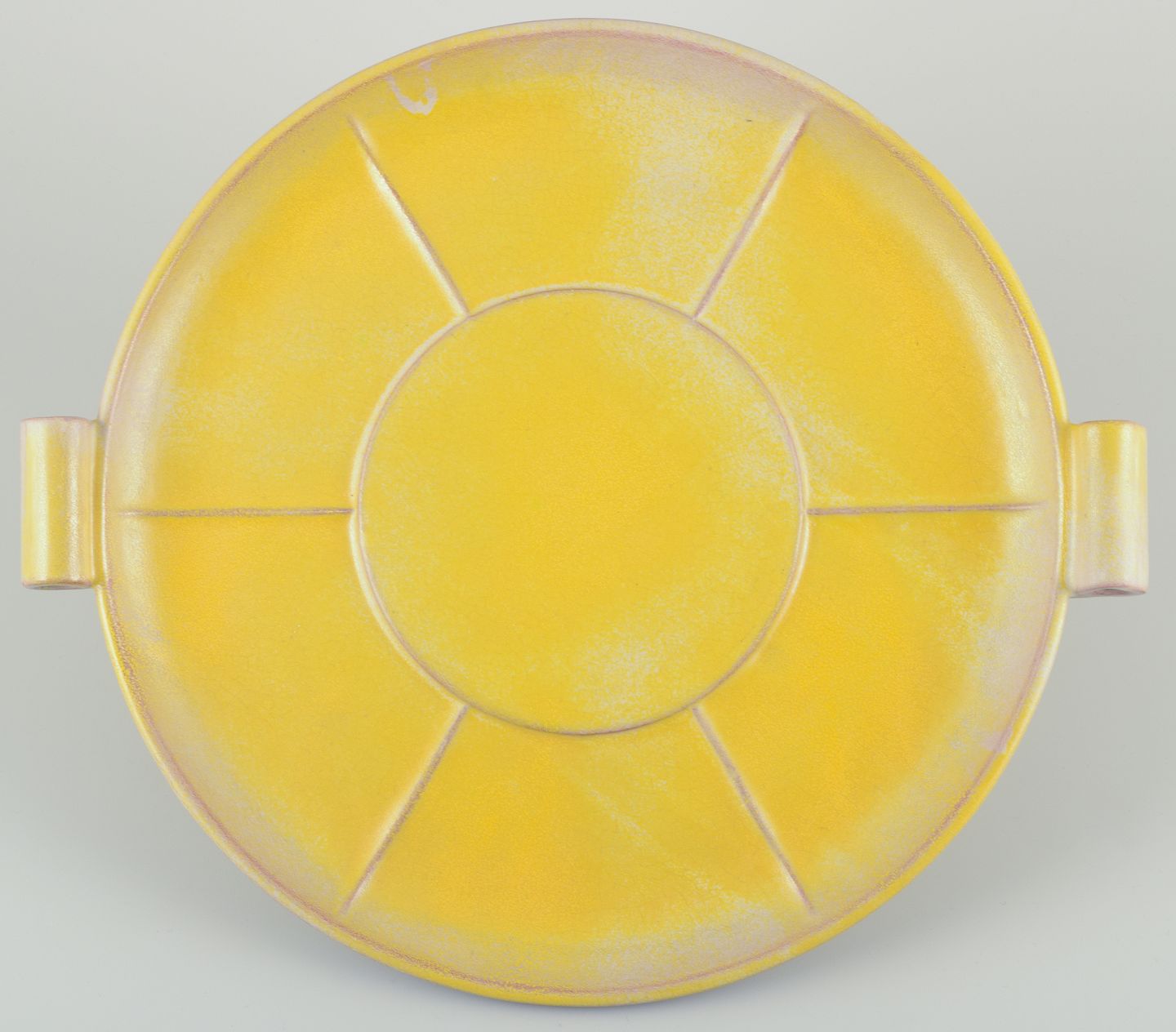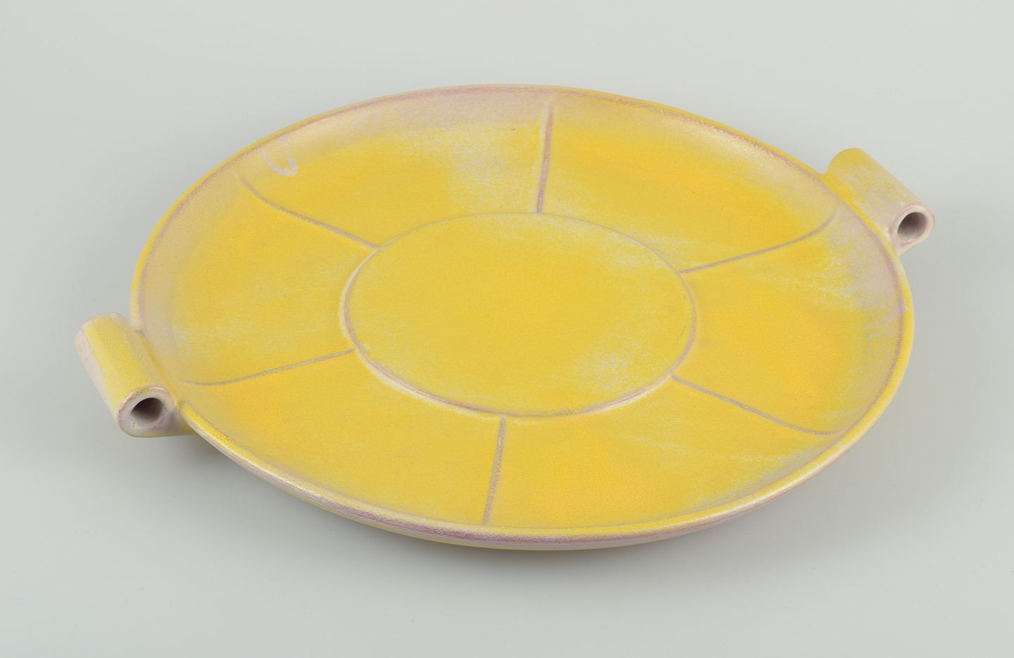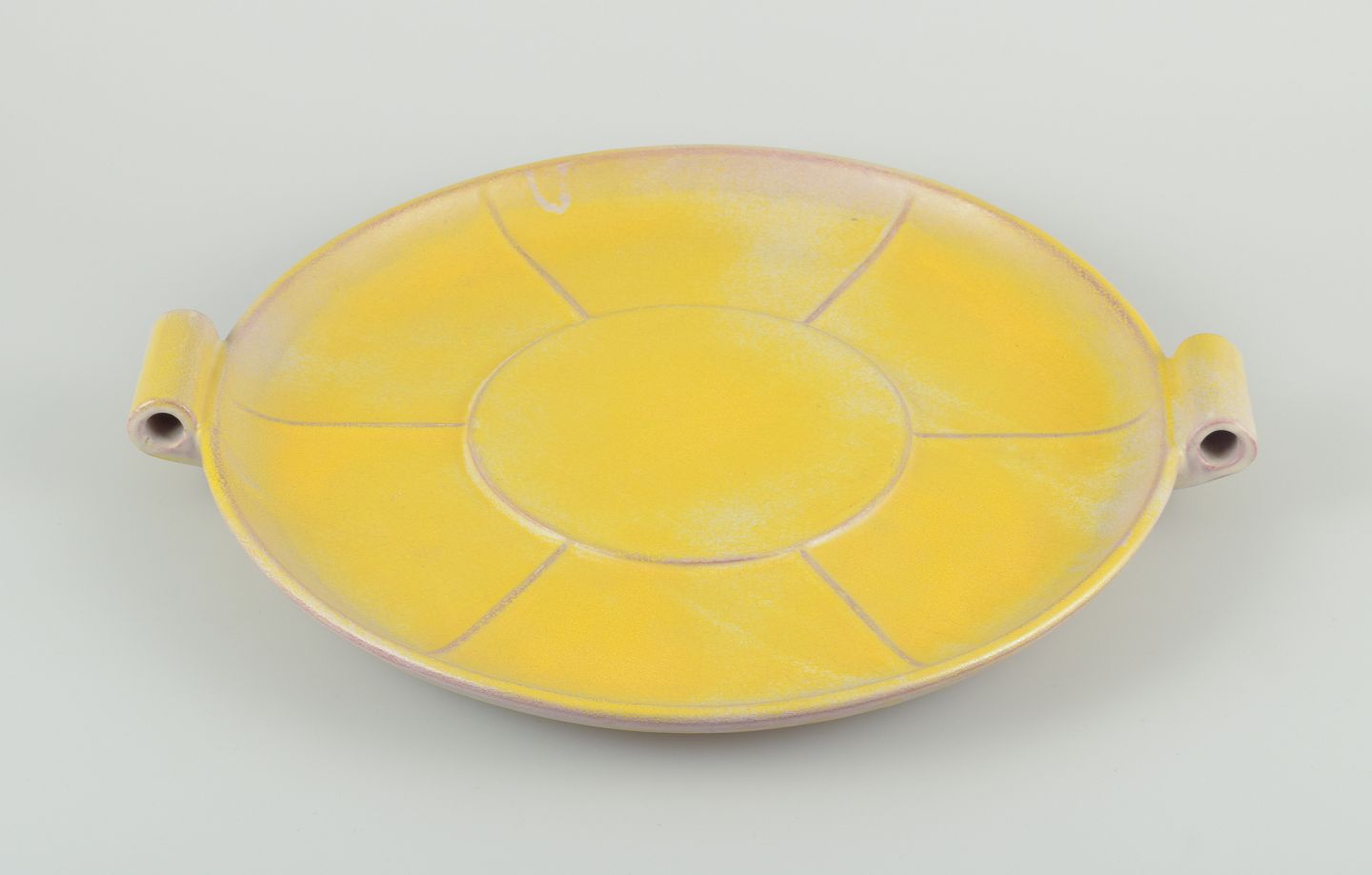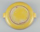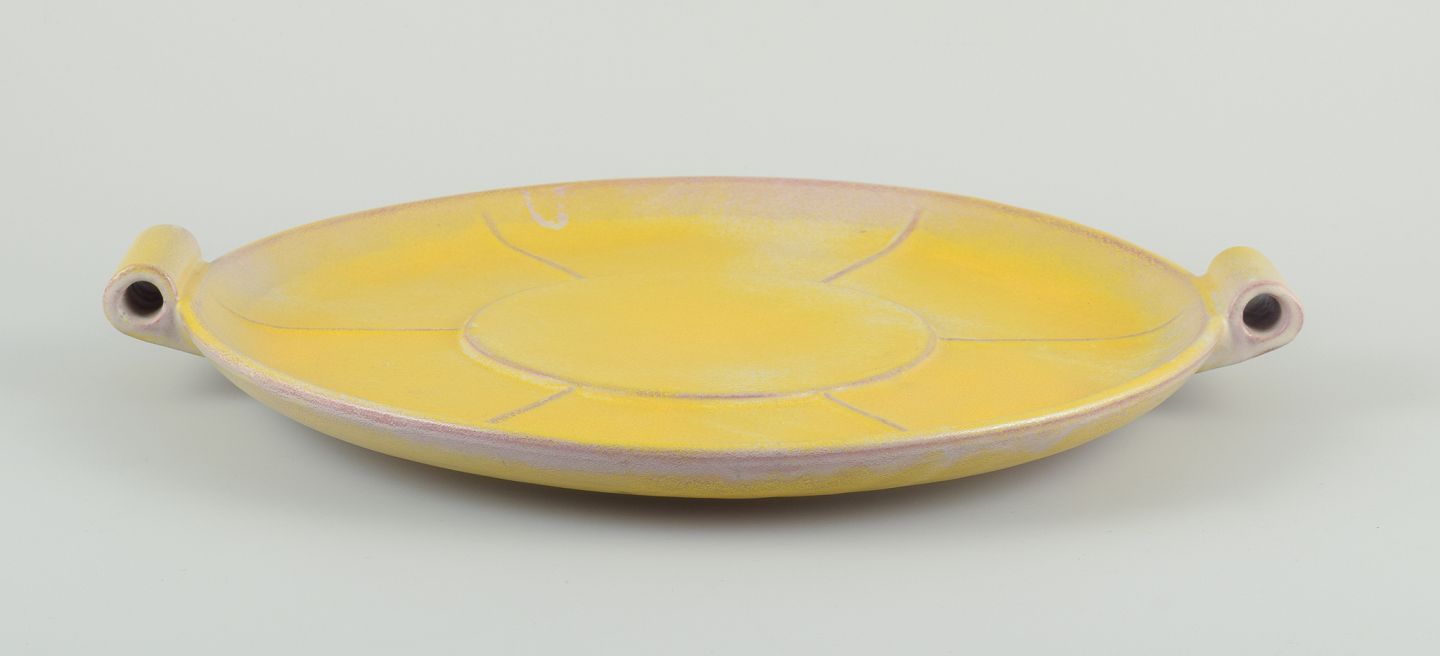 Finsk keramikfad i Art Deco-stil. Med to hanke. Gul glasur. Håndmalet. Stemplet ”Made in Finland”. I flot stand, to minimale afslag i glasuren på den ene hank. Se foto. Mål: D 39,0 cm. x H 4,5 cm.