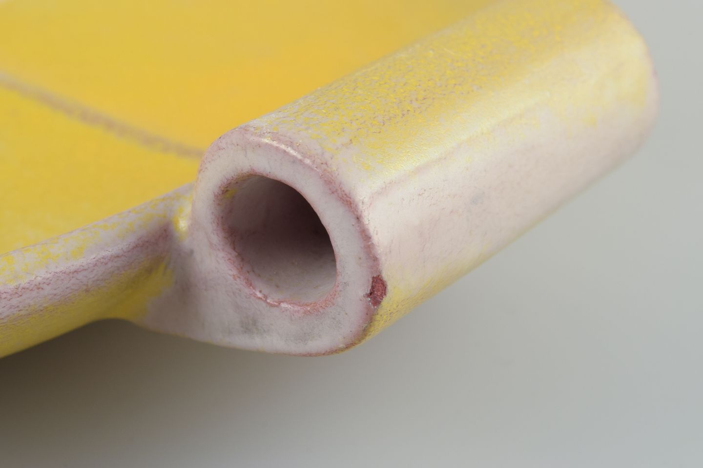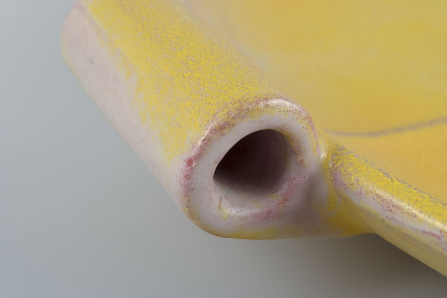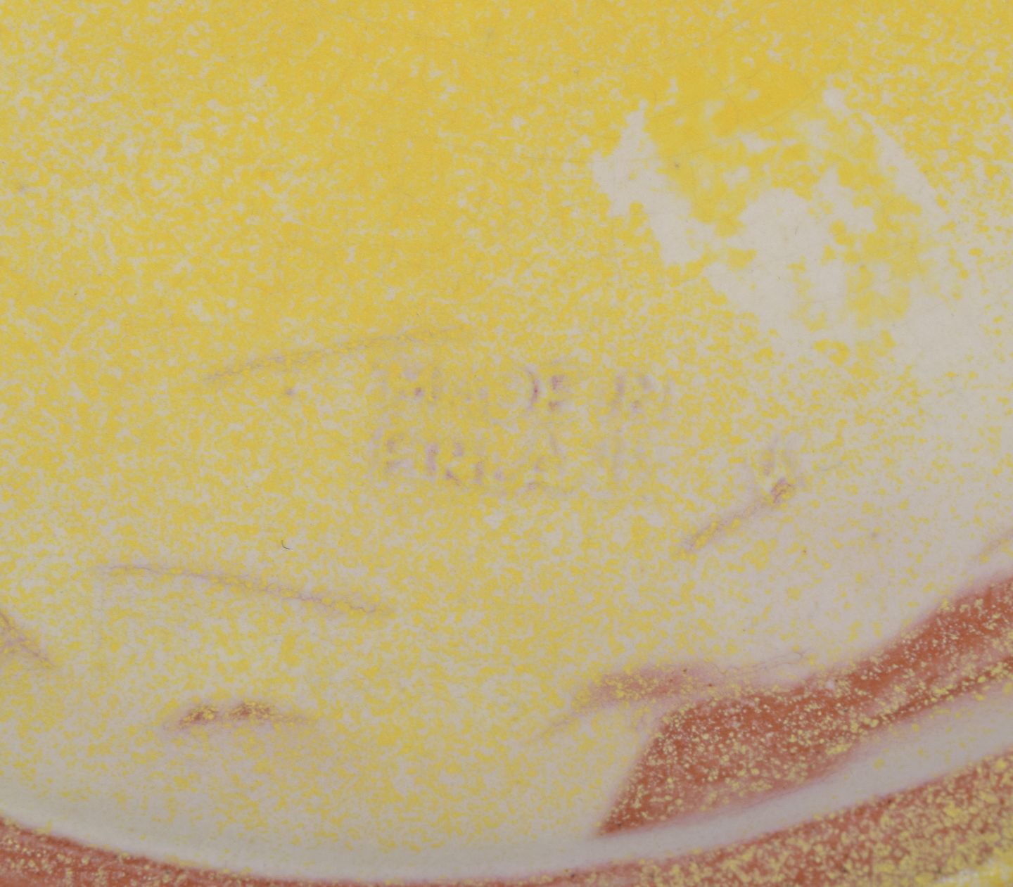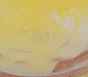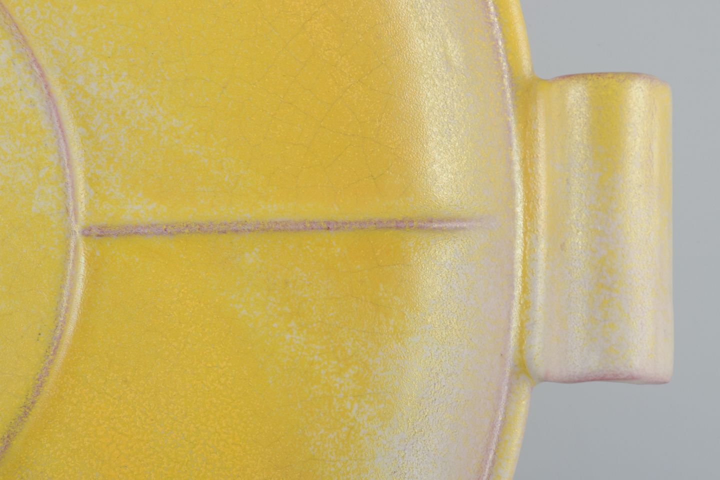 Finsk keramikfad i Art Deco-stil. Med to hanke. Gul glasur. Håndmalet. Stemplet ”Made in Finland”. I flot stand, to minimale afslag i glasuren på den ene hank. Se foto. Mål: D 39,0 cm. x H 4,5 cm.