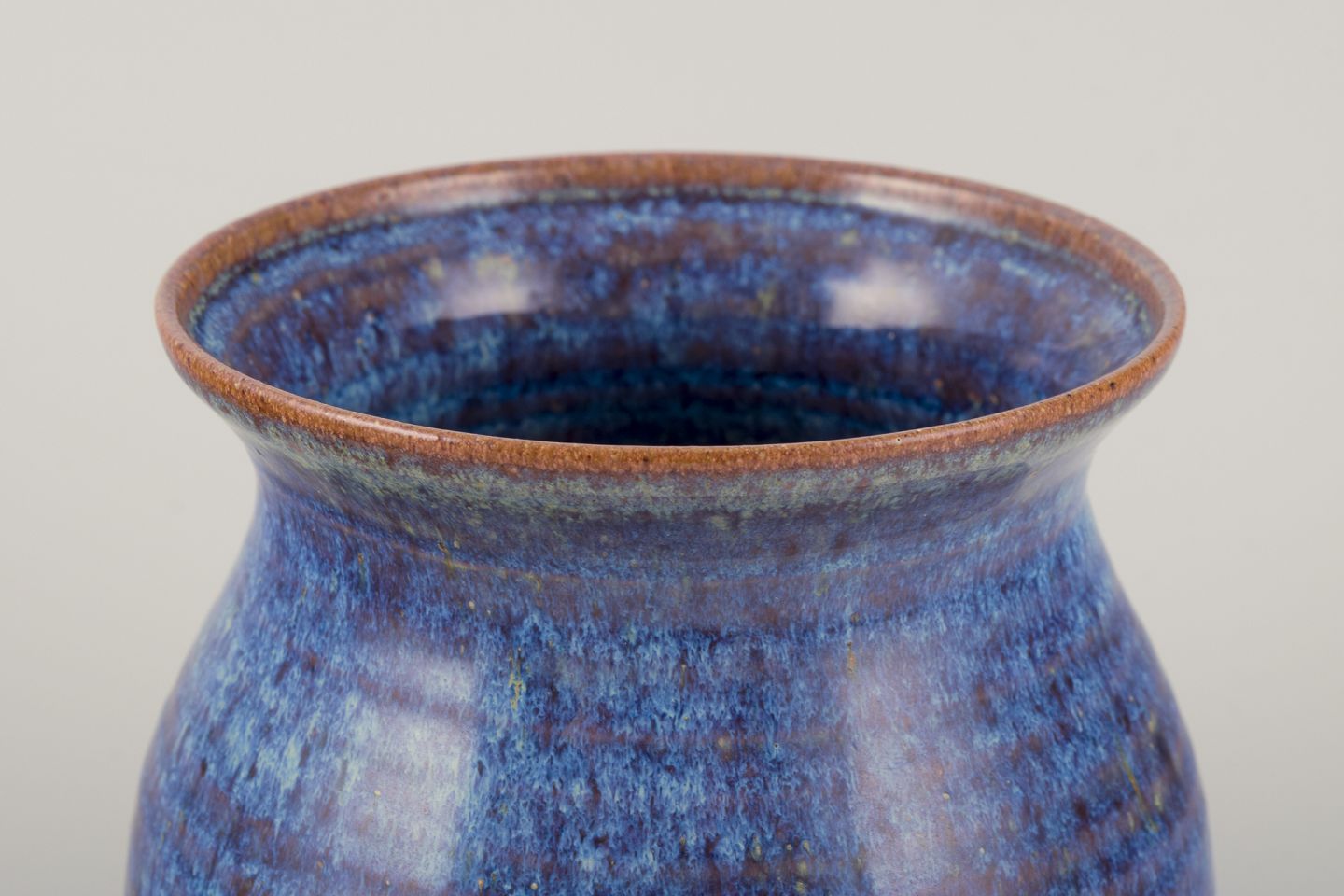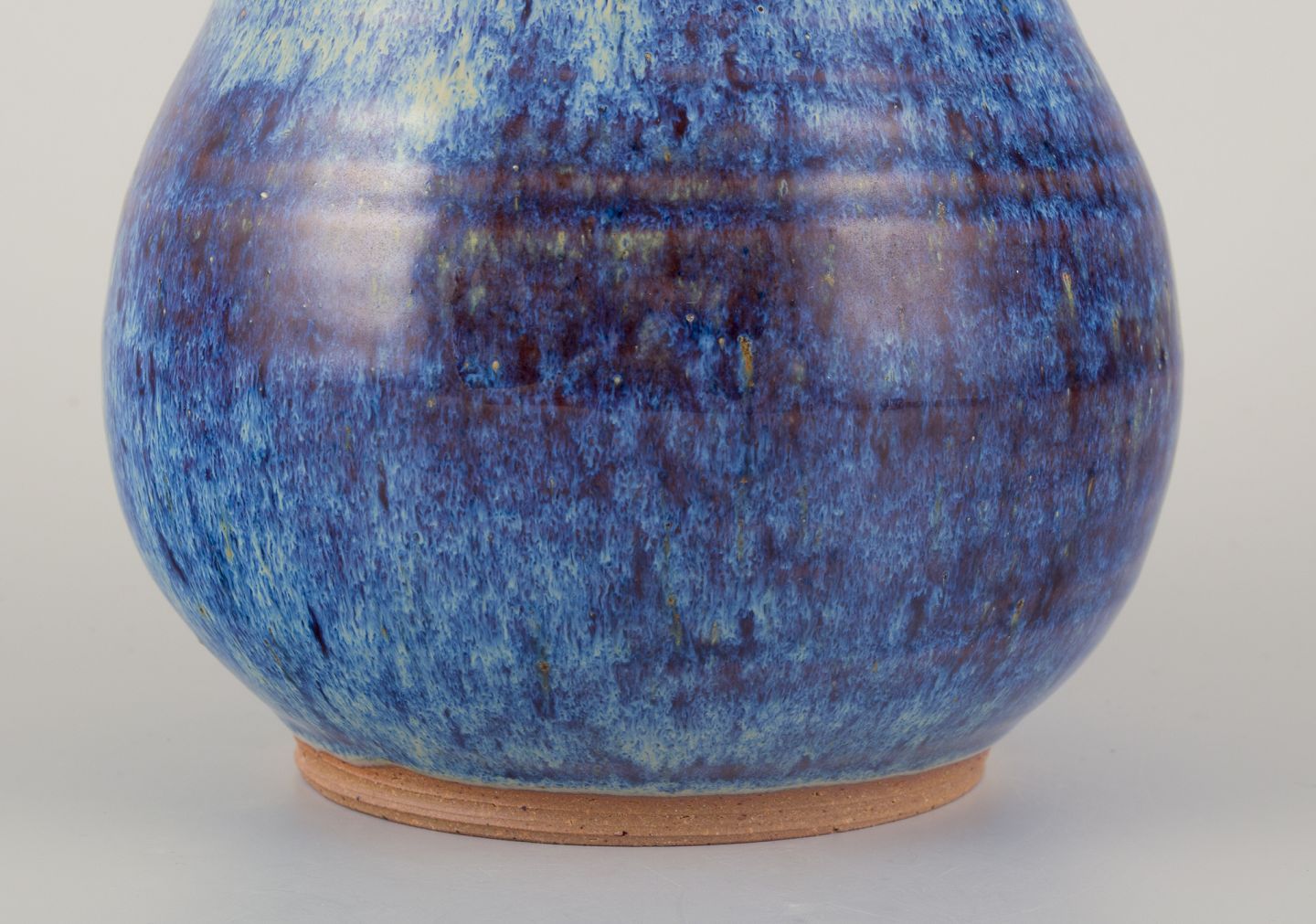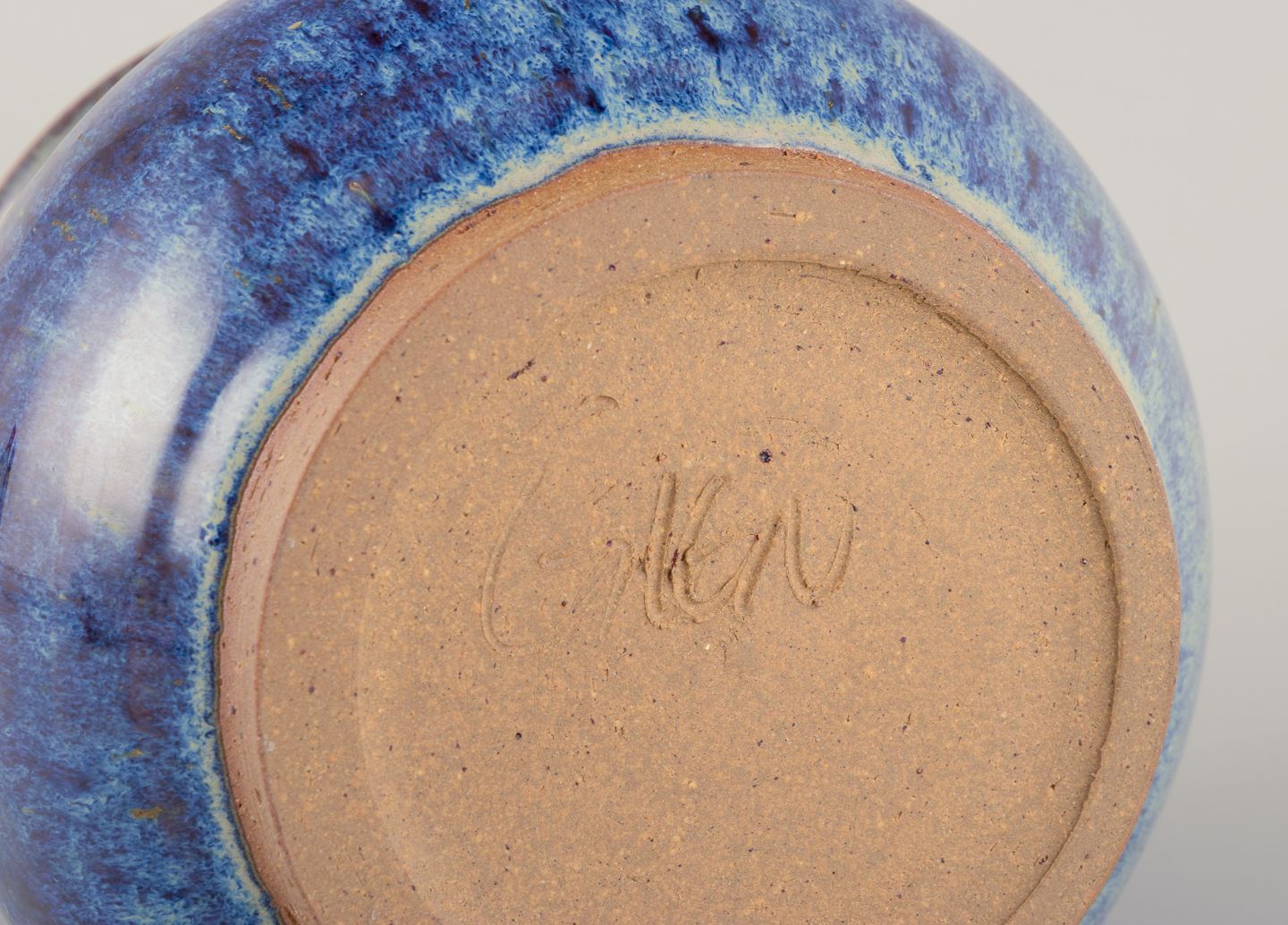 Svensk keramiker. Unika vase af keramik. Flydeglasur i blå toner. Uglaseret bund. Blank glasur. 1970/80’erne. Perfekt stand. Utydeligt signeret. Mål: H 13,0 cm. x D 12,0 cm.