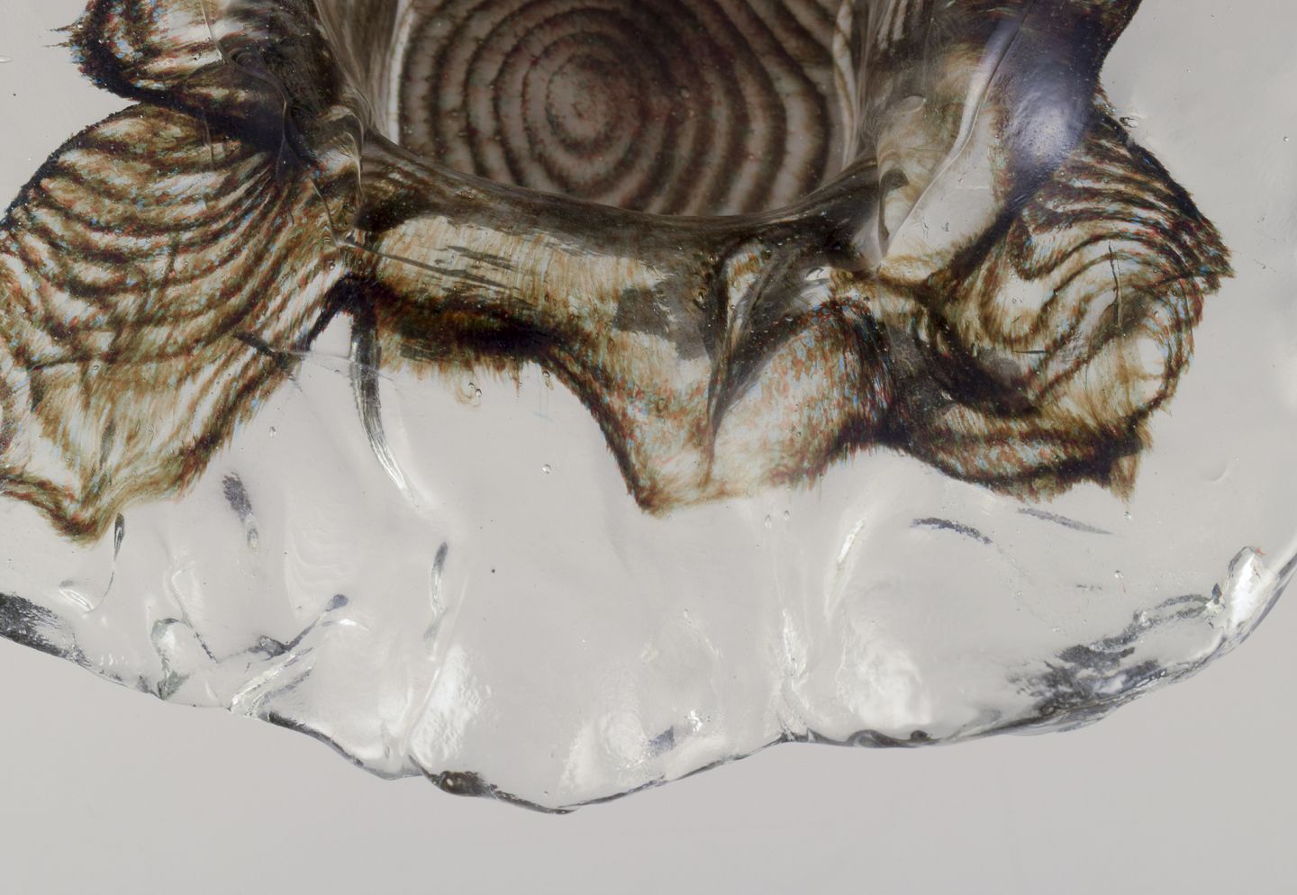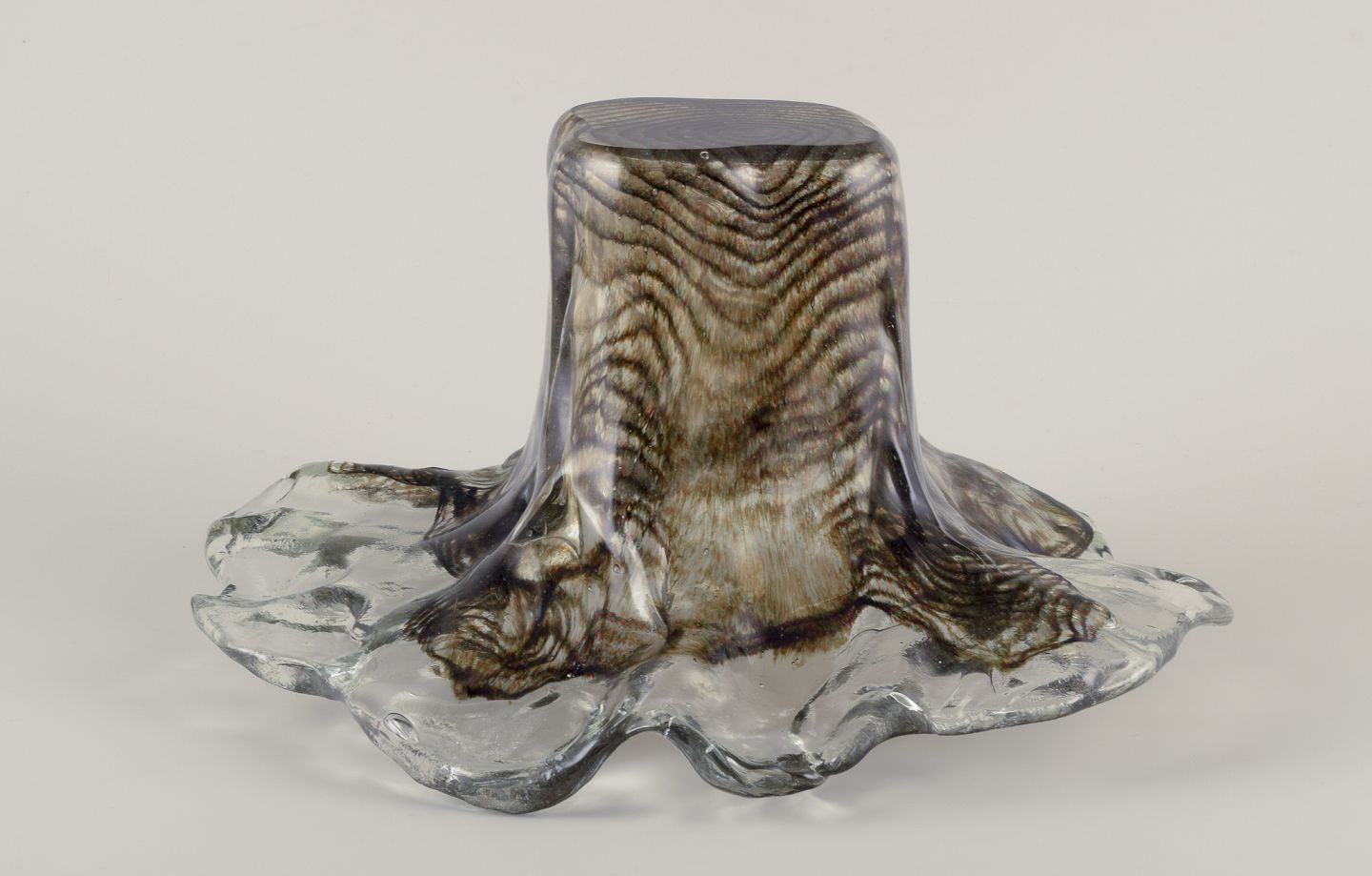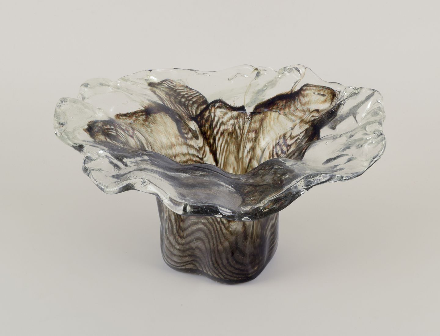 Organisk form. Abstrakt dekoration i brungrønne nuancer, klart glas.