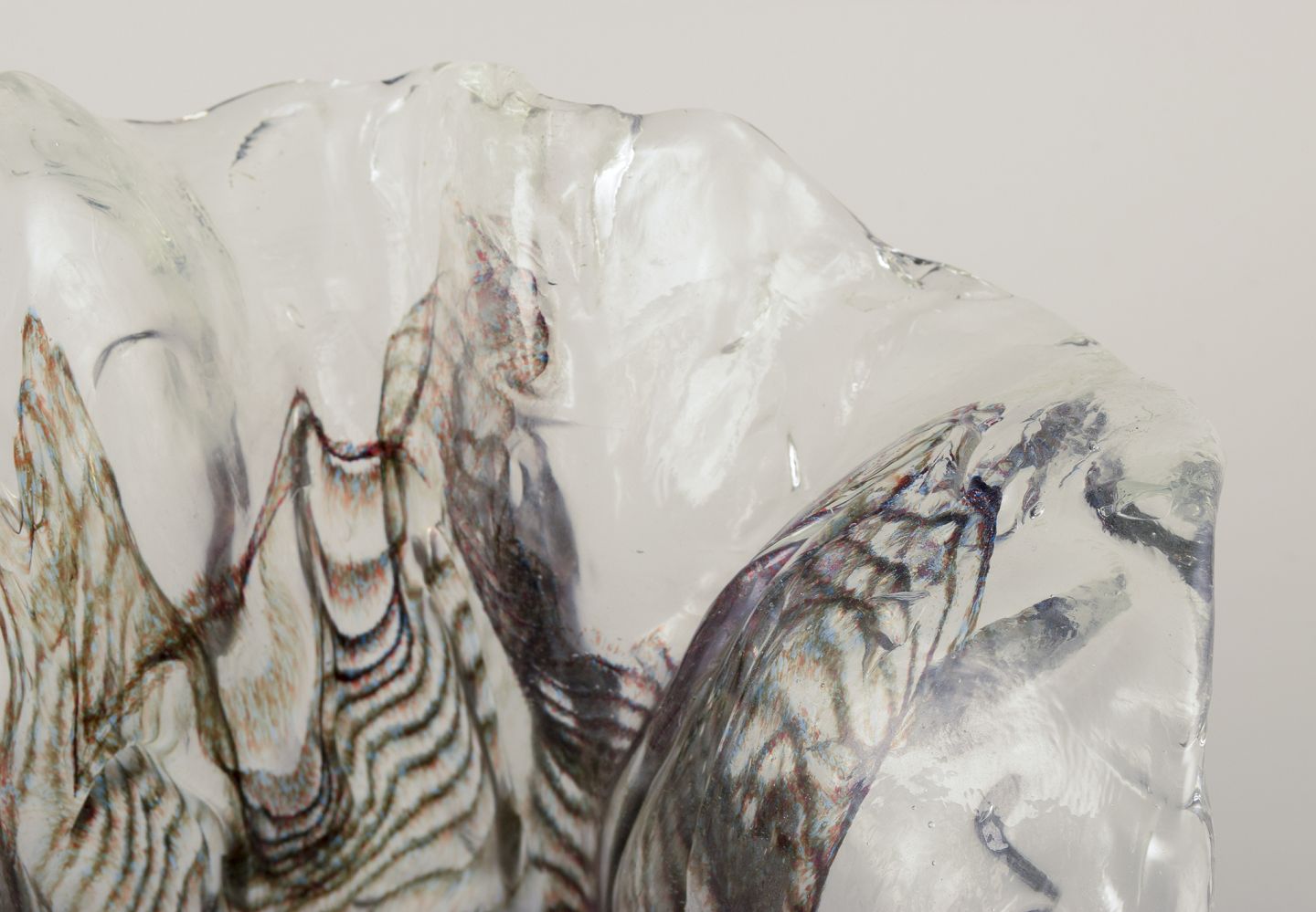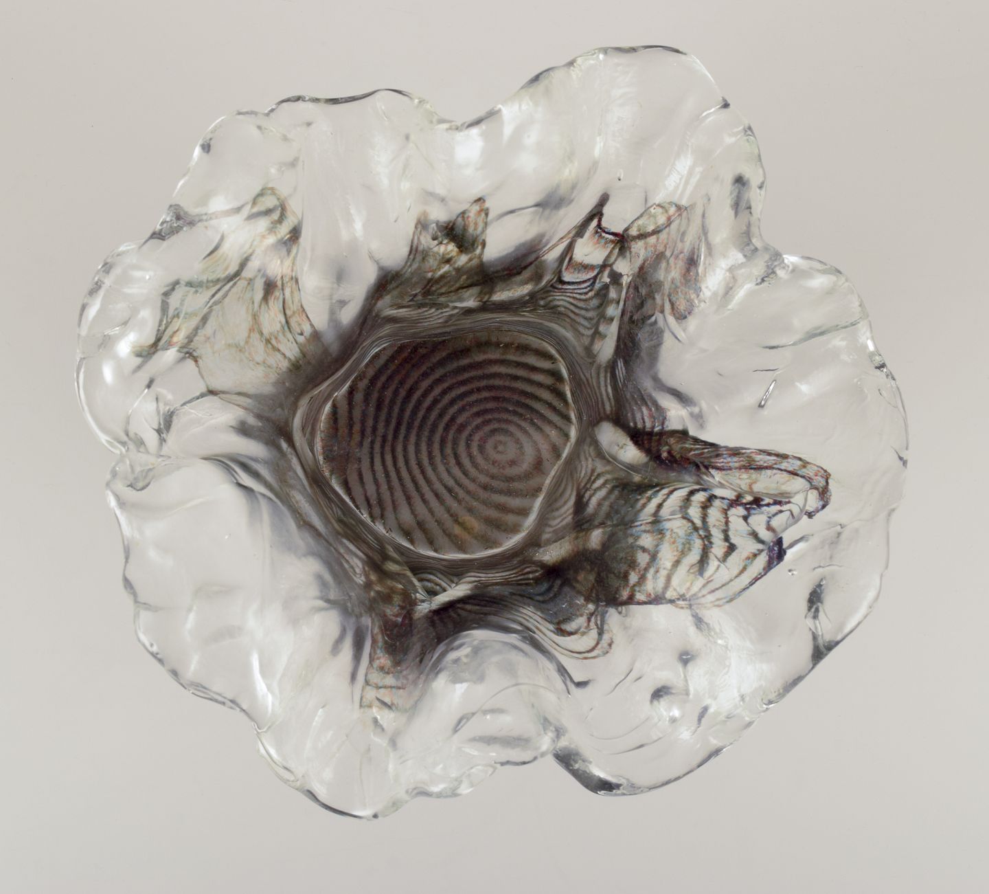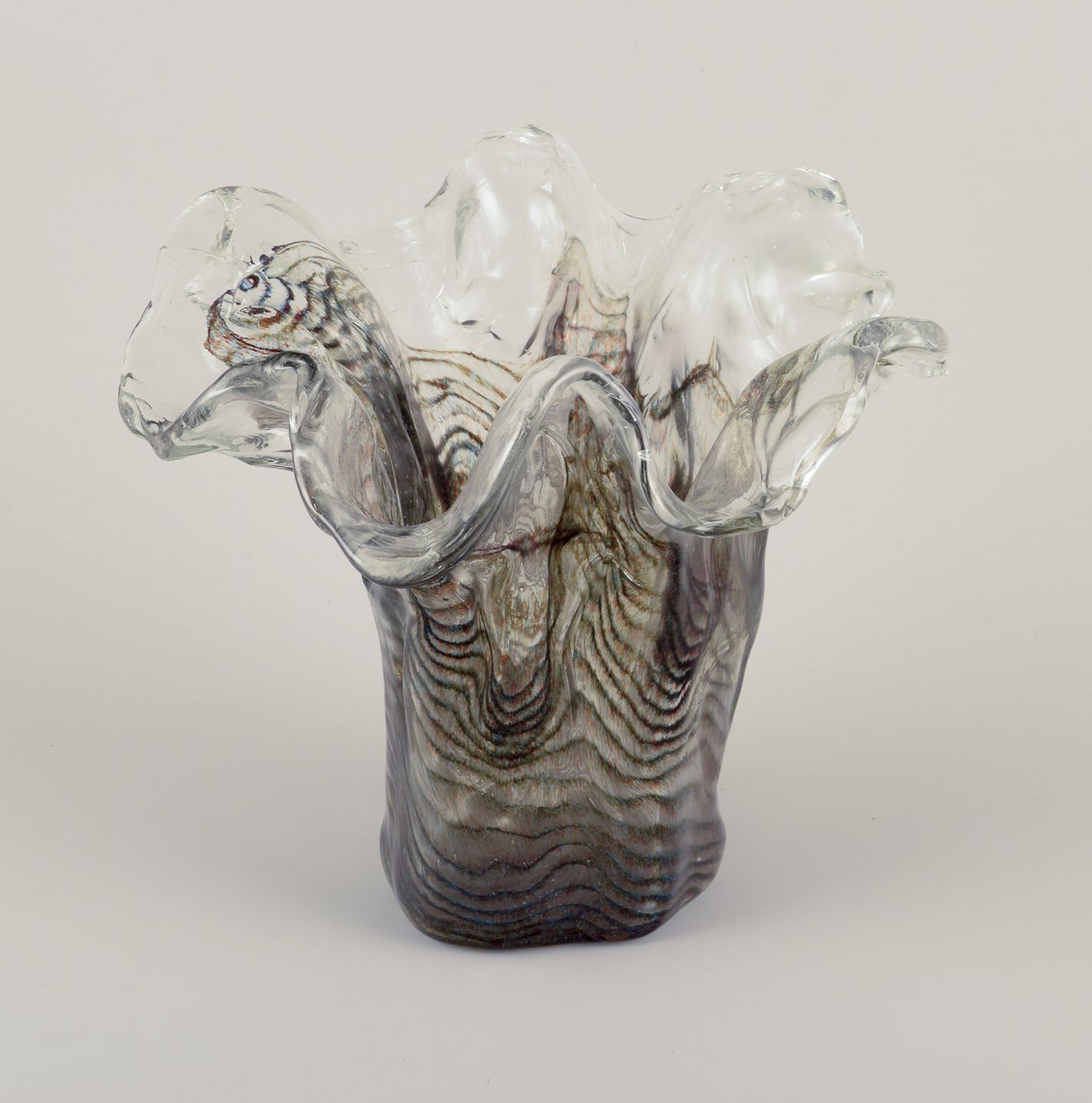 Organisk form. Abstrakt dekoration i brungrønne nuancer, klart glas.