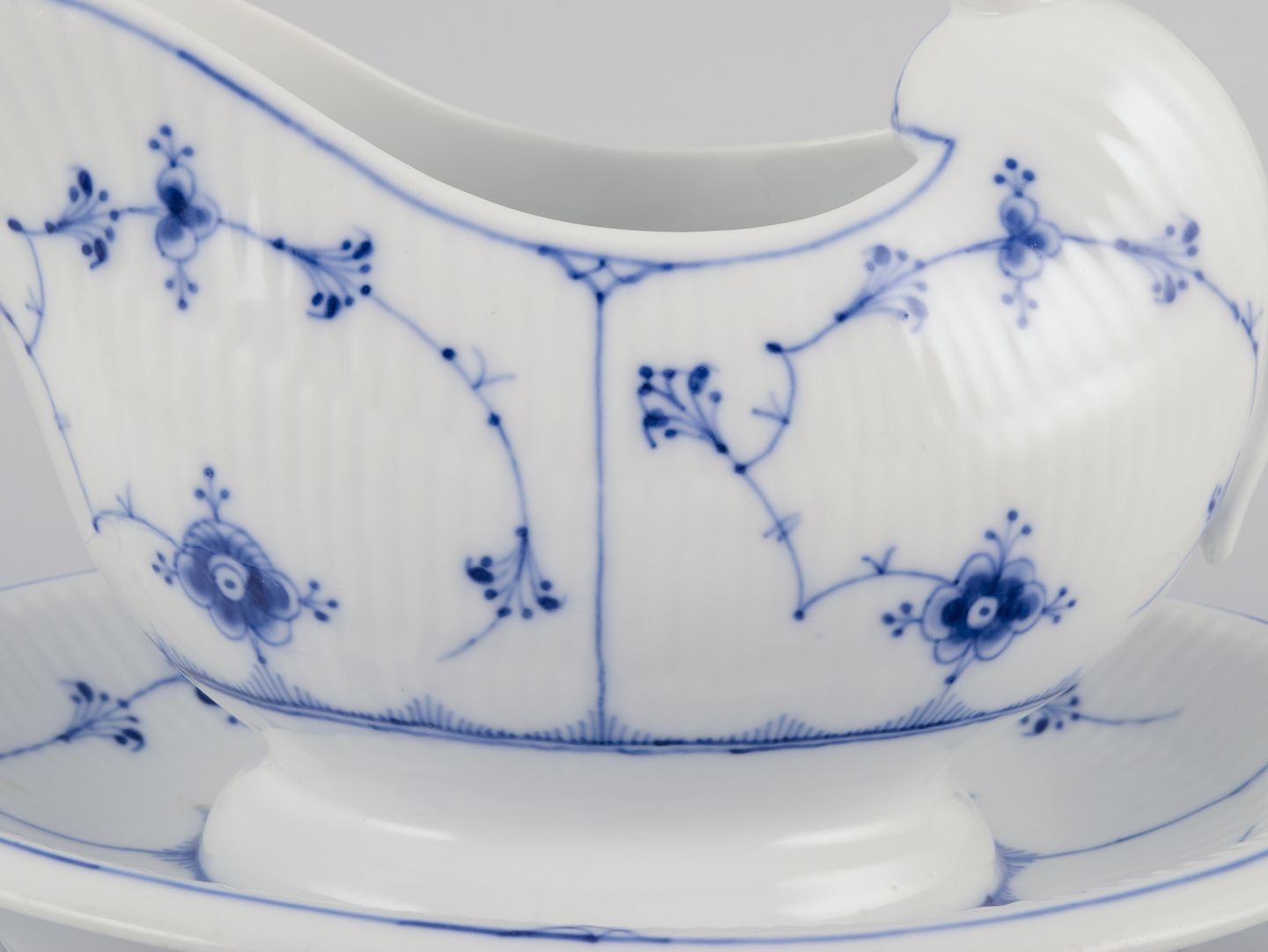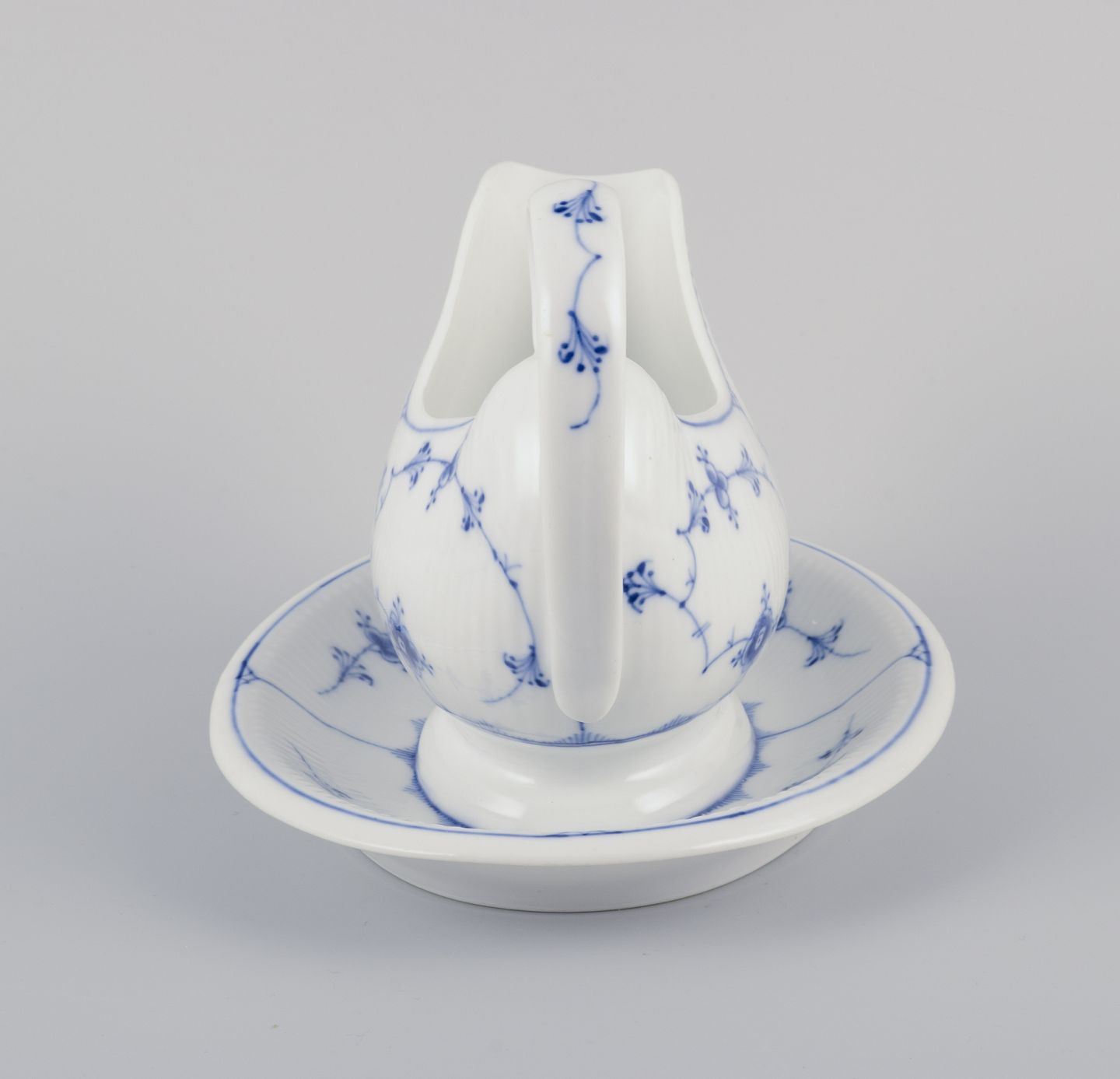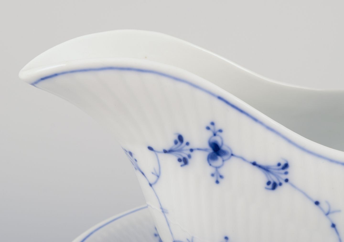 Musselmalet (also known as “Blue Fluted”) is a classic porcelain pattern from Royal Copenhagen, first introduced in 1775. Inspired by Asian porcelain, it is characterized by its blue hand-painted decorations on a white background. The pattern comes in several versions, including Full Lace, Half Lace, and Plain (Blue Fluted Plain). Musselmalet is an iconic symbol of Danish design and craftsmanship and remains popular and in production to this day.