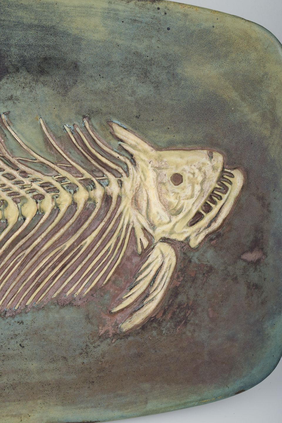 Kolossalt unika aflangt fad, motiv af fiskeskelet.