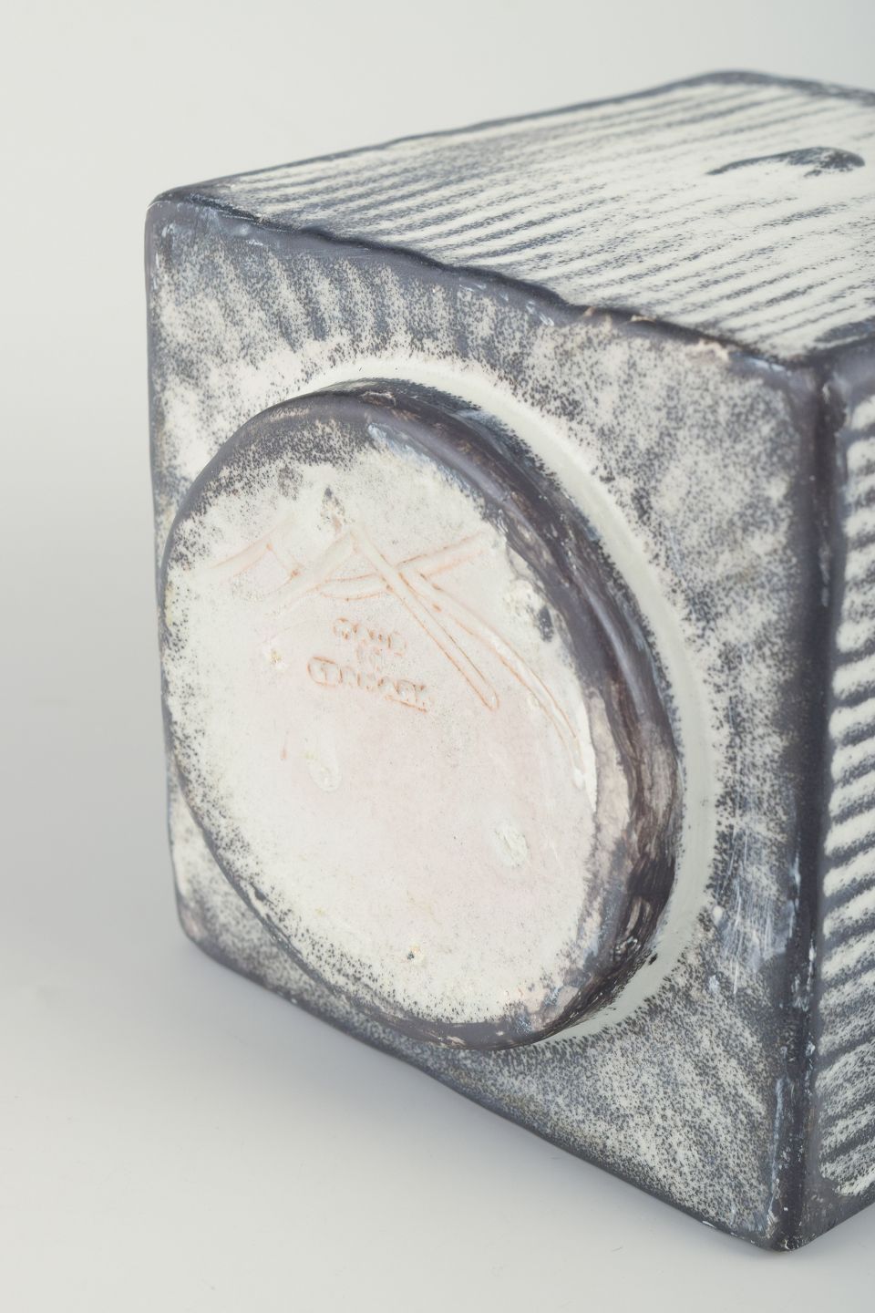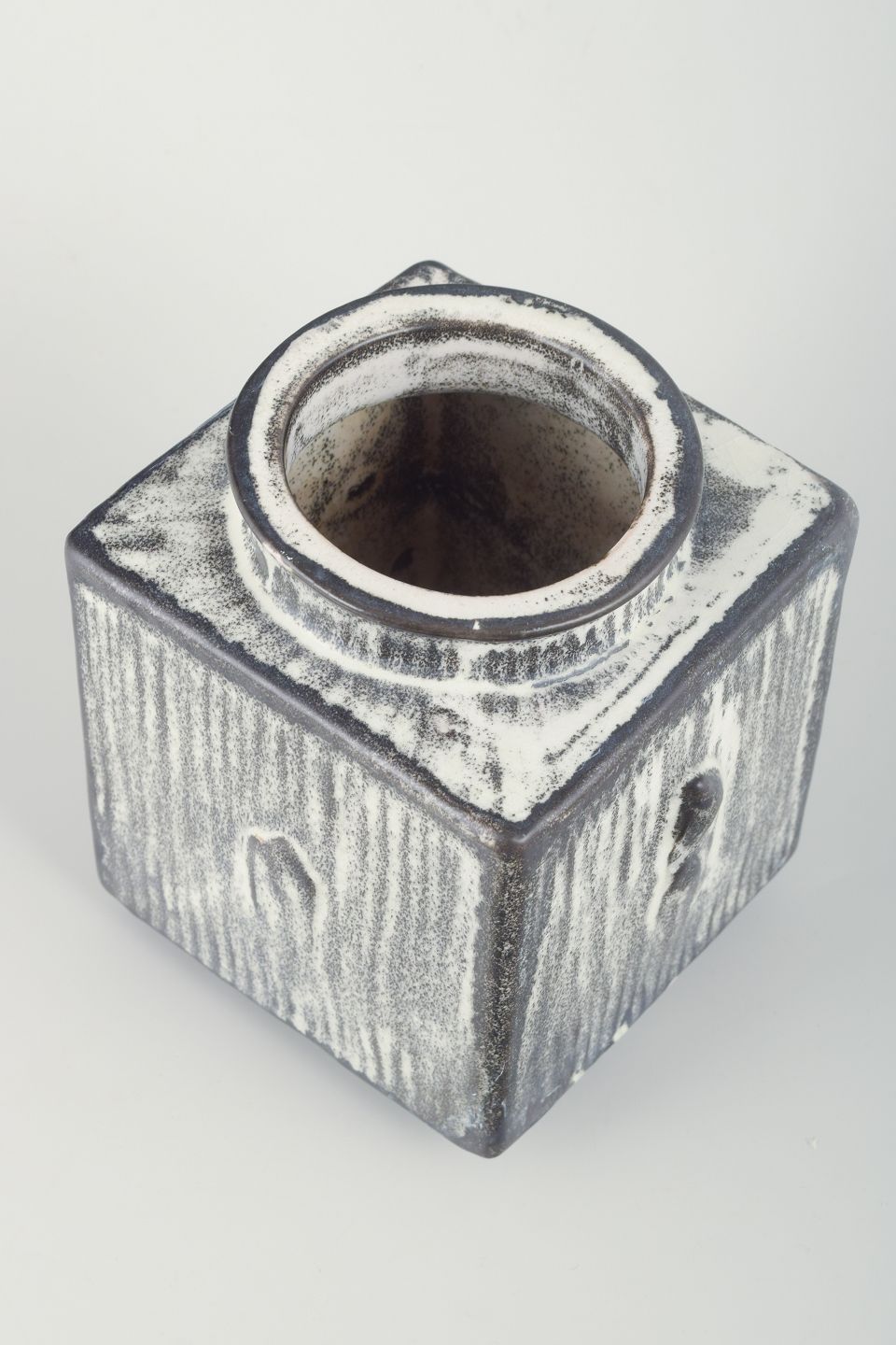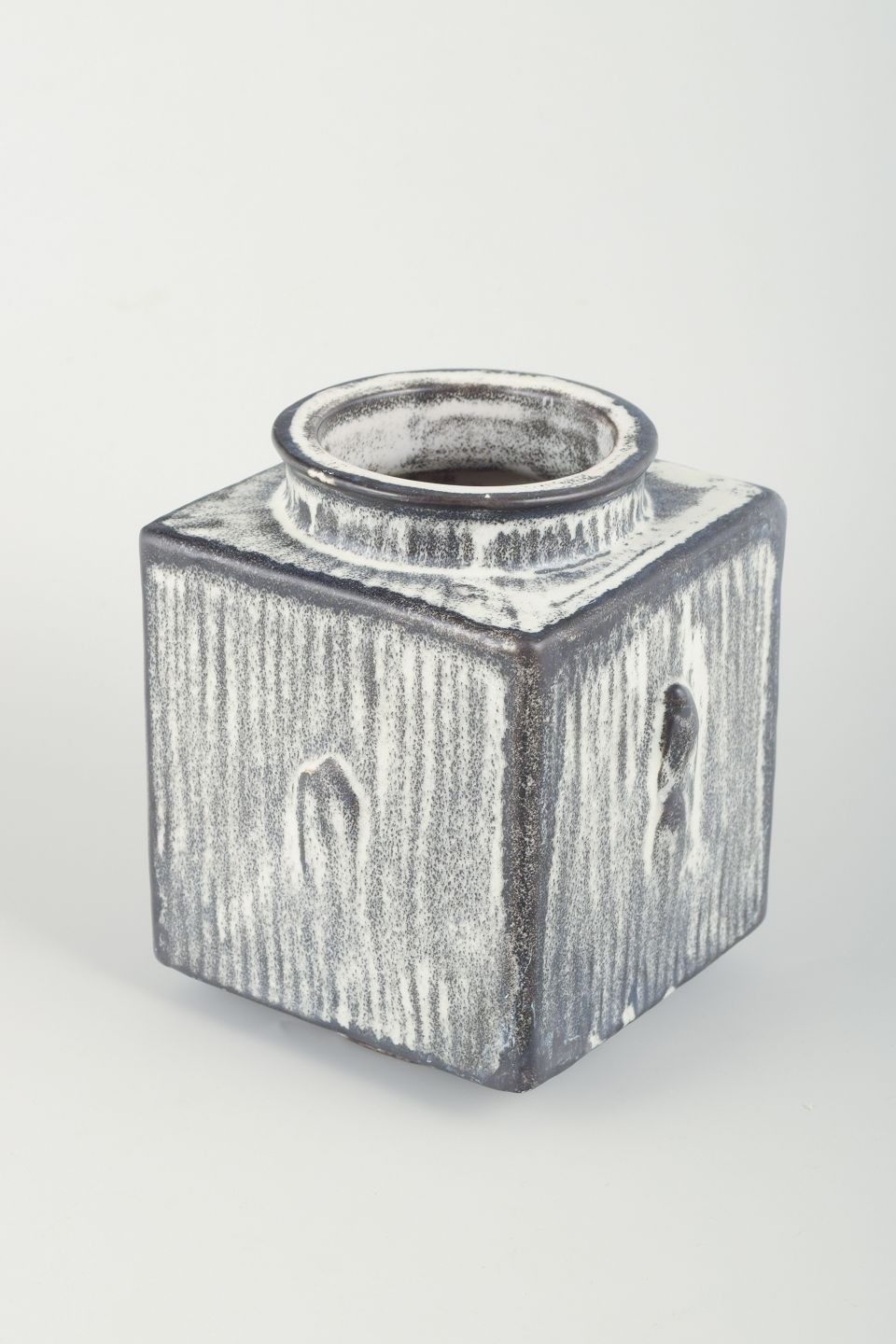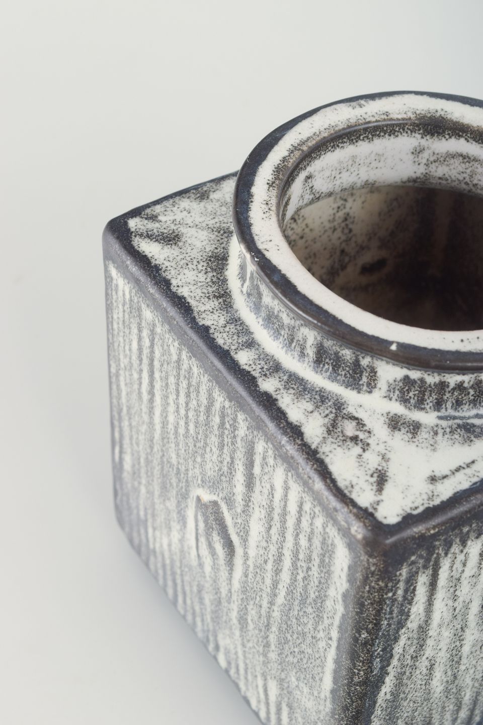 Firkantet vase i glaseret keramik. Sortgrå dobbeltglasur.