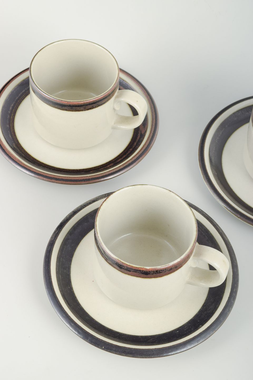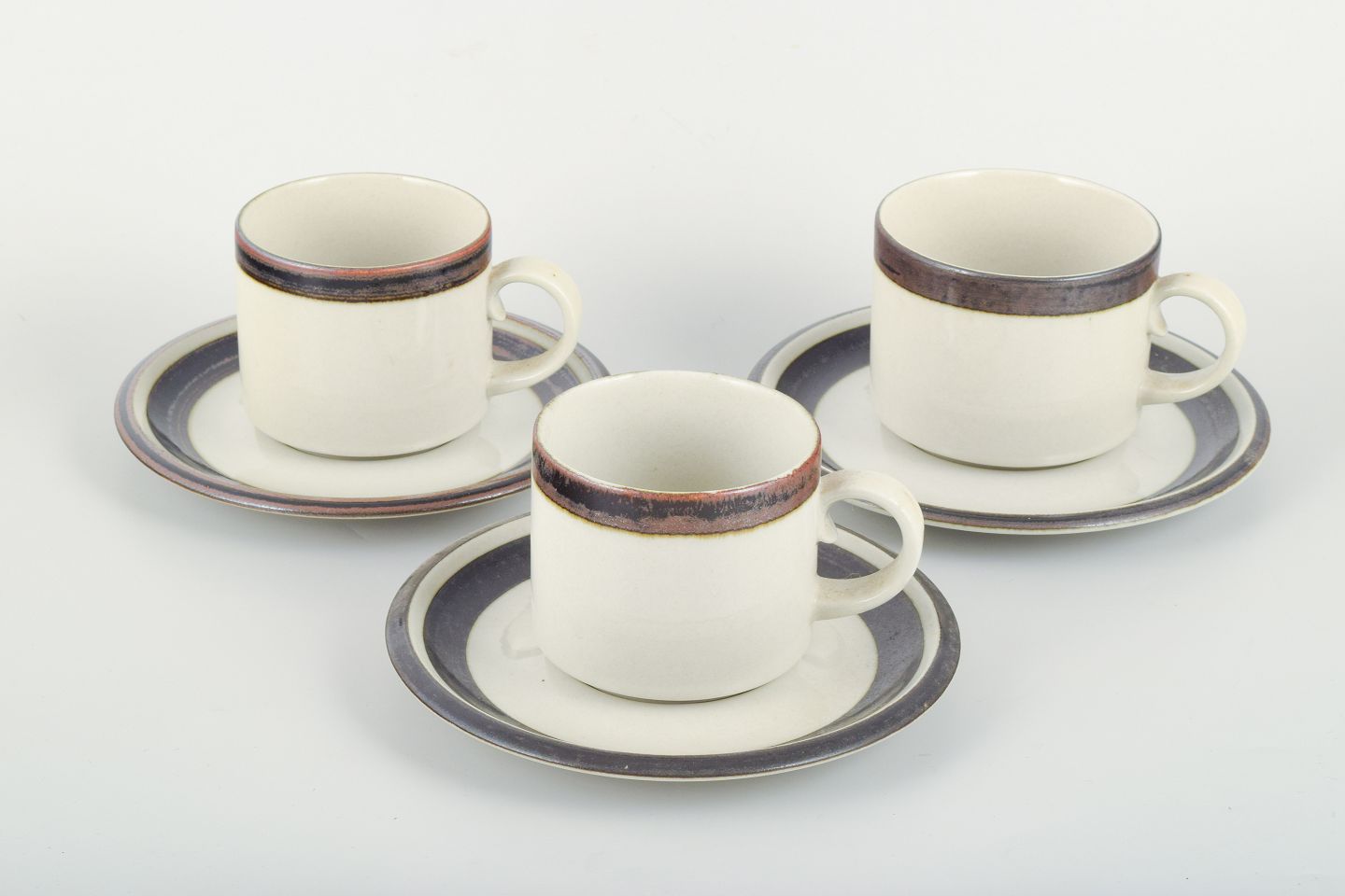 Arabia, tre "Karelia" kaffekopper med tilhørende underkopper i keramik. En stor kop og to mindre kopper.
