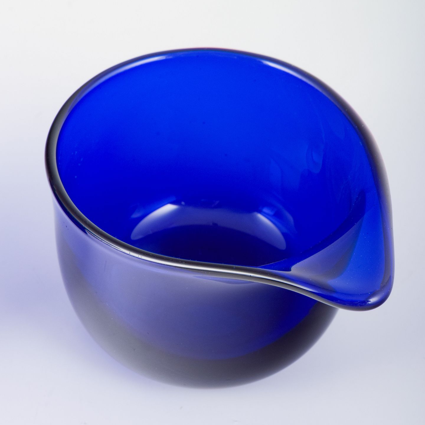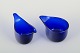 To små kander i koboltblåt glas fra Holmegaards serie Vipstjert, designet af Per Lütken, begge med karakteristisk hældetud og organisk form.
