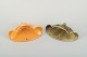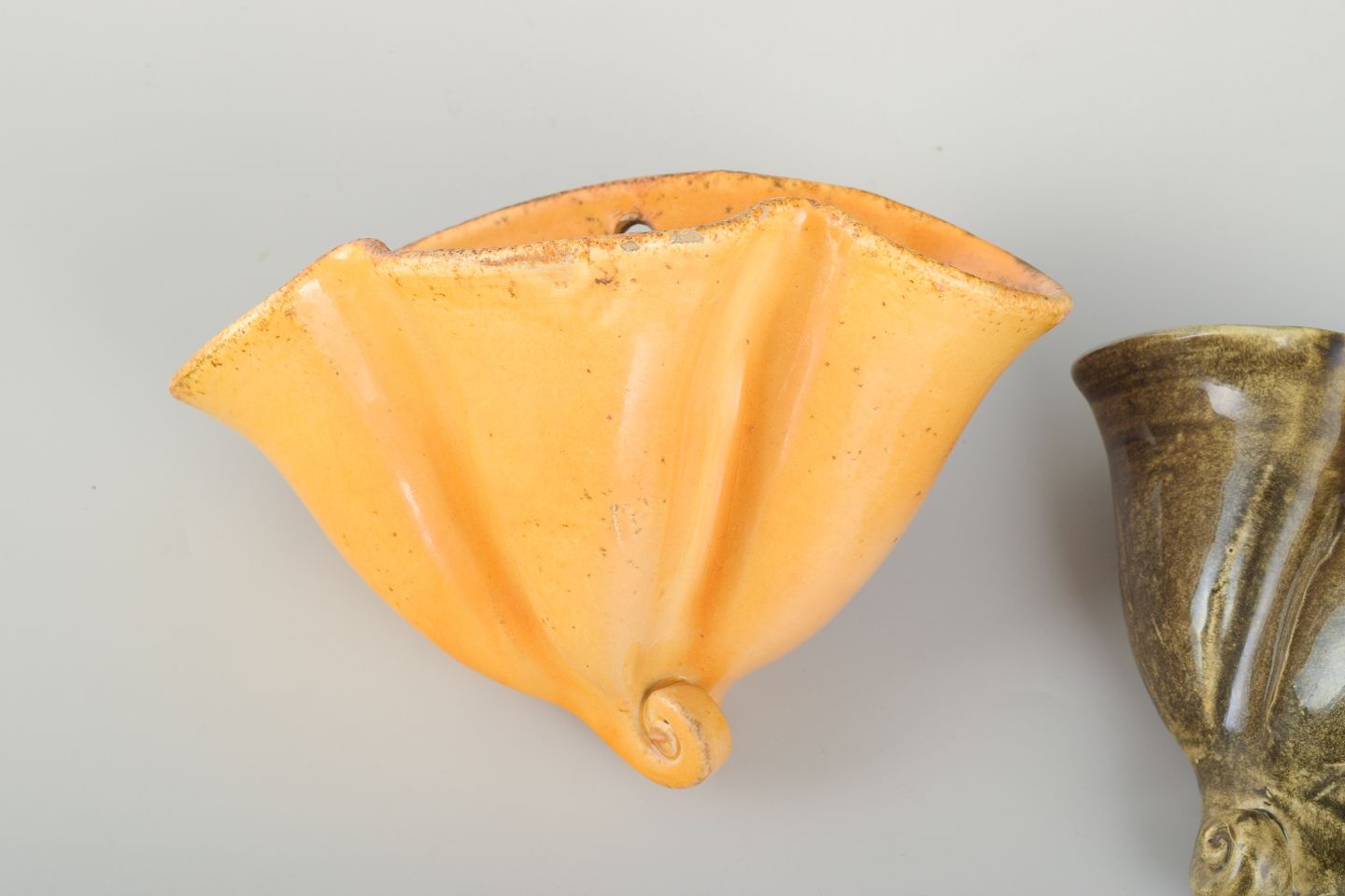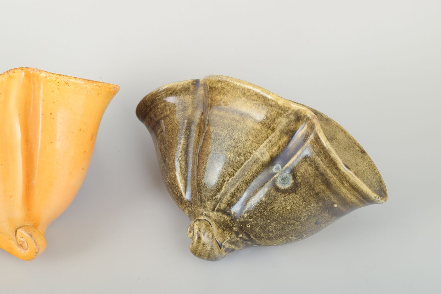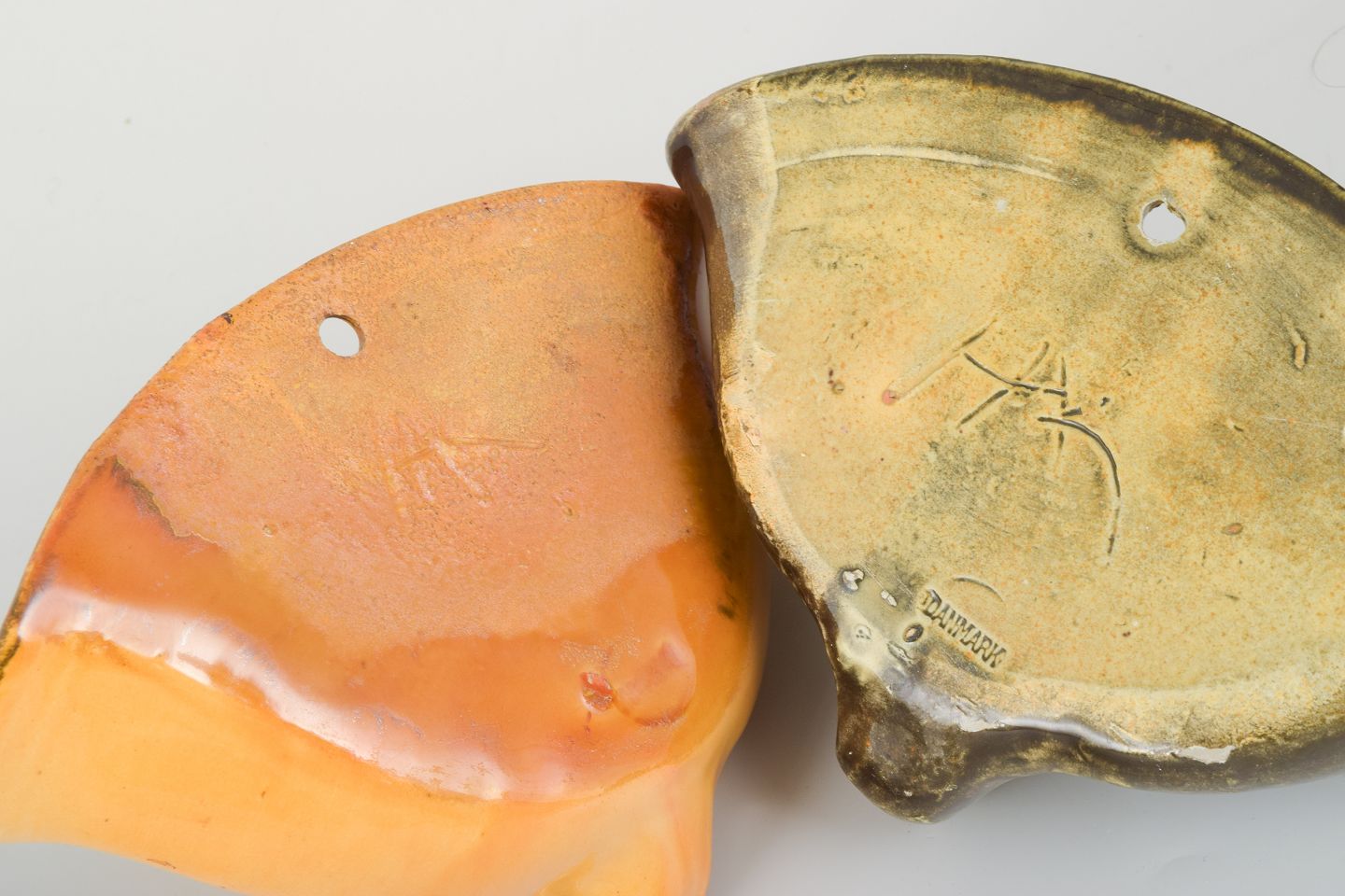 To Kähler keramikvægvaser formet som muslingeskaller, én i orange uranglasur og én i olivengrøn uranglasur.