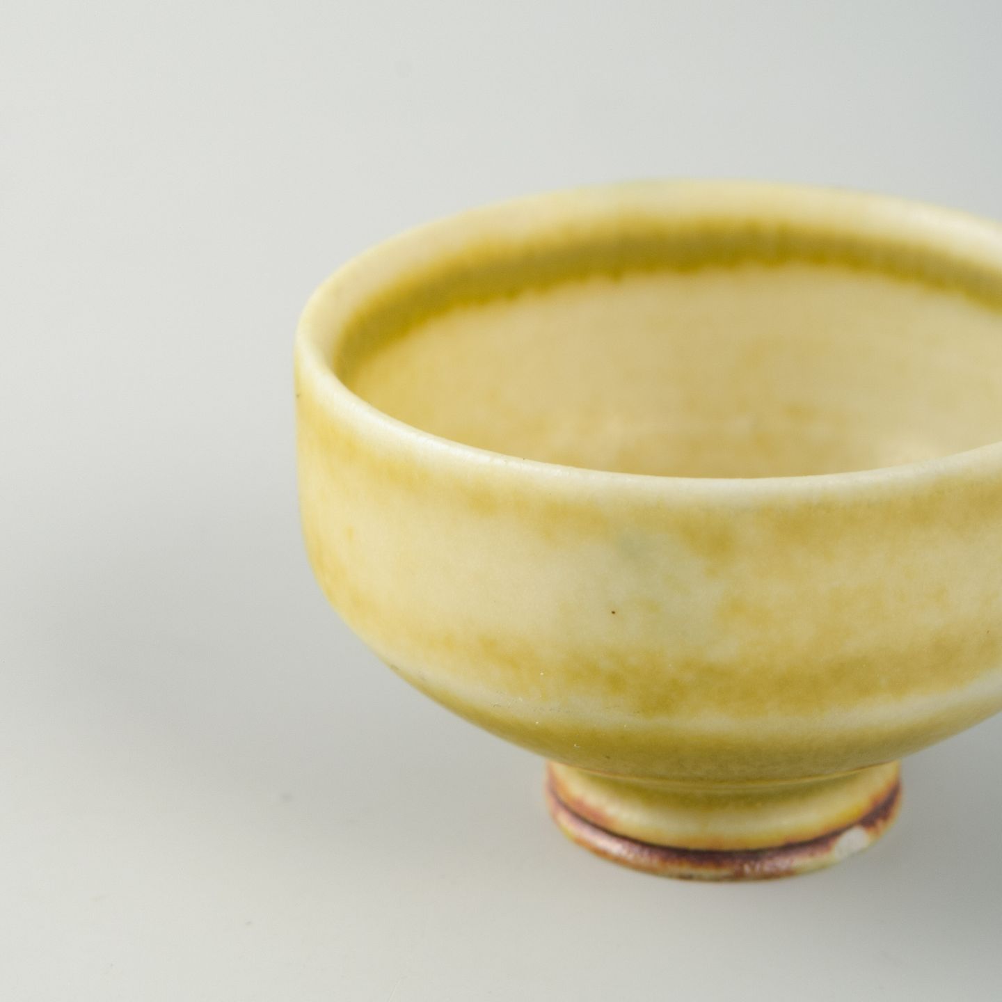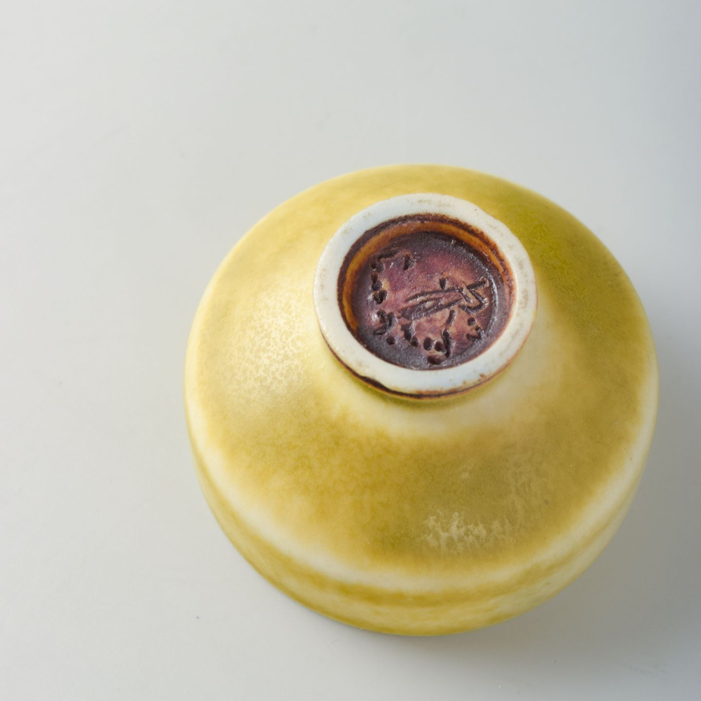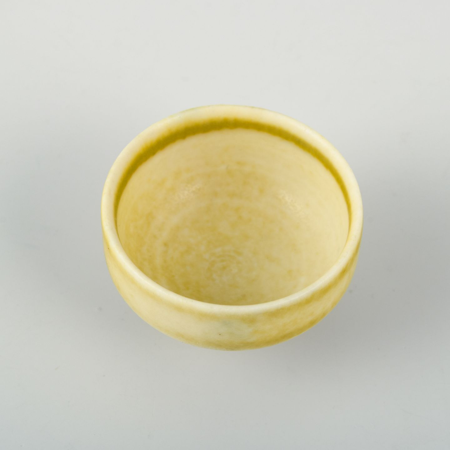 Berndt Friberg for Gustavsberg miniature. Studiofremstillet miniaturevase i stentøj med lys gul glasur og blød, levende overflade.