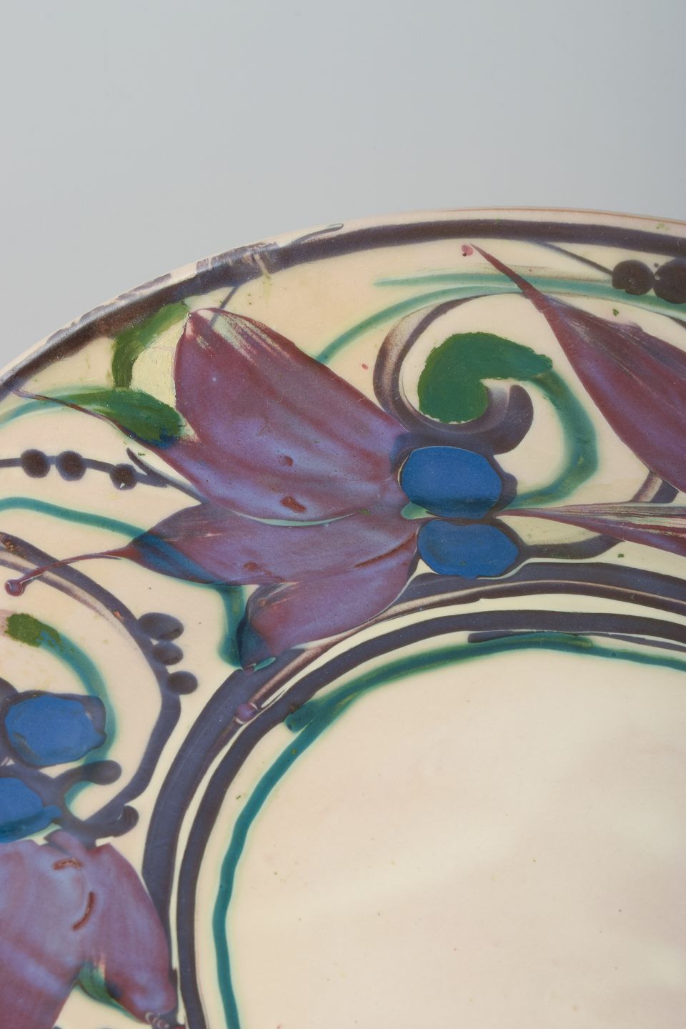 Meget stort, håndmalet fad fra Kähler, udført i 1930’erne. Dekoreret i klare, dybe farver med blå bær, violette blade og grønne slyngende ranker på lys bund. Langs randen ses en dekorativ borte, typisk for Kählers keramik fra perioden.